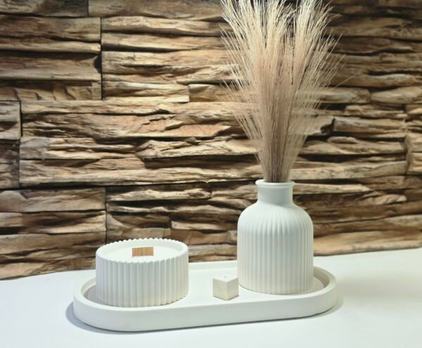 Rankų darbo detalės interjerui: padėklas, vaza, smlkalinė ir žvakidė. Padėklas saugos baldus nuo smūgių, drėgmės, karščio. Į vazą geriausia merkti kvapnias lazdeles, sausus, džiovintus, dekoratyvinius augalus ir į ją nerekomenduojama pilti vandens. Žvakei naudojamas ekologiškas sojų vaškas be jokių kitų priedų, todėl yra nekenksmingas. Sudegus žvakei indelis bus naudingas susidėti malonias smulkmenas.