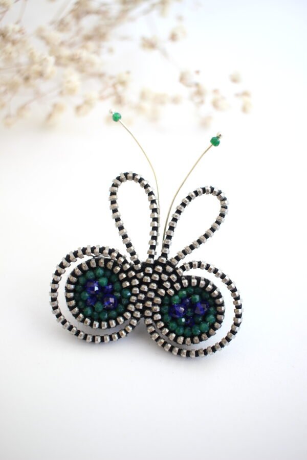 Rankų darbo segė – drugelis, pagamintas iš sidabrinės spalvos užtrauktuko, čekiško Preciosa ir kiniško biserio ir kitų detalių. Sagė atvaizduoja drugelio formą, tačiau kūrybiškumo dėka jis tampa stilingu, žaismingu, elegantišku aksesuaru. Tokia žaisminga segė puoš švarką, paltą, palaidinę ar skarelę – jis gali nutūpti bet kur. Tai – rankų darbo kūrinys, kurio gimimui reikia nemažai laiko, kruopštumo, pastangų bei daug meilės.