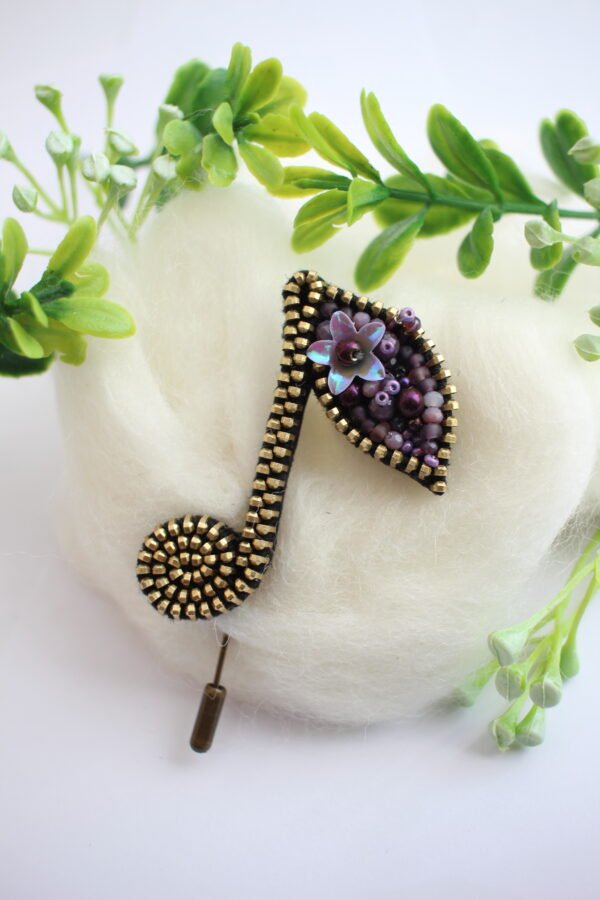 Rankų darbo segė muzikos mylėtojams, gerbėjams, kūrėjams, padedanti suskambėti švarkui, paltui, šaliui ar skarelei ir kt. Ši įsmeigiama sagė pagaminta iš iš auksinės spalvos užtrauktuko, dekoruotas čekišku Preciosa ir kinišku biseriu, natūraliais akmenėliais, įvairių atspalvių karoliukais ir kitomis smulkiomis detalėmis. Tai – rankų darbo kūrinys, kurio gimimui reikia nemažai laiko, kruopštumo, pastangų bei daug meilės.