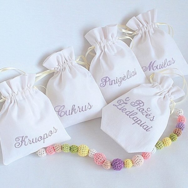 Krikštynų maišelių rinkinys padeda išsaugoti senąsias krikšto tradicijas ir suteikia šventei dar daugiau jaukumo bei elegancijos. Rinkinį sudaro maišelis krikšto žvakei ir penki krikšto maišeliai su siuvinėtais užrašais: Kruopos, Cukrus, Pinigėliai, Muilas, Rožės žiedlapiai. Šie simboliniai elementai nuo seno naudojami per Krikštynas – jie linki vaikui gausos, saldaus gyvenimo, klestėjimo, švaros ir grožio.