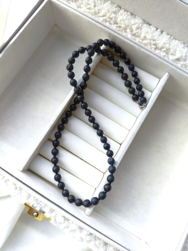 10 mm lavos akmenukai, kurie yra grubūs, gyvi, tarsi neapdorota energija, suteikia papuošalui struktūrą. Tarp jų įsiliejantis 8 mm oniksas – gilus, lyg naktis be triukšmo. O čekiško stiklo intarpai subtiliai pagauna šviesą, vos pastebimai ją sujudindami, lyg mintį, kuri ateina netikėtai.