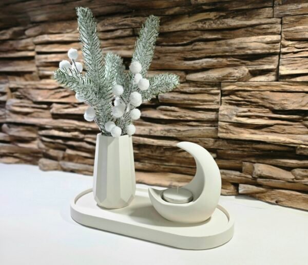 DYDIS: padėklas – 24×12 cm; vaza –10.5×6 cm; mėnulis – 10×9 cm.