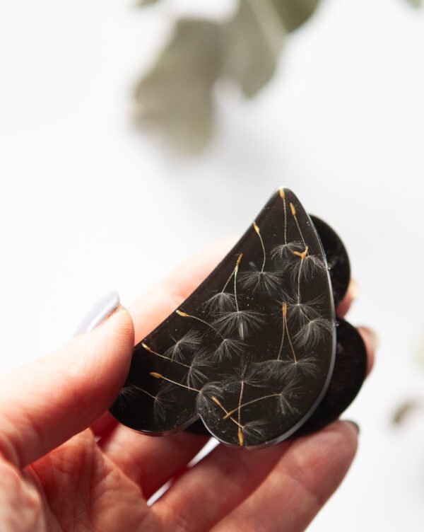 Šie originalūs rankų darbo segtukai plaukams gaminami iš juvelyrinės dervos, yra itin lengvi, nedūžtantys. Ir unikalūs, nes papuošalų gamybai naudojami tik natūralūs augalai: gėlių žiedai, lapeliai, uogos ir kitokios augalų dalelės.