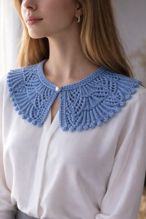 Lino gijos natūralus šiurkštumas susilieja su medvilnės švelnumu, o šviesoje lengvai sužibanti tekstūra primena rasos paliestą audinį. Japoniška mezgimo technika sukurtas ažūrinis raštas alsuoja lengvumu ir trapumu – jis gražiausiai atsiskleidžia ant kitos spalvos drabužio, lyg piešinys, gimstantis iš šviesos ir šešėlio.Tokia apykaklė yra ypatingas aksesuaras, kuriantis elegantišką, moterišką ir nepakartojamai švelnią aprangos nuotaiką.Tai ne tik aksesuaras, bet ir mažas rankų darbo pasakojimas apie lėtą kūrybą, subtilų grožį ir nepakartojamą moterišką eleganciją.Galima bet kokia kita spalva, kurią pasirinkite iš siūlų variantų nuotraukoje. Pirkimo metu pastabose įrašykite pasirinktą spalvą.