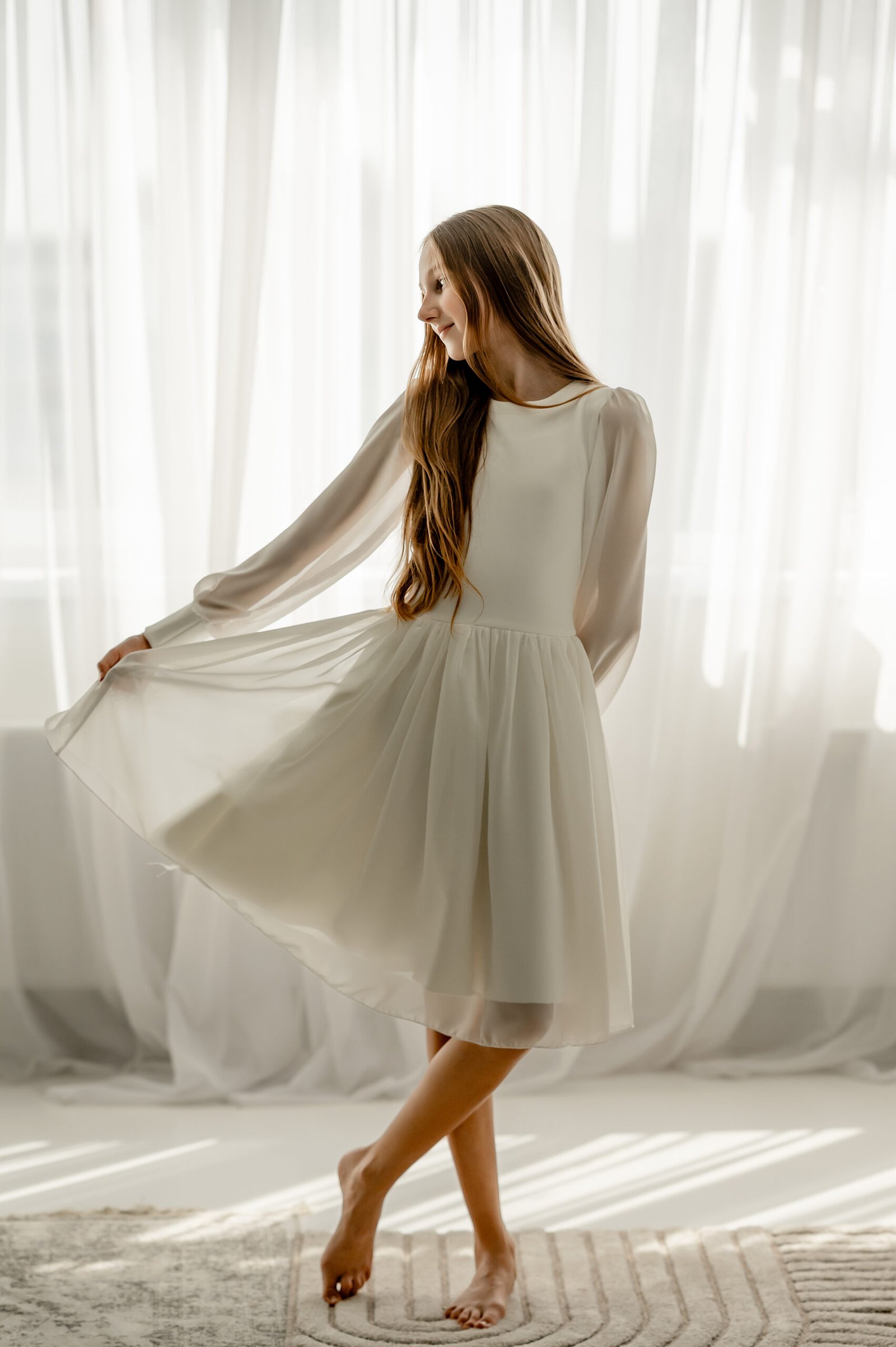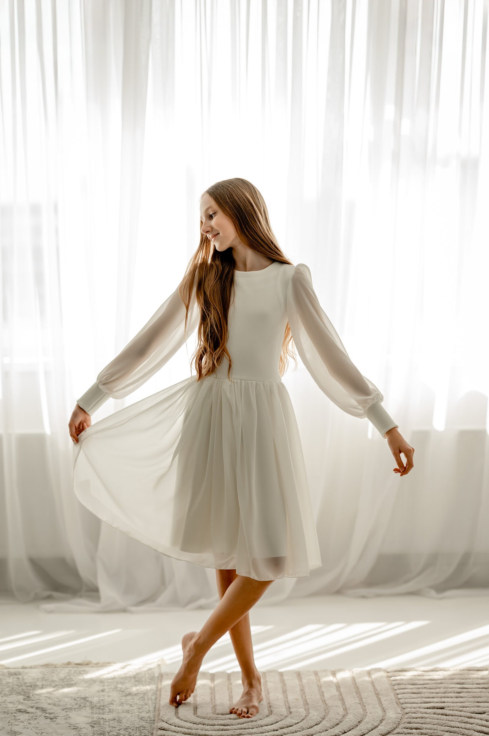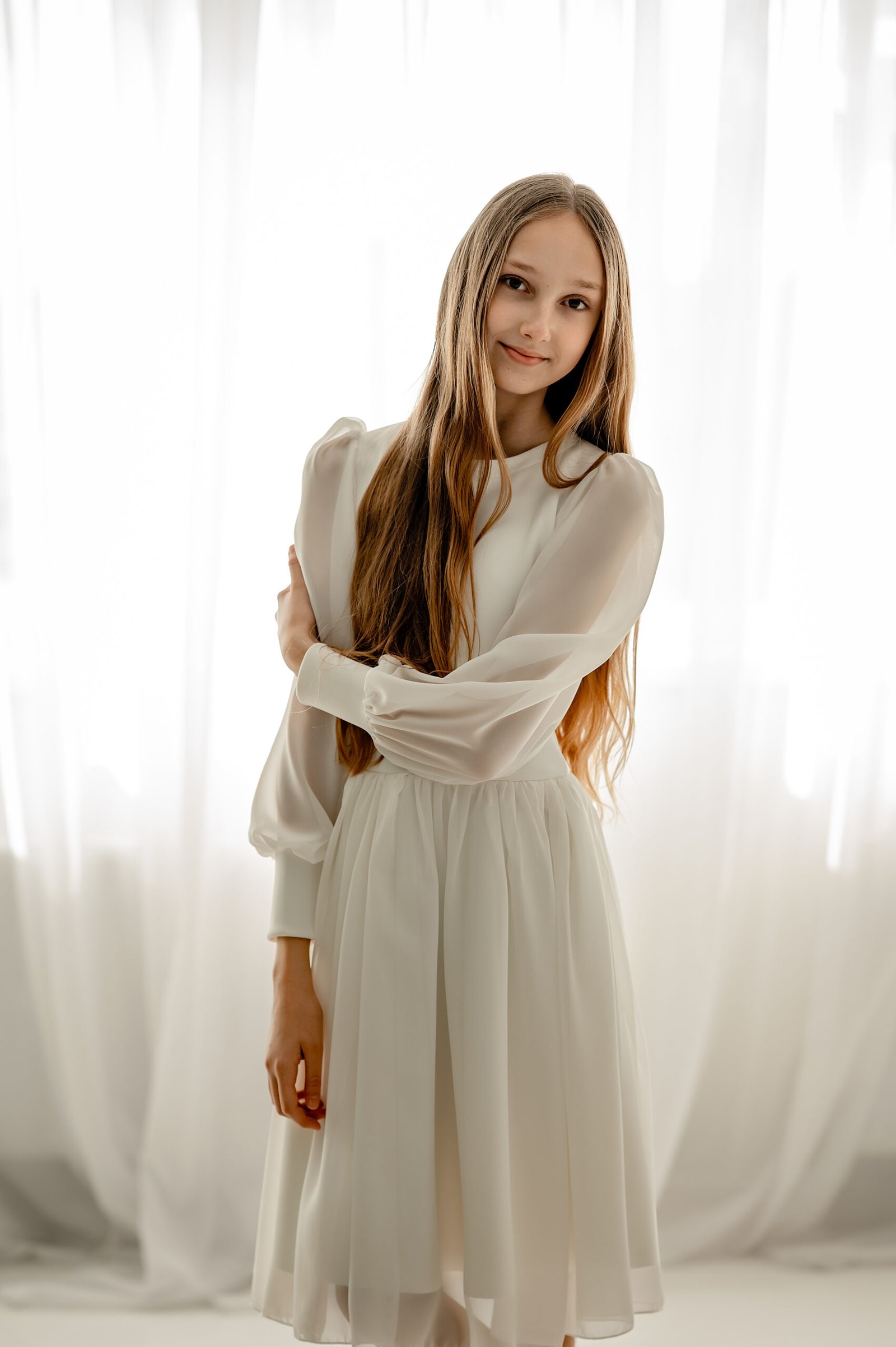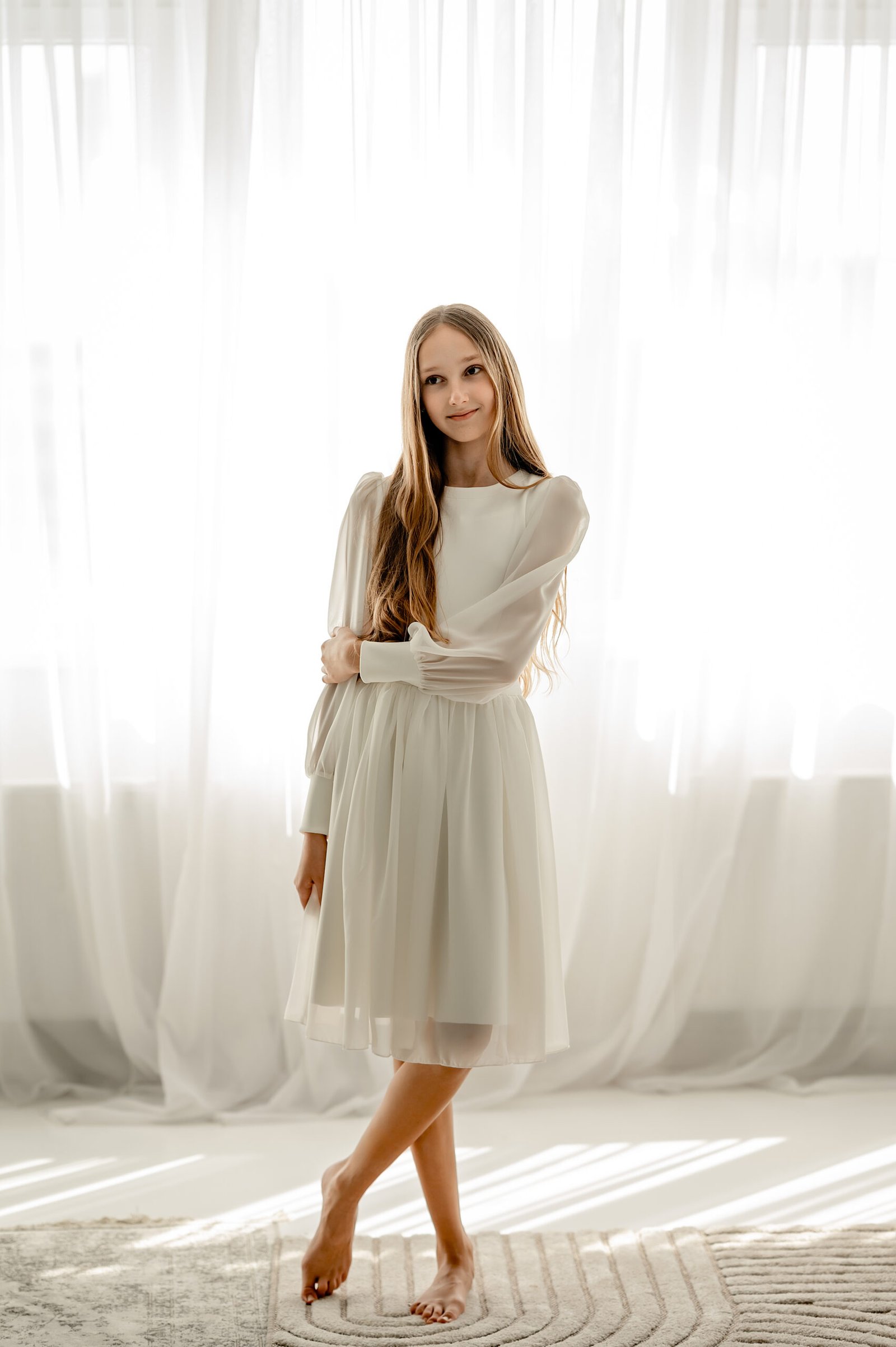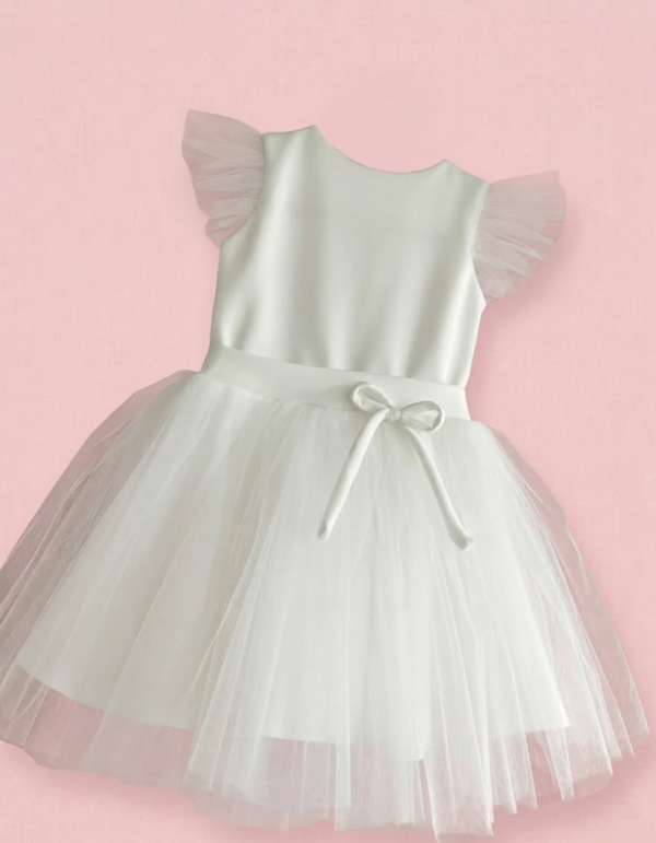 Balta suknelė su lengvai pūstomis rankovėmis yra puikus pasirinkimas Pirmosios komunijos, Sutvirinimo sakramento šventėms, Krikštynoms, gimtadieniams, vestuvėms, kitoms ypatingoms progoms.