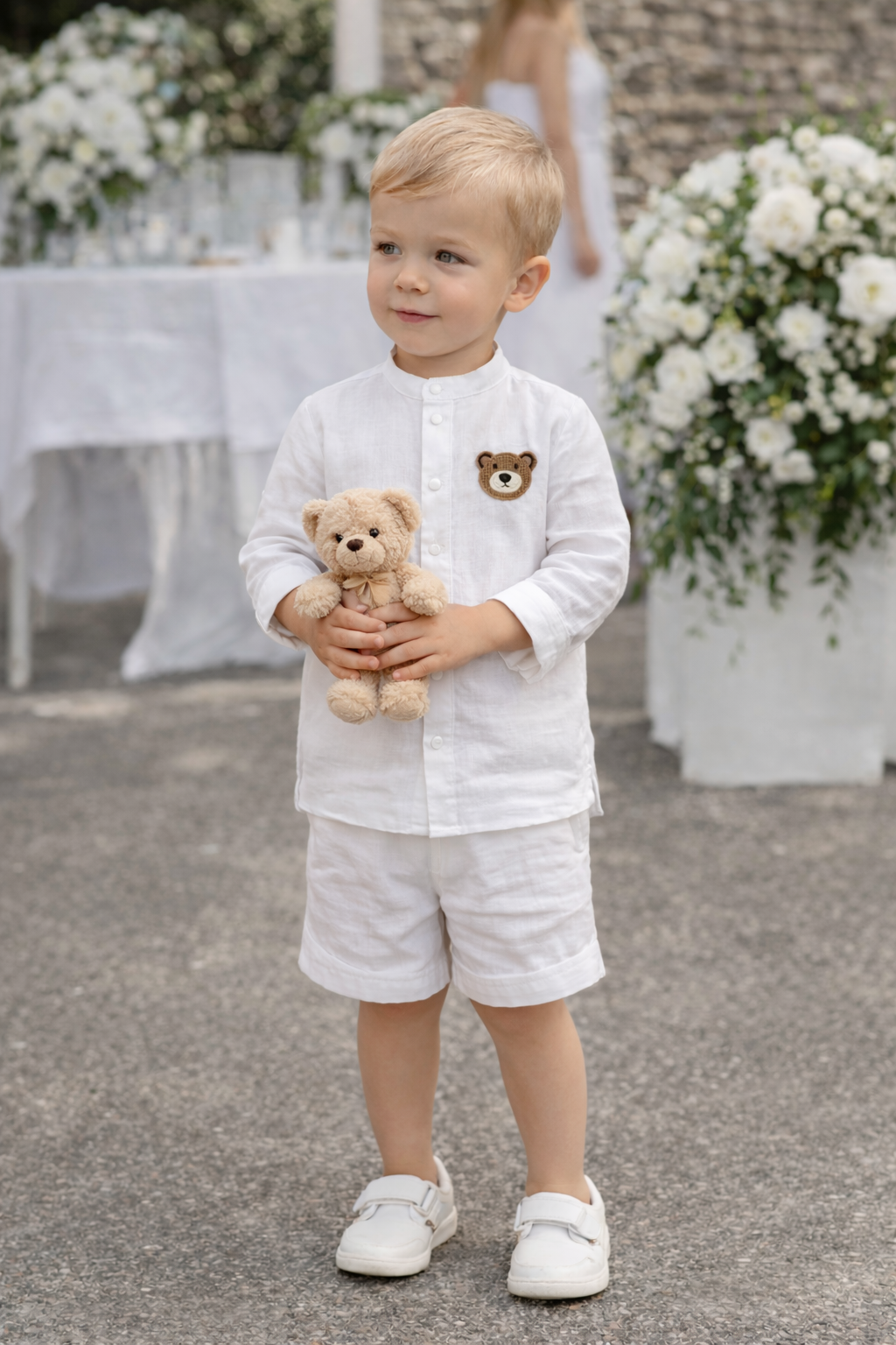 Natūralaus lino kostiumėlis berniukui, kurį sudaro balti šortai ir balti marškiniai, puošti meškučiu. Šventinė apranga Krikštynoms ar bet kokiai vasariškai šventei!