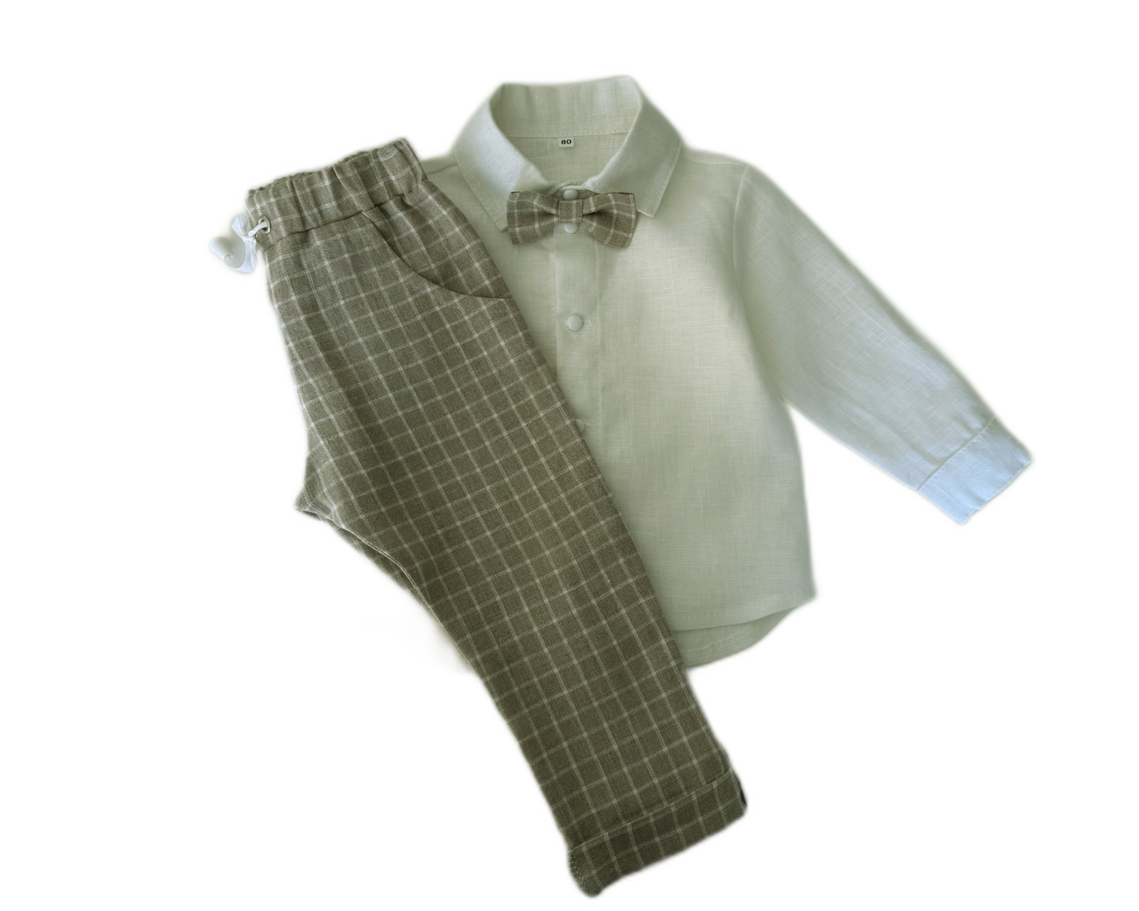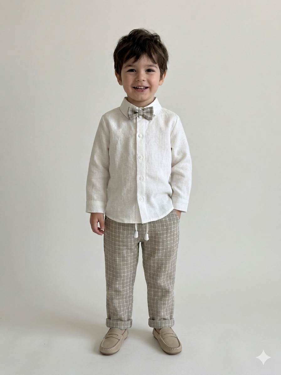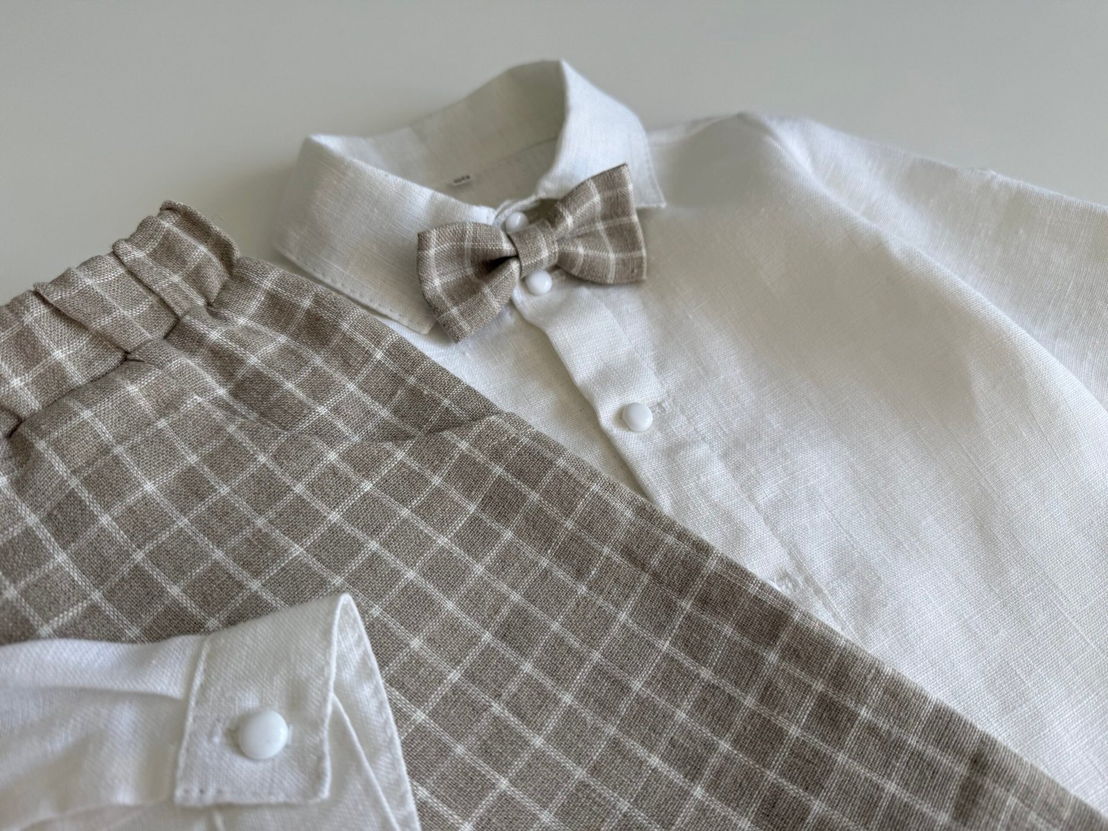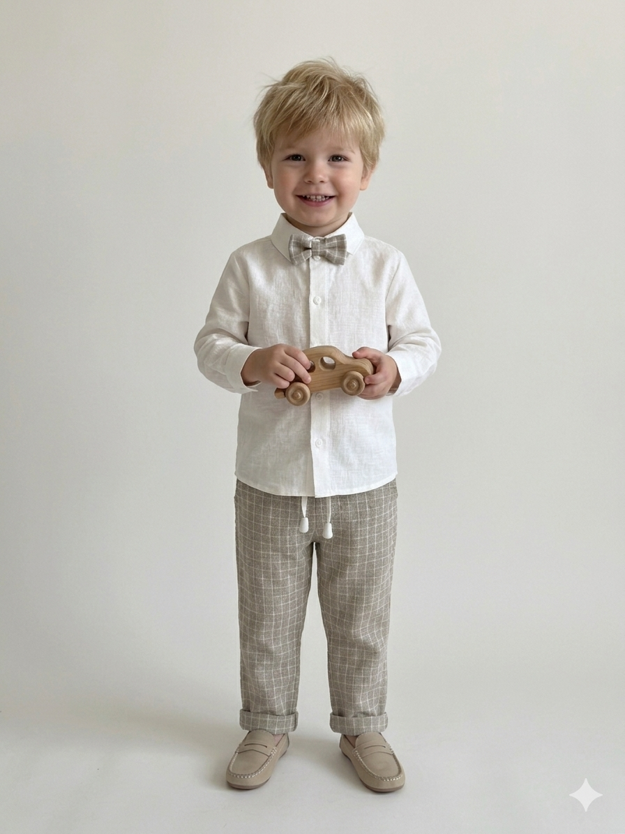 Natūralaus lino kostiumas berniukui su smėlio spalvos languotomis kelnėmis ir baltais marškiniais, peteliške. Šie drabužiai patiks mažam ir didesniam berniukui bet kokios šventės proga, nes nevaržo judesių, yra puošnūs, bet kartu ir patogūs. Su natūralaus lino apranga nekaršta, su ja neprakaituojama, ji nesielektrina. Kelnės su guma, todėl tiks bet kokio dydžio vyrukui.