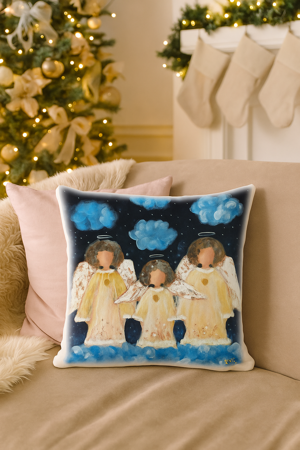 Dekoratyvinė pagalvėlė su autoriniu paveikslu „Angelų šeima“, kurio autorė – s. Justina Gruodytė. Minkšta pagalvėlė iš itin švelnaus veliūro taip ir kviečia prisiglausti, pajausti angelo apkabinimą, pailsėti ir galbūt net nukeliauti į sapnų šalį.