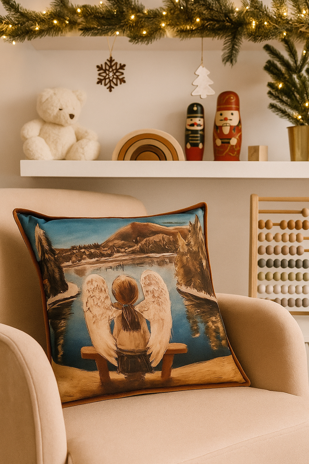 Dekoratyvinė pagalvėlė su autoriniu paveikslu „Angelo malda“, kurio autorė – s. Justina Gruodytė. Minkšta pagalvėlė iš itin švelnaus veliūro taip ir kviečia prisiglausti, pajausti angelo apkabinimą, pailsėti ir galbūt net nukeliauti į sapnų šalį.