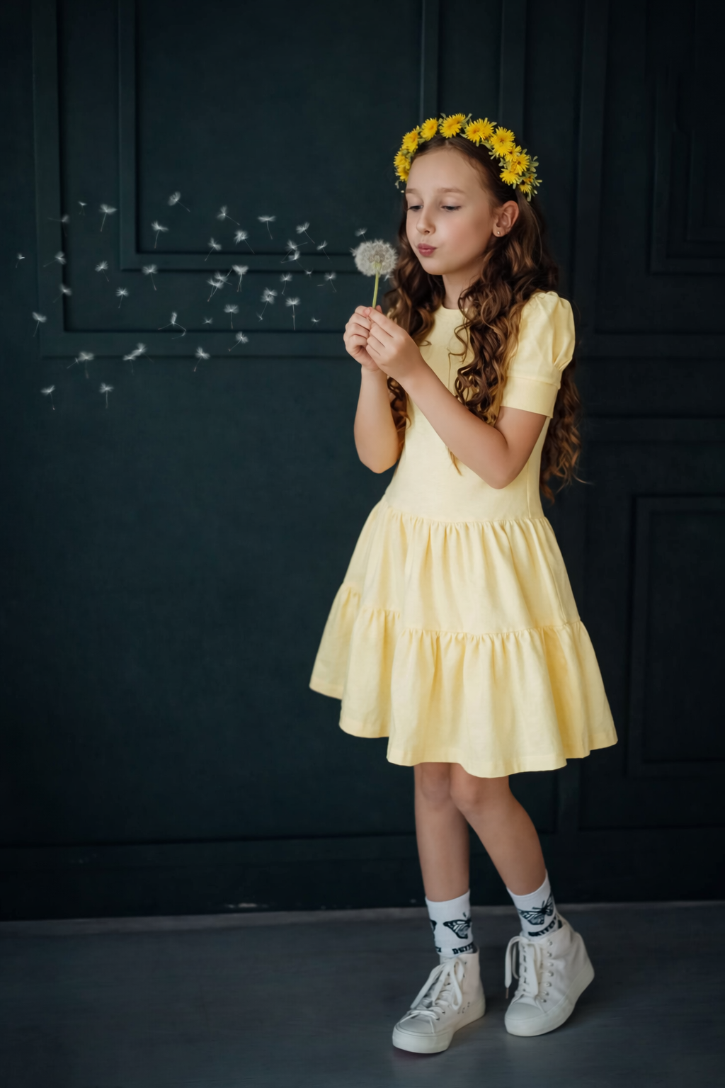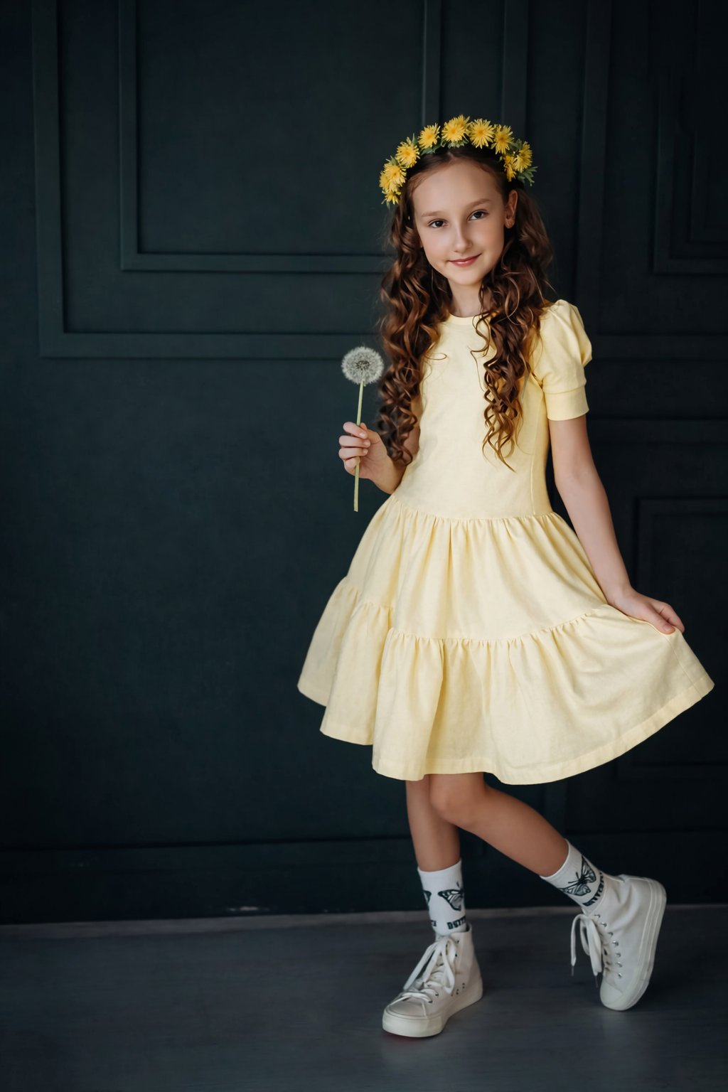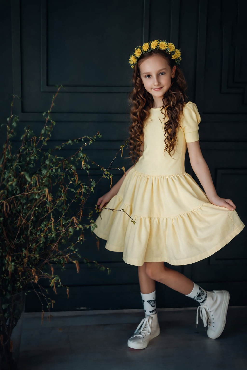Suknelė trumpomis rankovėmis mergaitėms, pasiūta iš aukščiausios kokybės medvilnės trikotažo, kuris leidžia odai kvėpuoti ir jos nedirgina. Medvilnė suteikia jaukumo ir natūralumo, o nedidelė elastano dalis užtikrina, kad suknelė neprarastų formos po skalbimo ir nevaržytų aktyvių judesių.