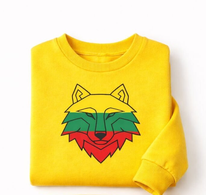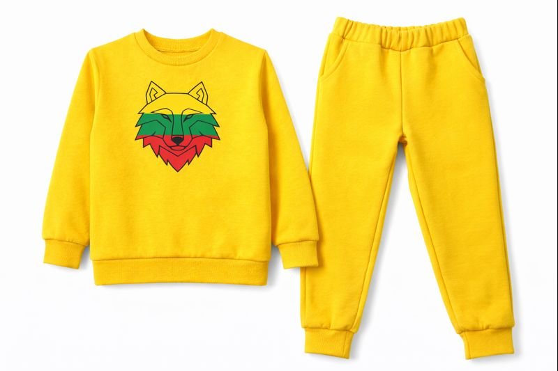 Džemperio ir kelnių komplektas su lietuviška atributika. Kasdieninis, trikotažinis komplektas iš natūralaus audinio, kurį pamėgs ir ikimokyklinio amžiaus, ir didesni berniukai. Vaikiškas bliuzonas su trispalviu vilku ir kelnės su guma, kišenėmis – patogus mažojo patrioto kostiumas. Šis laisvalaikio kostiumas yra universalus, tinka ir mergaitėms. Medvilnė suteikia jaukumo ir natūralumo, o nedidelė elastano dalis užtikrina, kad drabužiai neprarastų formos po skalbimo ir nevaržytų aktyvių judesių.