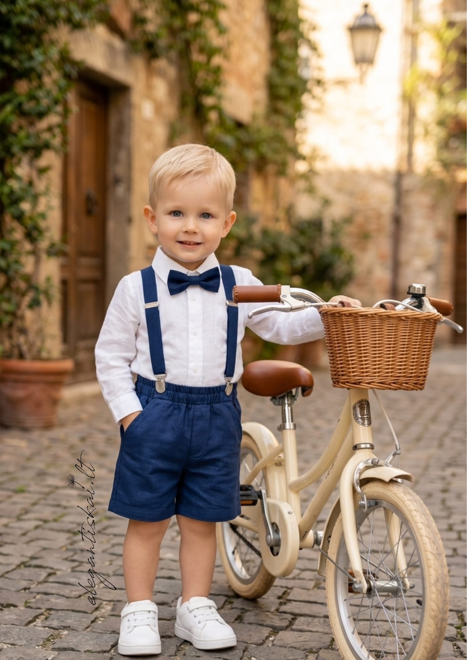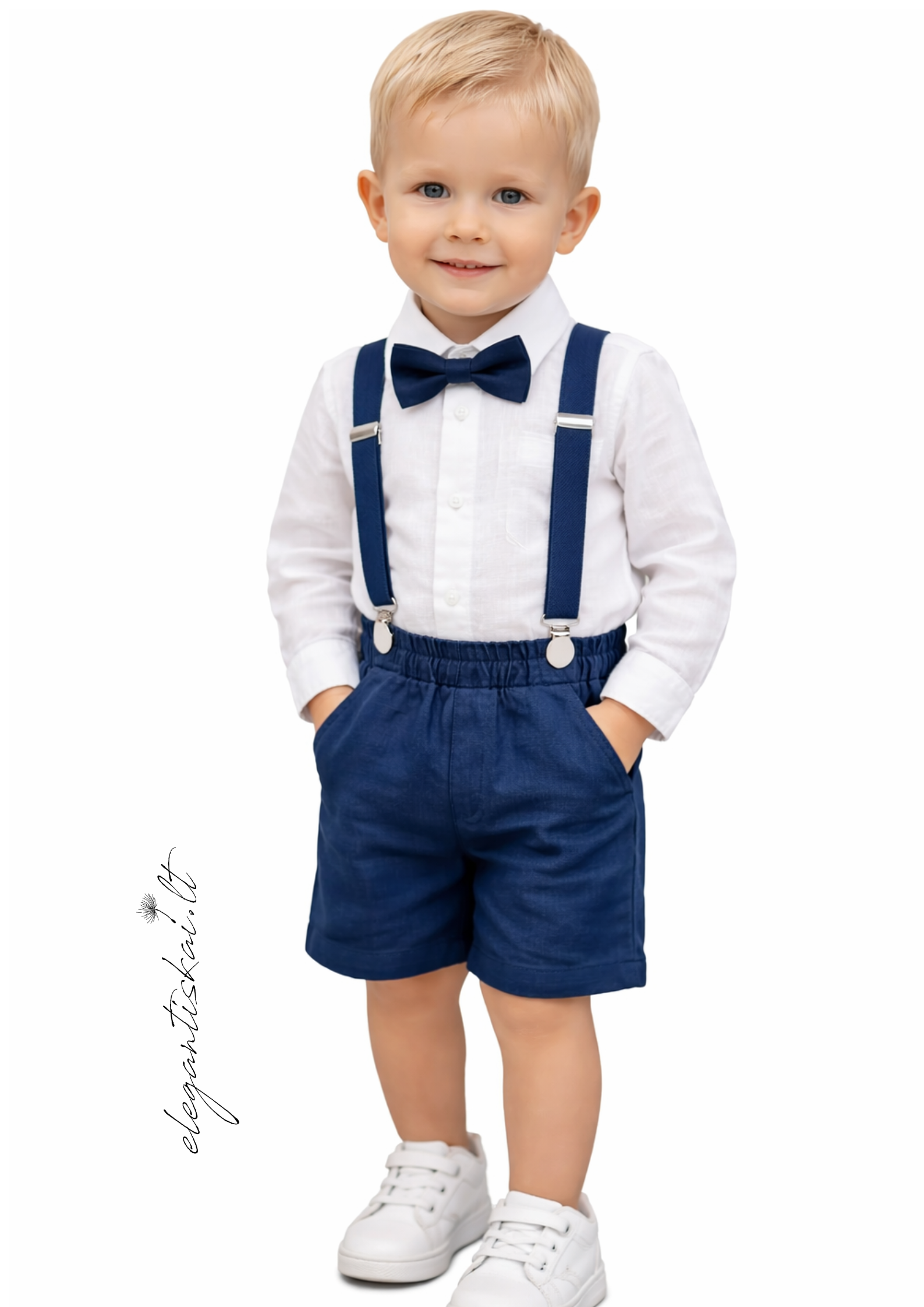 Natūralaus lino kostiumas berniukui, kurį sudaro: balti marškiniai, tamsiai mėlynos spalvos šortukai ir petnešos, peteliškė. Šventinė apranga tikram džentelmenui!