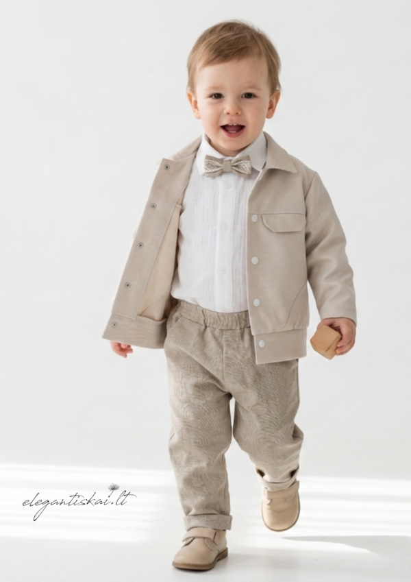Natūralaus lino kostiumėlis berniukui, kurį sudaro: balti marškiniai, kelnės ir prie jų derančios petnešos bei peteliškė. Šventinė apranga tikram džentelmenui bet kokia proga!