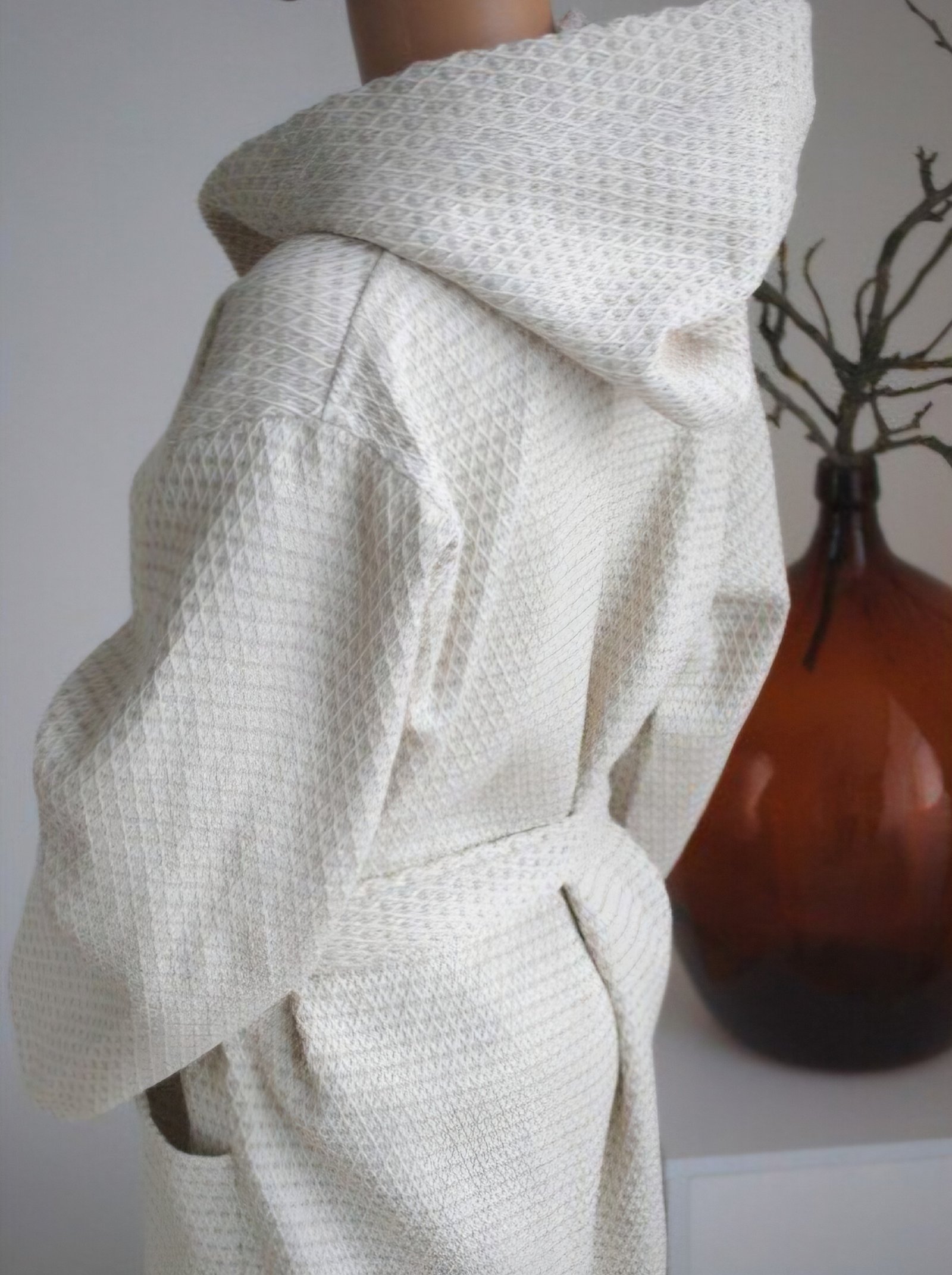 Natūralių audinių derinys užtikrina puikų komfortą – minkštintas linas suteikia audiniui tvirtumo ir leidžia odai kvėpuoti, o medvilnė pasižymi švelnumu ir puikiu drėgmės sugėrimu. Todėl chalatas idealiai tinka po dušo, vonios ar pirties, taip pat jaukiems rytams namuose.