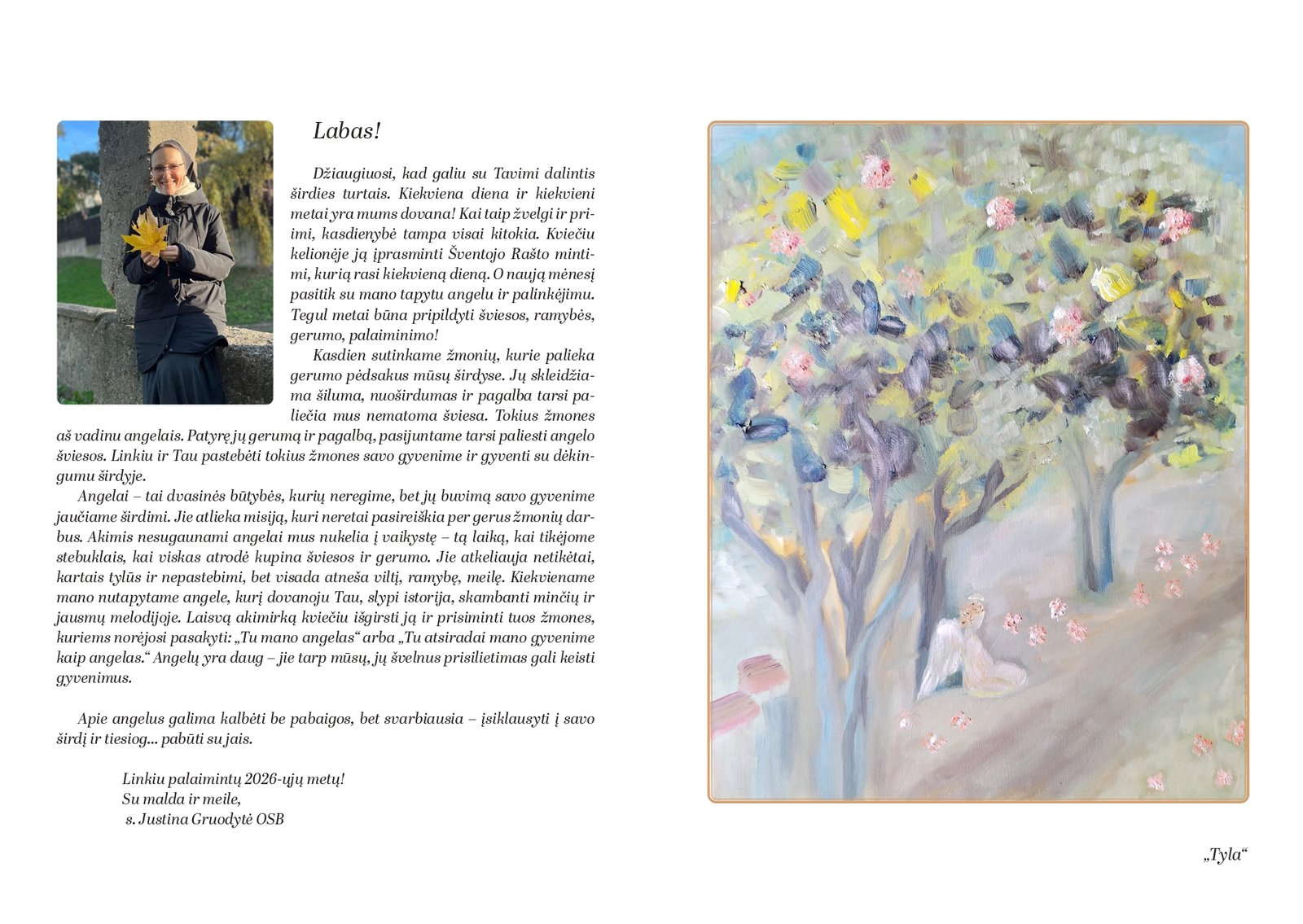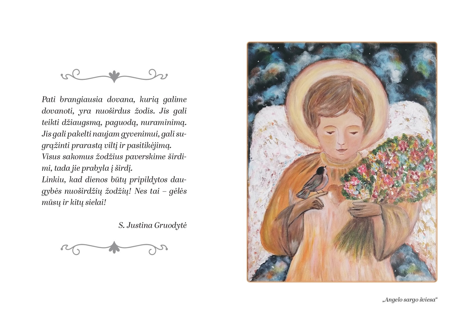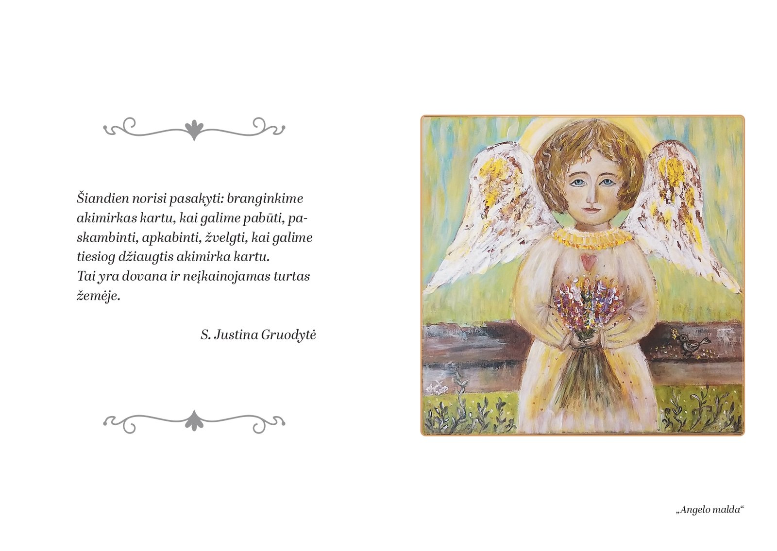 - s. Justinos Gruodytės OSB paveikslą su angelu (kuris vėliau gali tapti paveikslėliu rėmelyje) kiekvienam naujam mėnesiui;