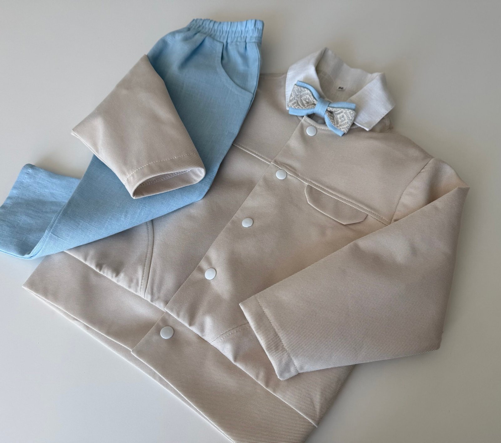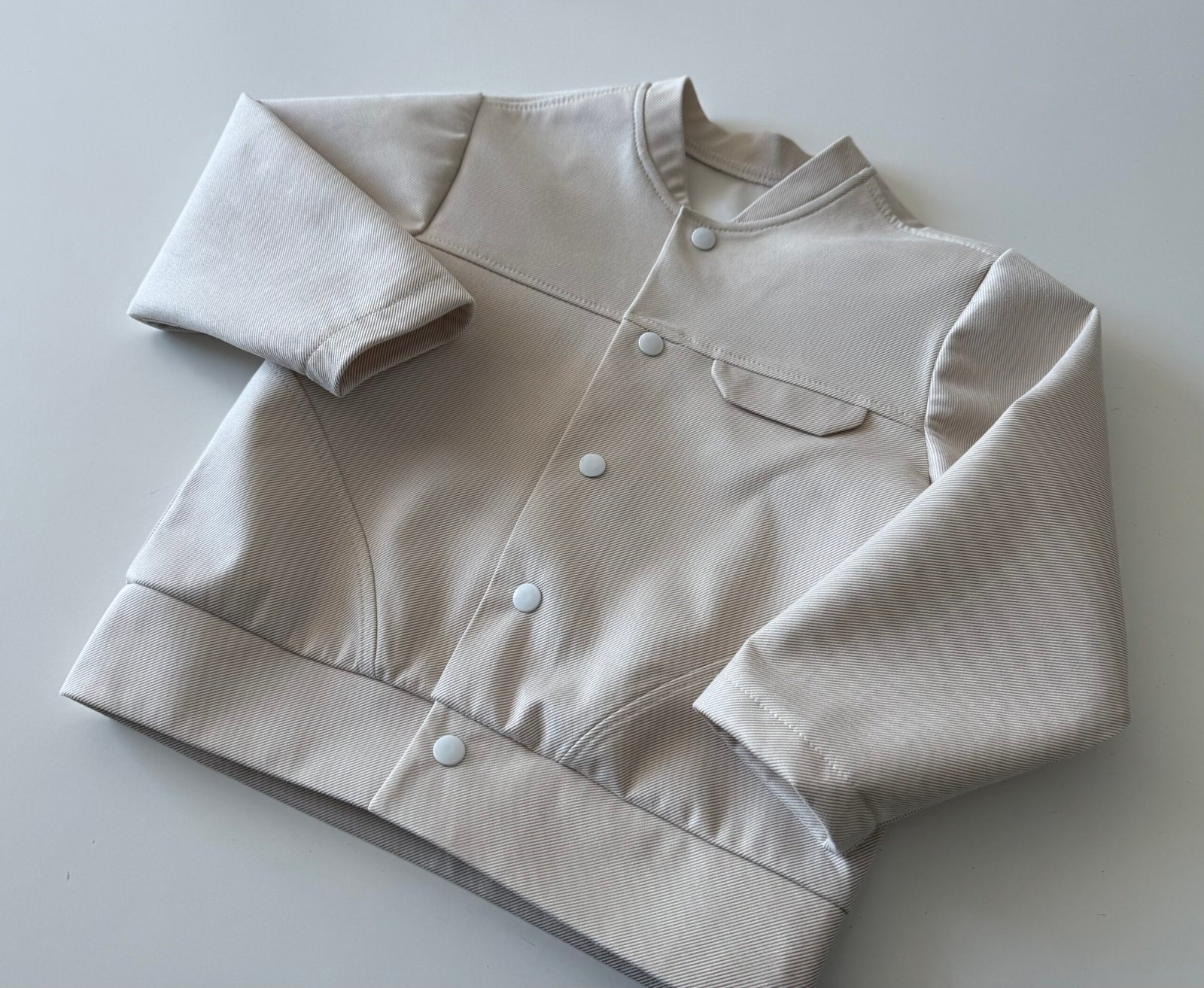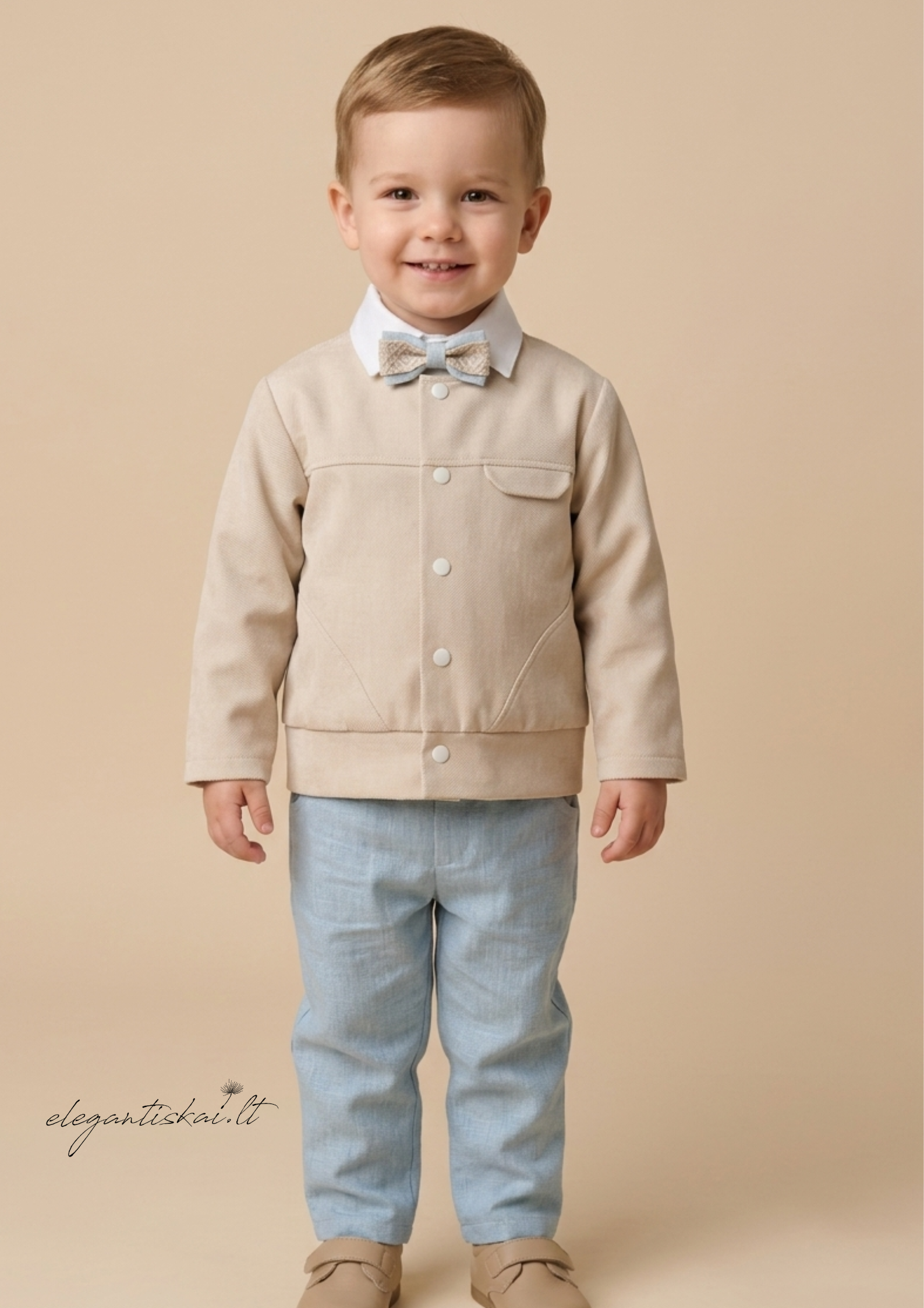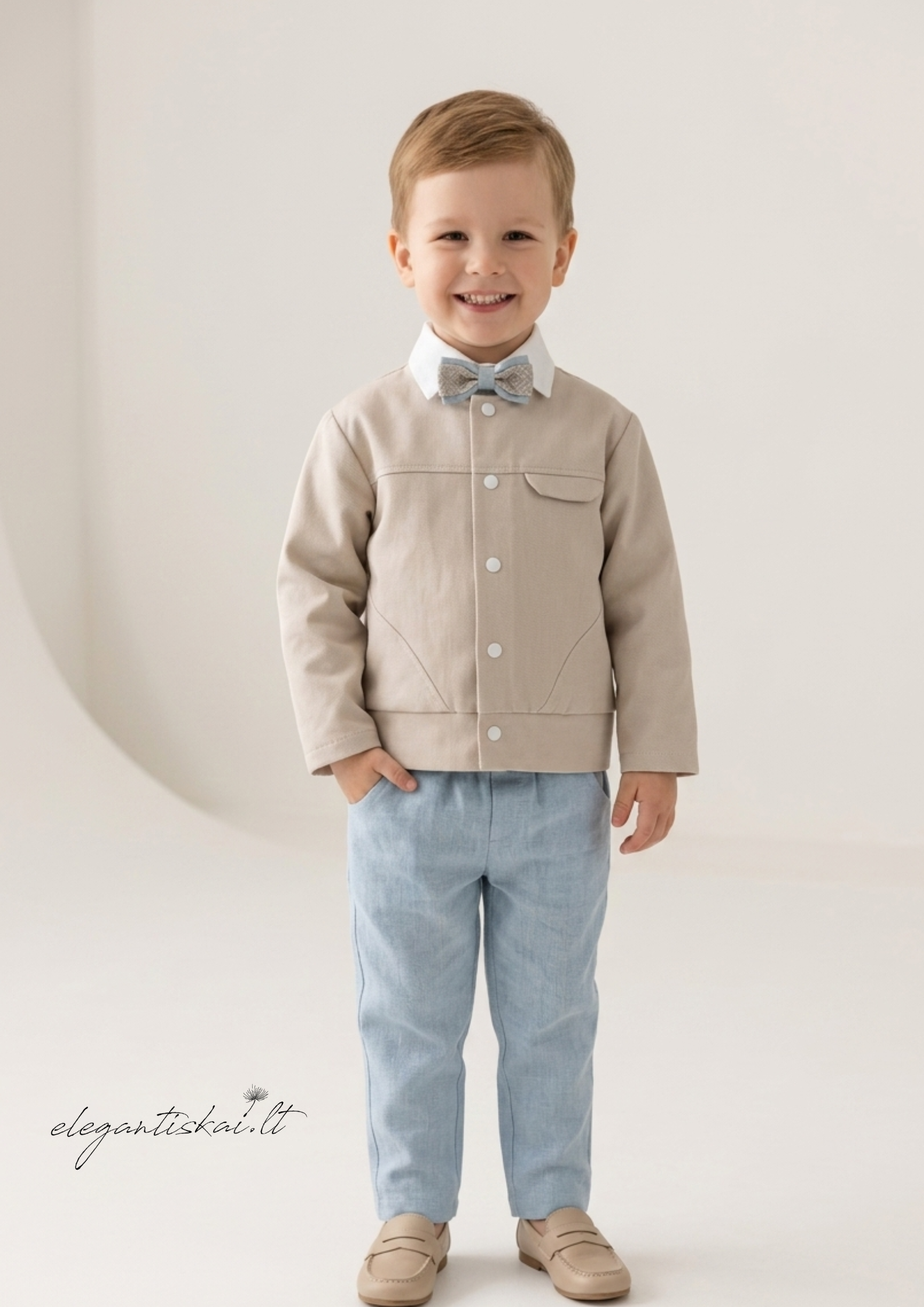 Šviesi šio švarko spalva yra universali, todėl puikiai dera prie bet kokio aprangos derinio. Toks trumpas, bomber stiliaus švarkelis saugos berniuką atvėsus orui, bus išsigelbėjimas net užklupus vasariškam lietučiui.