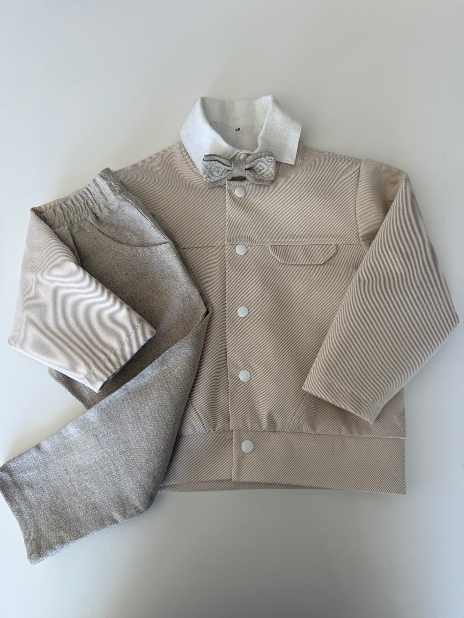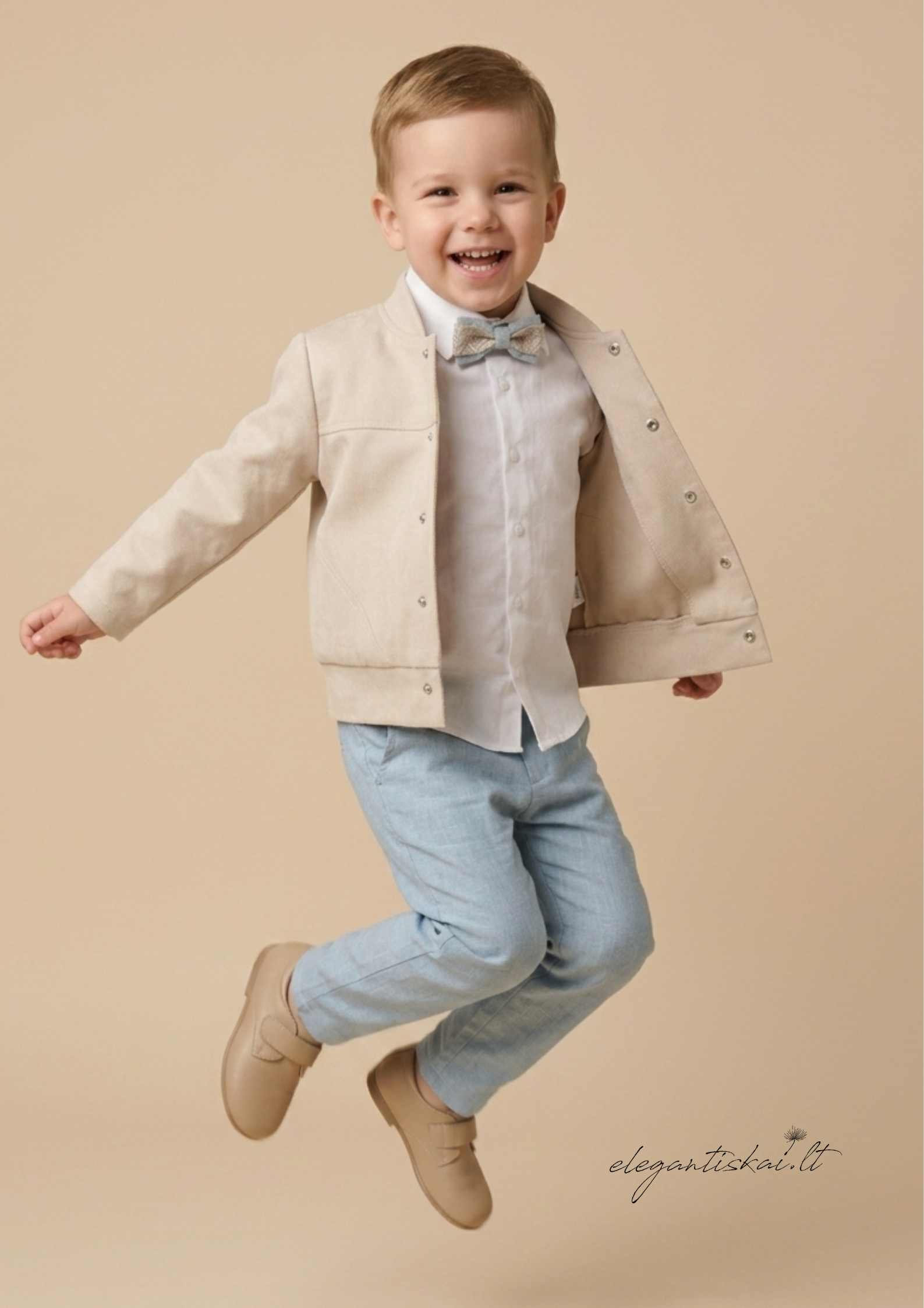 Trumpas, patogus švarkelis berniukui tinka ir prie lininio kostiumo, ir prie kasdieninės aprangos. Švelnios elegancijos ir patogumo derinys mažajam džentelmenui. Šis bomberio stiliaus švarkelis išsiskiria moderniu siluetu, kruopščiai apgalvotomis detalėmis ir lengvai derinama universalia spalva. Neopreno viskozės audinys suteikia malonų minkštumą, elastingumą bei užtikrina komfortą visą dieną – tiek šventėse, tiek kasdieniuose nuotykiuose. Stilingas pasirinkimas, kuris atrodo nepriekaištingai ir leidžia jaustis laisvai.