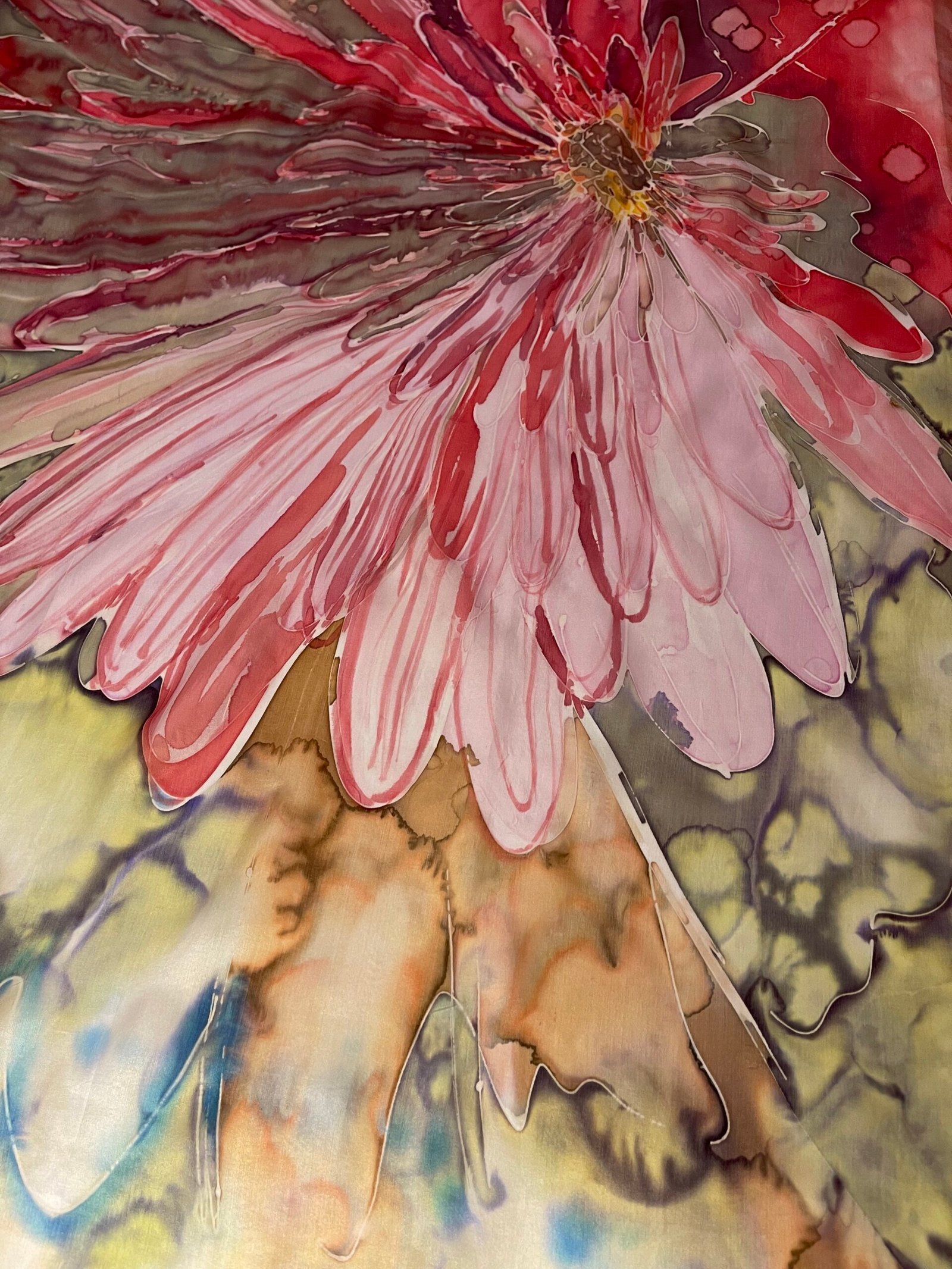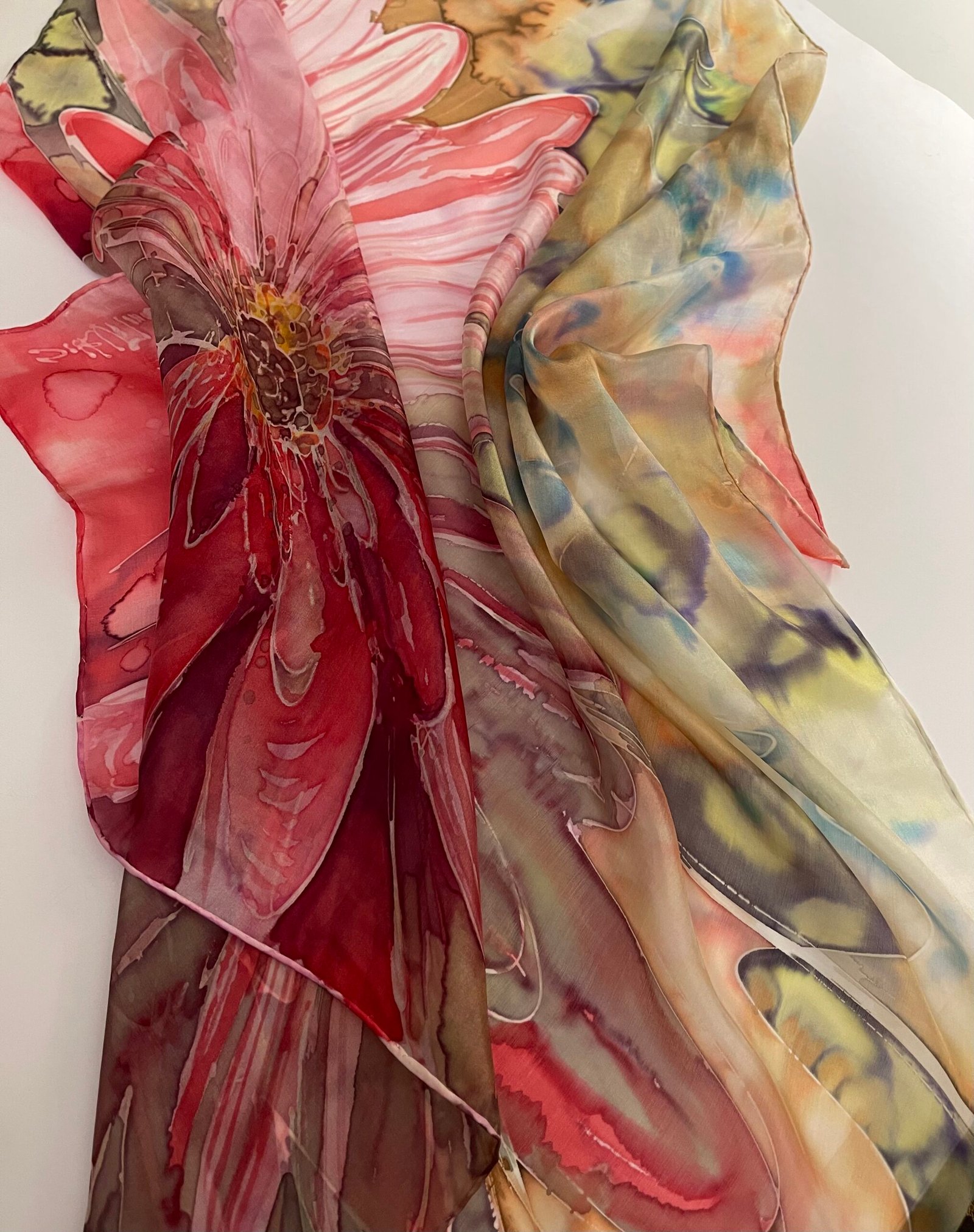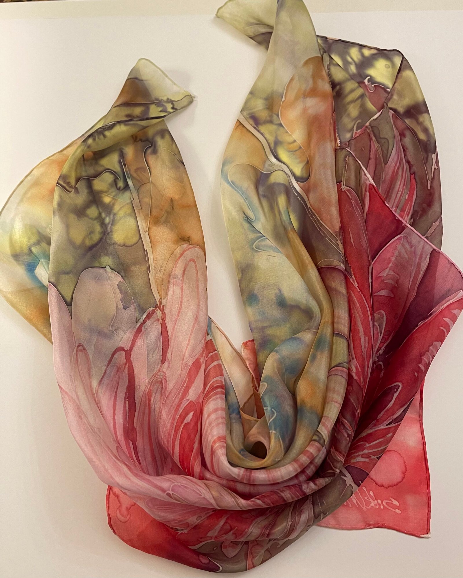 Šio originalaus rankų darbo kūrinio tapybai naudoti šilkui skirti dažai ir natūralūs augalai. Kai kurios spalvos, raštai gali skirtis, nes tai – rankų darbas. Šis unikalus, vienetinis, rankų darbo kūrinys – originali dovana moteriai, merginai.