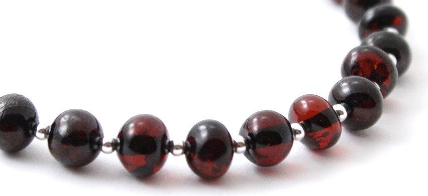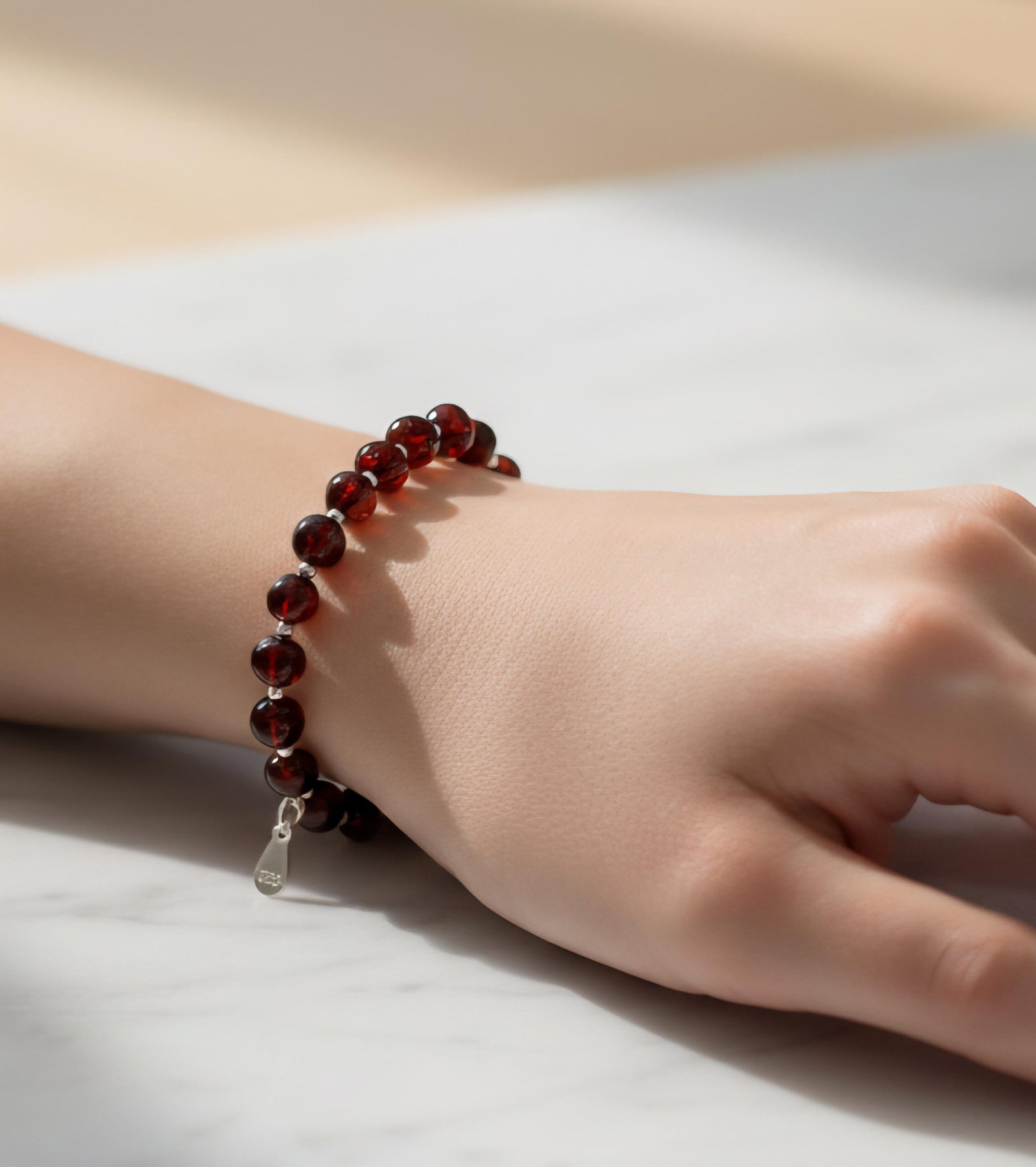 Subtili ir elegantiška rankų darbo apyrankė, pagaminta iš natūralaus Baltijos gintaro. Tamsios, vyšnių spalvos poliruoti gintarai suteikia papuošalui šilumos ir išskirtinumo, o smulkūs sidabro karoliukai subtiliai pabrėžia gintaro grožį. Tai lengvas, kasdienai ir progoms tinkantis papuošalas, puikiai derantis tiek prie klasikinio, tiek prie modernaus stiliaus.