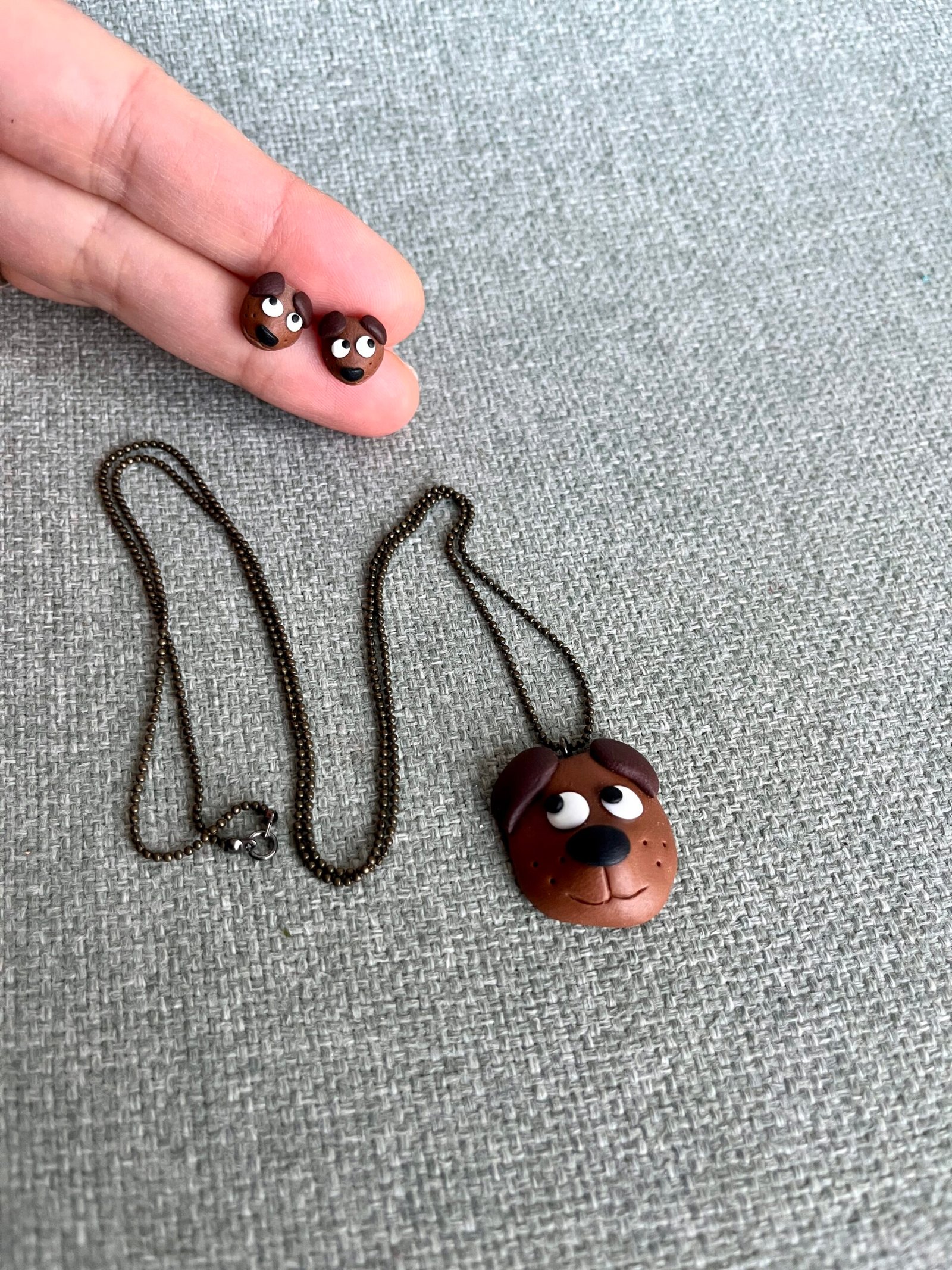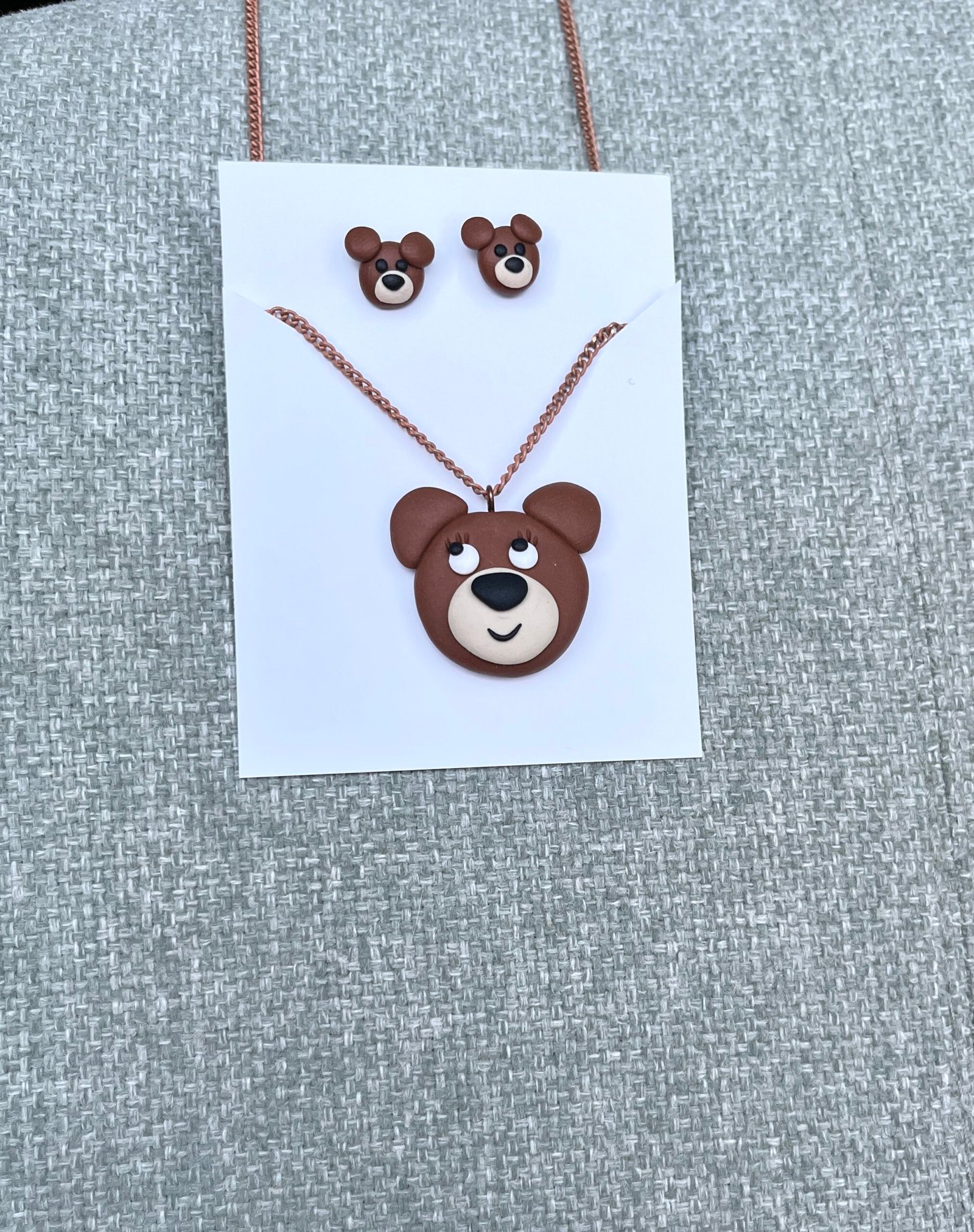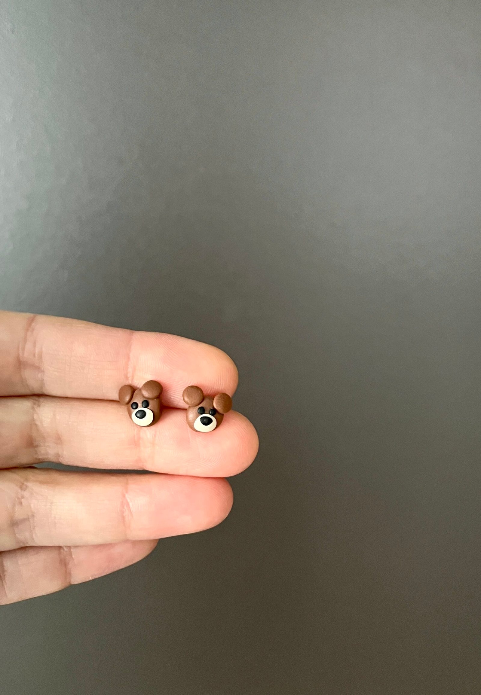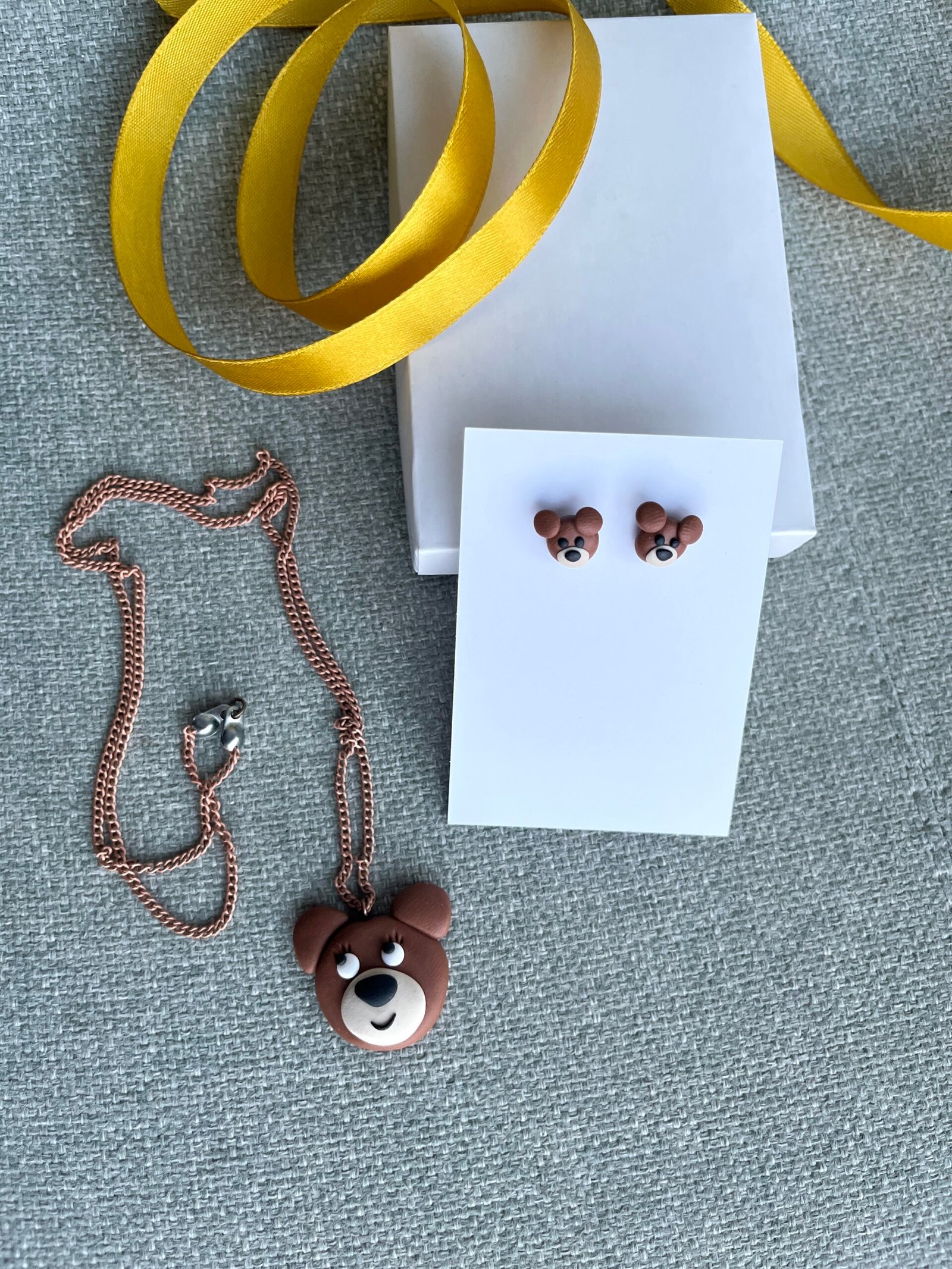 Rankų darbo meškučių formos maži auskariukai ir pakabukas, pagaminti iš polimerinio molio. Simpatiški, mieli ir pilni žavesio, kruopščiai nulipdyti rankomis, todėl yra unikalūs. Lengvi, patogūs ir žaismingi papuošalai subtiliai papuoš kasdienį įvaizdį ir pradžiugins kiekvieną gamtos mylėtoją. Puiki dovana sau arba tam, kas mėgsta išskirtinius, širdį šildančius aksesuarus. Tai – rankų darbo papuošalai, kurio gimimui reikia nemažai laiko, kruopštumo, pastangų bei daug meilės.