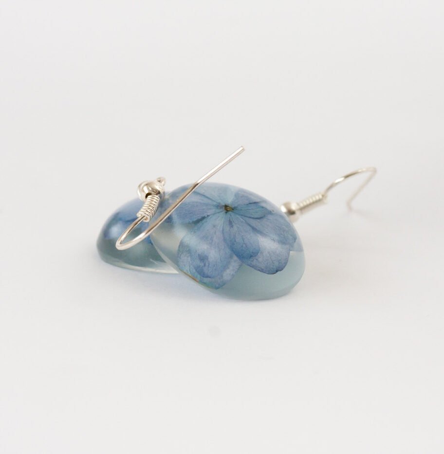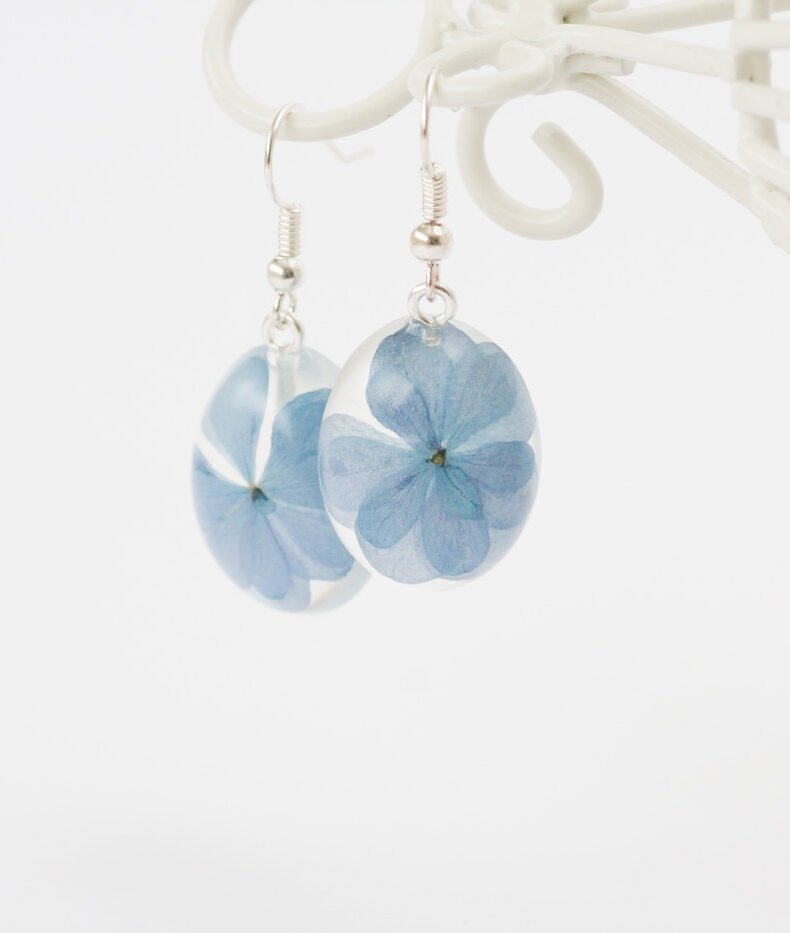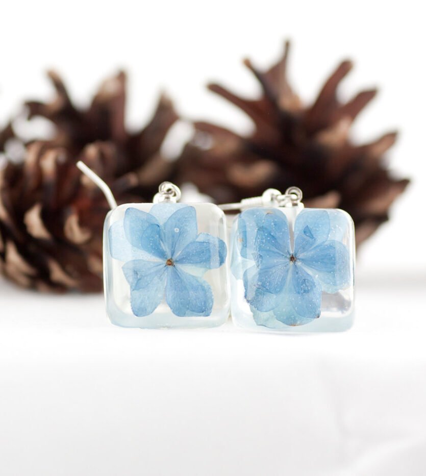Meniški, rankų darbo auskarai su mėlynomis hortenzijomis, įlietomis juvelyrinėje dervoje. Lengvi, kabantys auskarai iš sidabro yra vienetiniai, nes jiems panaudojama vis kita gėlelė. Kaip nėra vienodų augalų ar tokio paties gėlės žiedo, taip ir su šiais auskarais pasipuošusi moteris atsiskleis kaip unikali asmenybė. Galite derinti su kaklo vėriniu ar sage.