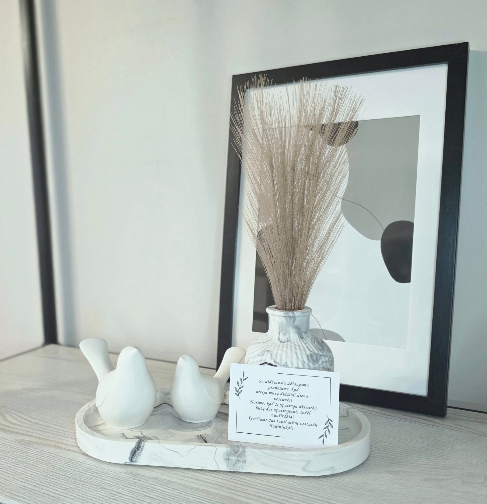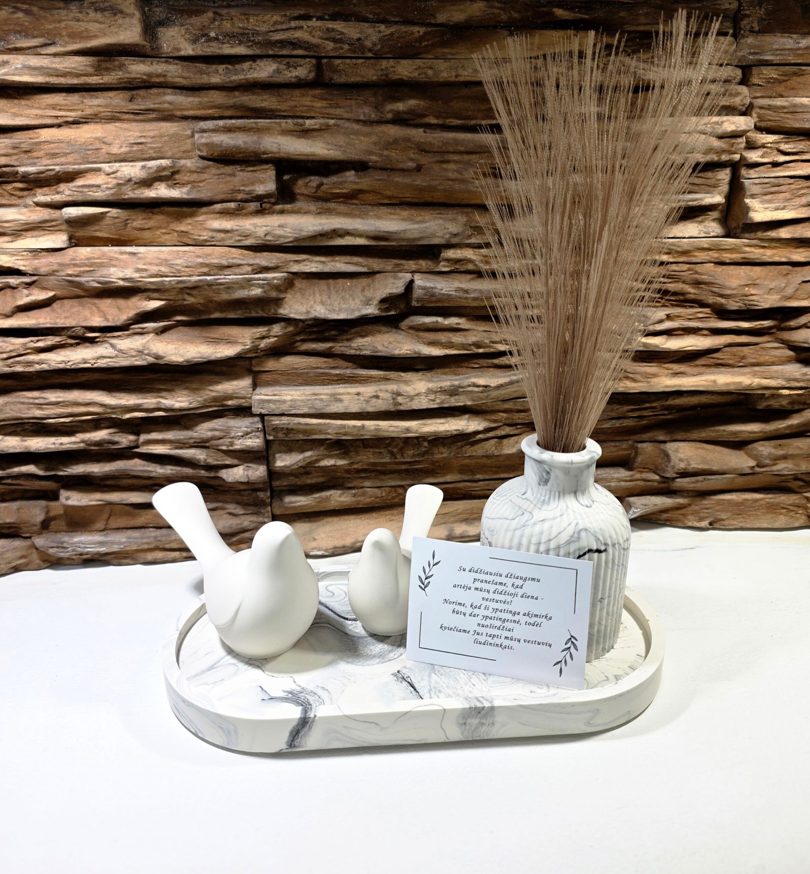 Rankų darbo detalės interjerui su kvietimu į vestuves tėvams, svečiams ar liudininkams. Dovanų rinkinį sudaro: dekoratyvinis padėklas, vaza ir pastatomos paukščių dekoracijos. Padėklas saugos baldus nuo smūgių, drėgmės, karščio. Į vazą geriausia merkti kvapnias lazdeles, sausus, džiovintus, dekoratyvinius augalus ir į ją nerekomenduojama pilti vandens. Šie jaukūs interjero elementai taps stilingomis aplinkos detalėmis ir nuolat primins šventišką progą.