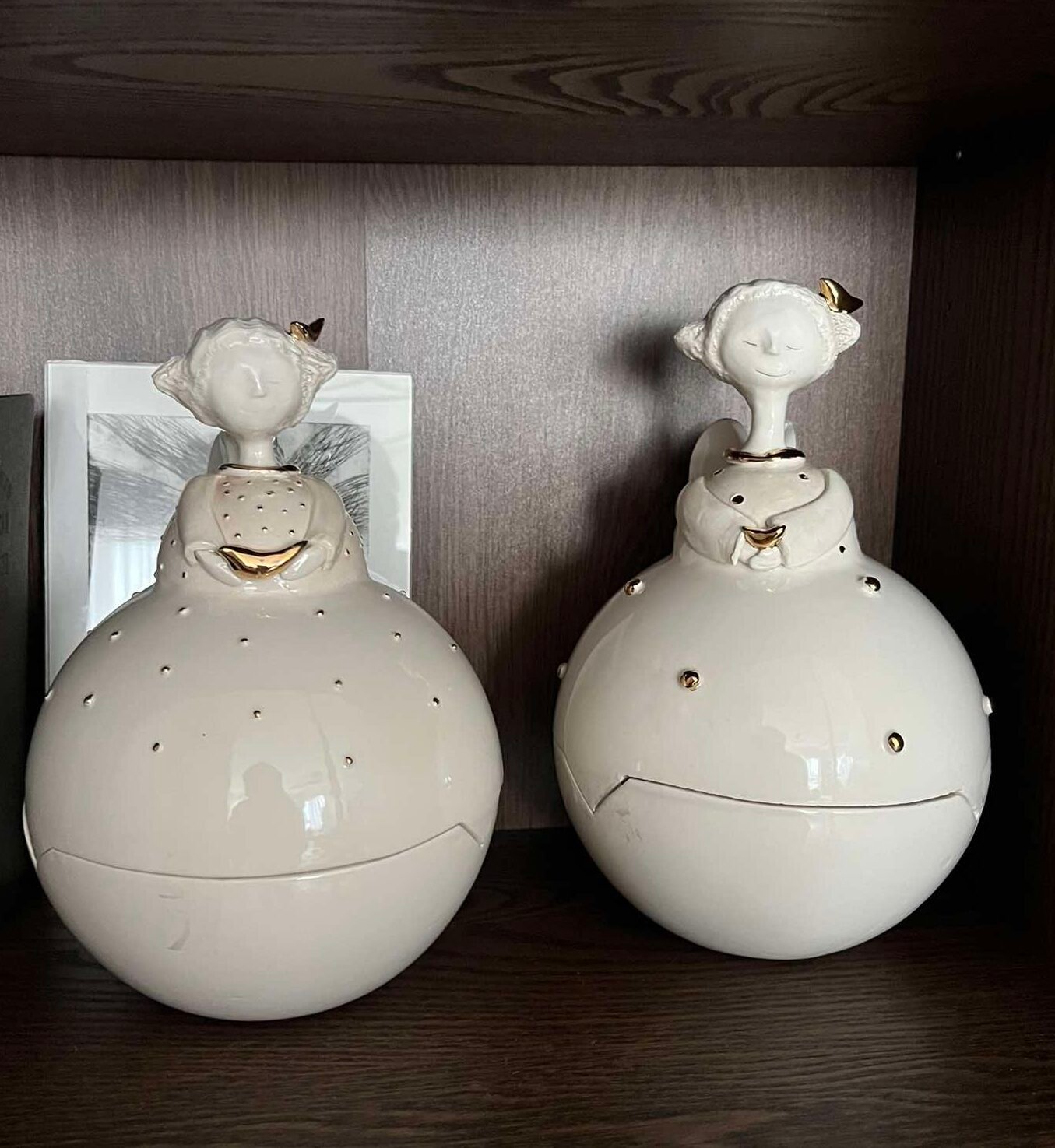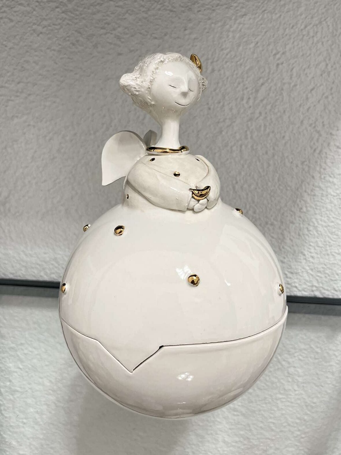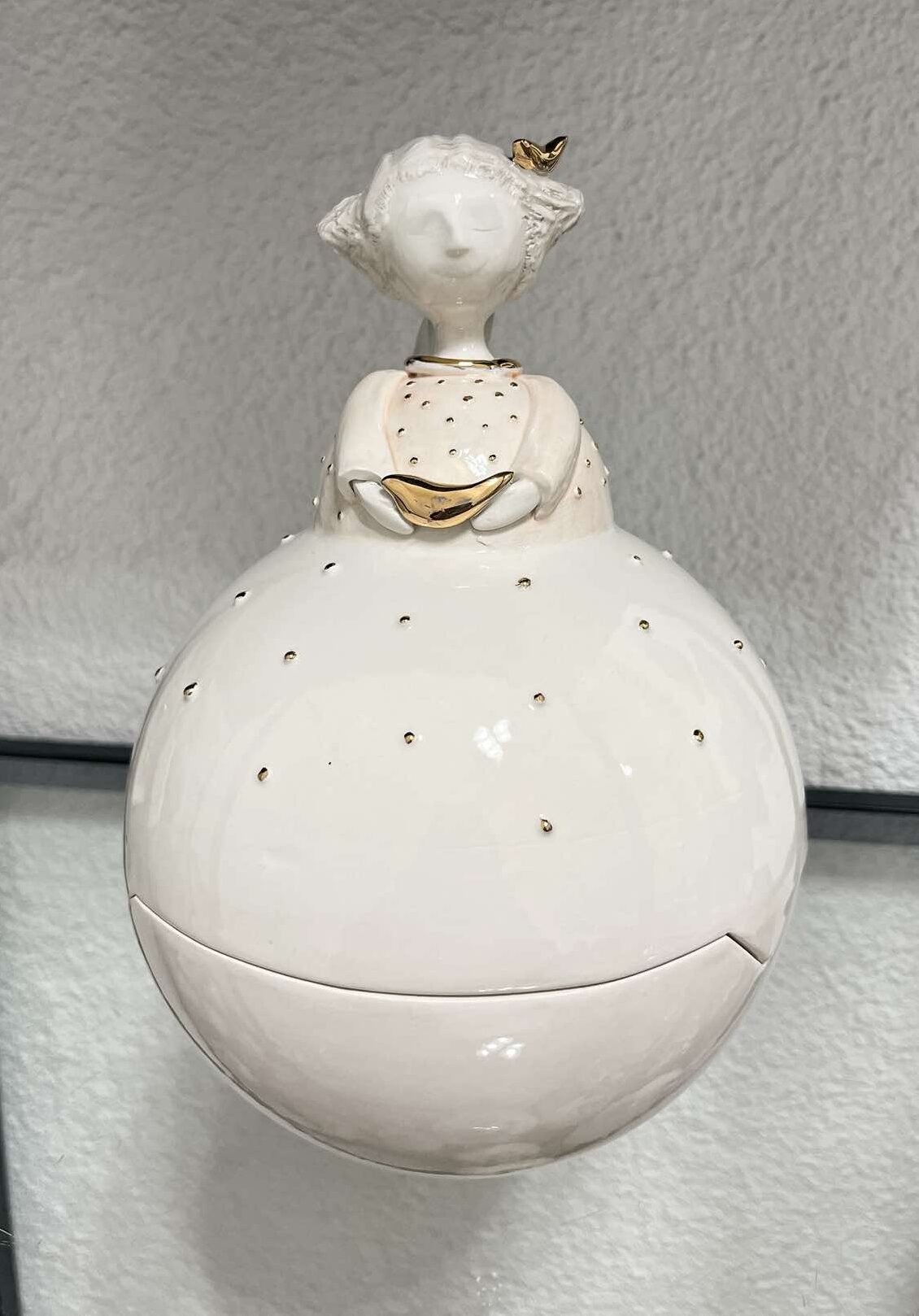 Rankų darbo indelis su dangteliu, dekoruotu mergaite-angelu su aukso paukščiu. Šis indelis pagamintas iš baltojo itališko molio, apgaubtas skaidria glazūra. Toks indelis – tai maža paslaptis, saugoma tylaus angelo globos. Jame tūno ne tik brangiausi daiktai, bet ir dalelė širdies šilumos, įdėta kuriant kiekvieną šią trapią detalę. Auksinis paukštis angelo rankose simbolizuoja laimę ir primena, kad gražiausios akimirkos – tos, kurias saugome su meile.