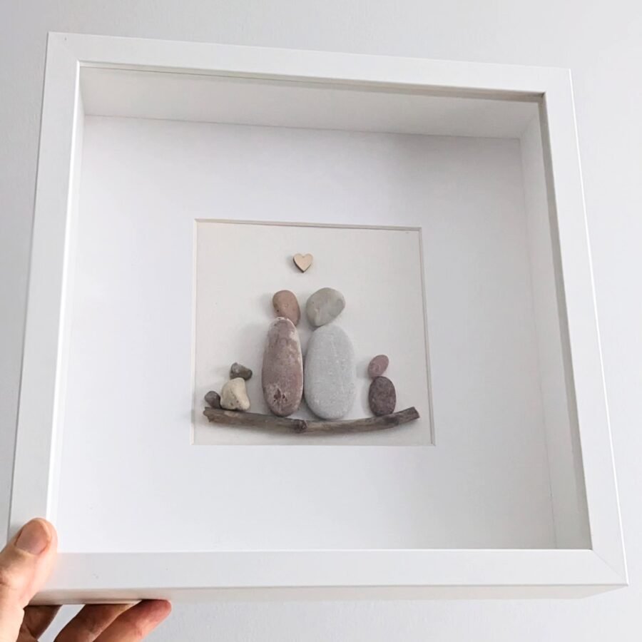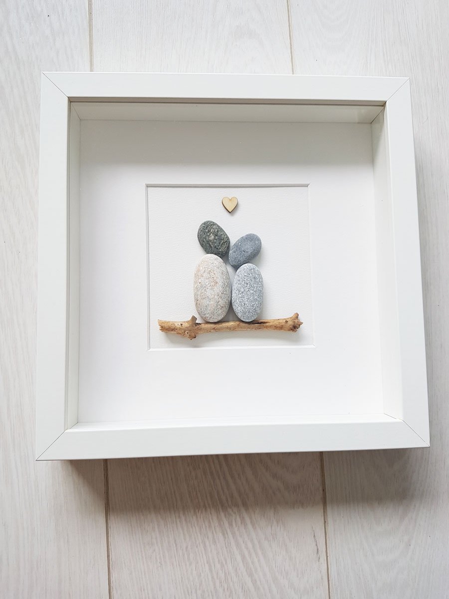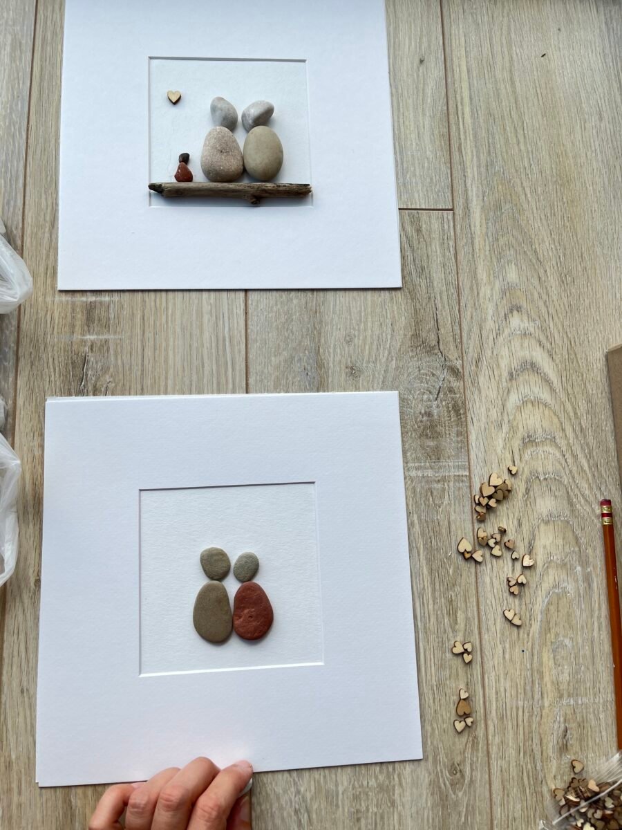 Rankų darbo paveikslėlis iš akmenukų, kuriame vaizduojama įsimylėjusių žmonių pora. Tai gali būti unikali dovana Valentino dienai ar bet kokia proga mylimam žmogui. Įrašius vardus, datą, tai gali įprasminti svarbią dviejų žmonių dieną. Ir, žinoma, tai originali dovana vestuvių proga.