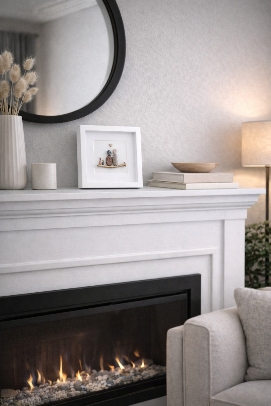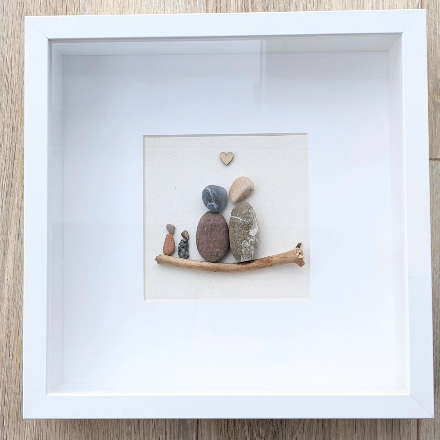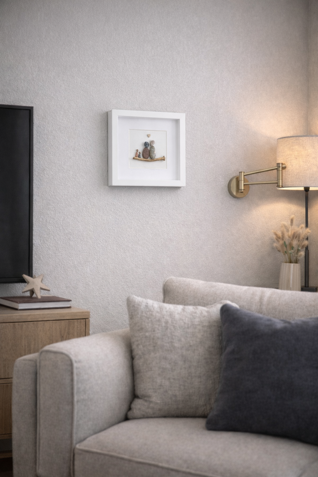 Rankų darbo paveikslėlis iš akmenukų, kuriame vaizduojama įsimylėjusių žmonių pora. Tai gali būti unikali dovana Valentino dienai ar bet kokia proga mylimam žmogui. Įrašius vardus, datą, tai gali įprasminti svarbią dviejų žmonių dieną. Ir, žinoma, tai originali dovana vestuvių proga.