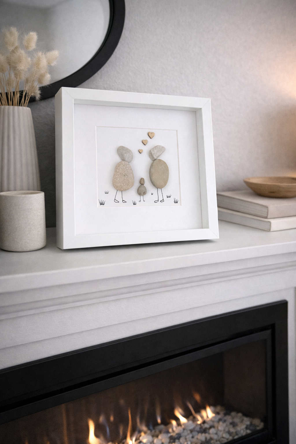 Rankų darbo paveikslėlis iš akmenukų, kuriame vaizduojami tėveliai su mažyliu. Tai gali būti unikali dovana besilaukiantiems tėveliams ar susilaukus kūdikio, kai einama jo aplankyti bei Krikštynų proga. Taip pat tai gali tapti puikia idėja, kaip seneliams pranešti apie atkeliaujantį naują šeimos narį – anūkėlį. Toks rėmelis gali būti dovanojamas įkurtuvėms ir puošti naujus namus.