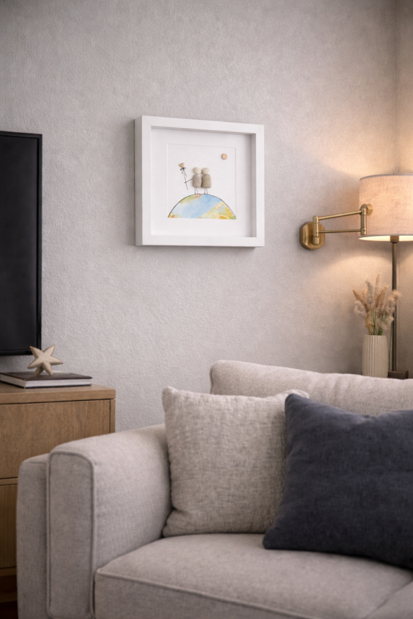 Rankų darbo paveikslėlis iš akmenukų, kuriame vaizduojami tėveliai su kūdikio vežimėliu. Tai gali būti unikali dovana besilaukiantiems tėveliams ar susilaukus kūdikio, kai einama jo aplankyti. Taip pat tai gali tapti puikia idėja, kaip seneliams pranešti apie atkeliaujantį naują šeimos narį – anūkėlį. Toks rėmelis gali būti dovanojamas įkurtuvėms ir puošti naujus namus.