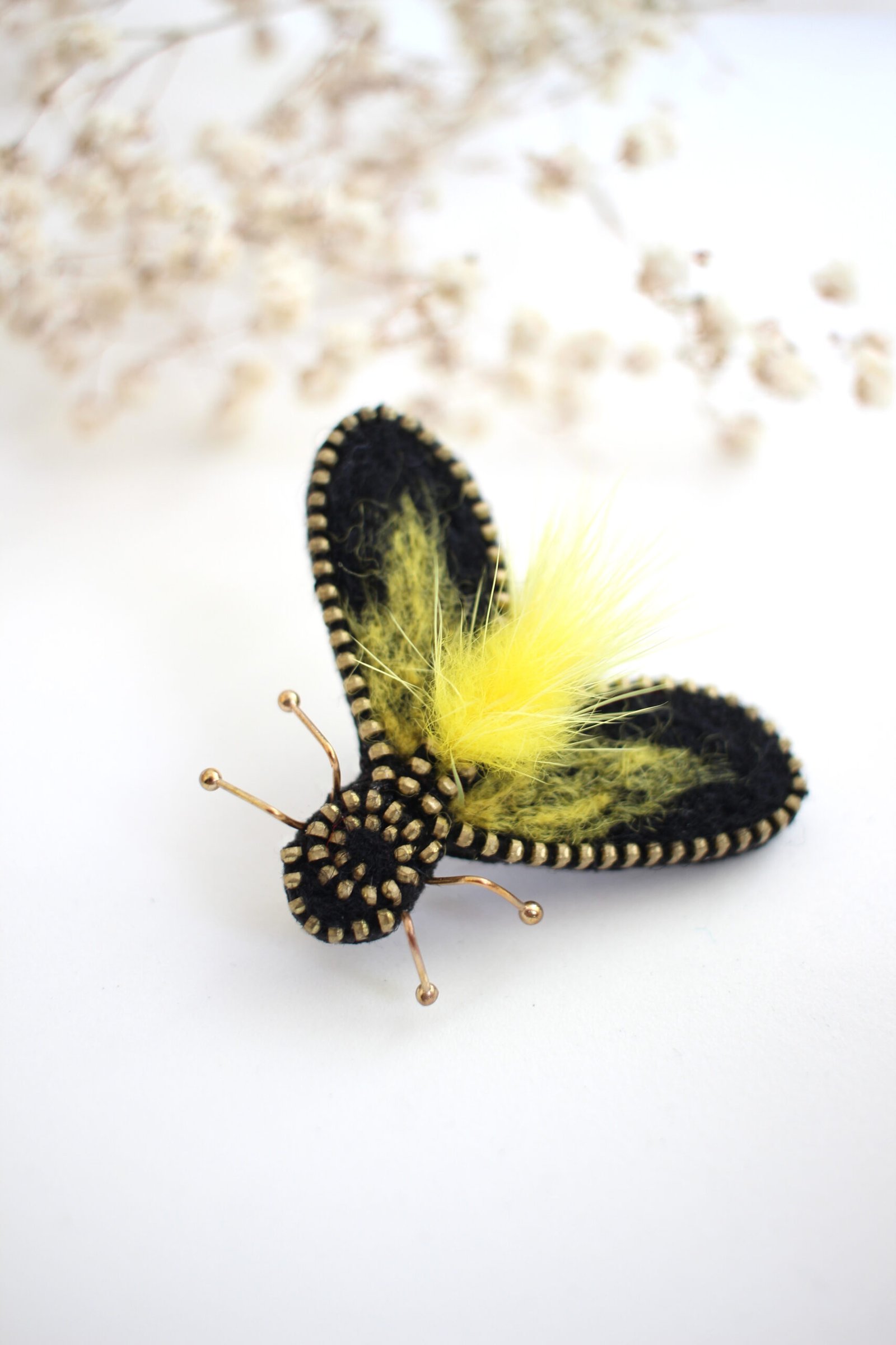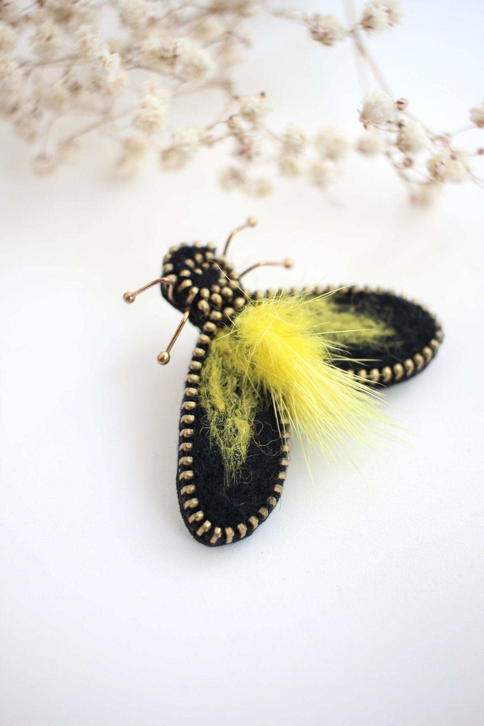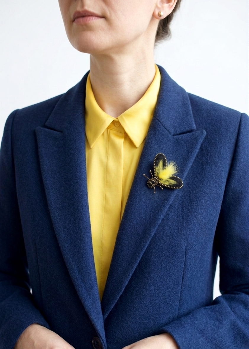 Rankų darbo segė – mėlyna musė, pagaminta iš auksinės spalvos užtrauktuko, juodos ir geltonos vilnos, geltono kailiuko. Sagė identiškai atvaizduoja musės formą, tačiau kūrybiškumo dėka ji tampa stilingu, žaismingu, spalvingu aksesuaru. Tokia žaisminga segė puoš švarką, paltą, palaidinę ar skarelę – ji gali nutūpti bet kur. Supakuota juostele perrištame dovanų maišelyje – belieka dovanoti ir puošti mylimas moteris ar vyrus, nes sagė tinka visiems. Tai – rankų darbo kūrinys, kurio gimimui reikia nemažai laiko, kruopštumo, pastangų bei daug meilės.