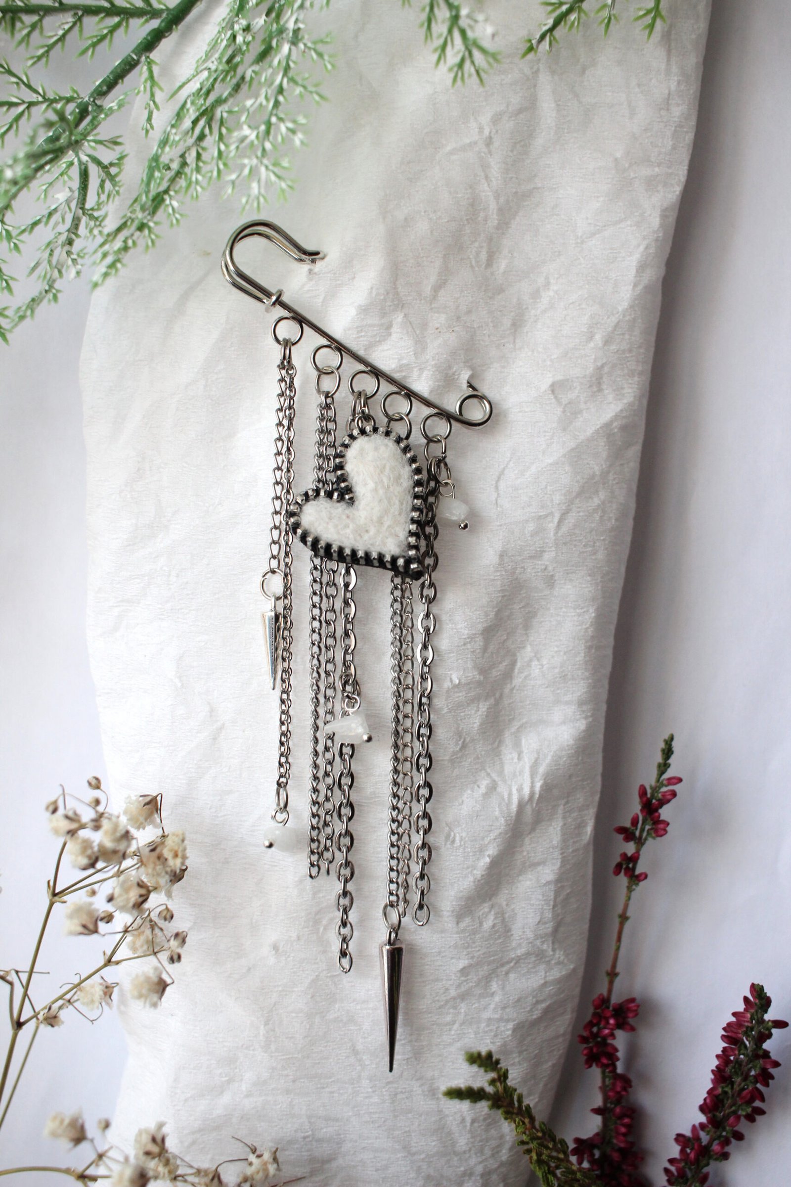 Rankų darbo segė su balta širdele simbolizuoja gyvybę, jausmų ritmą ir vidinį judesį. Širdies forma ir laisvai krentančios grandinėlės kuria lengvą, žaismingą akcentą, kuris subtiliai atkreipia dėmesį. Tokia spalvinga, originali segė puoš švarką, paltą, palaidinę ar skarelę.