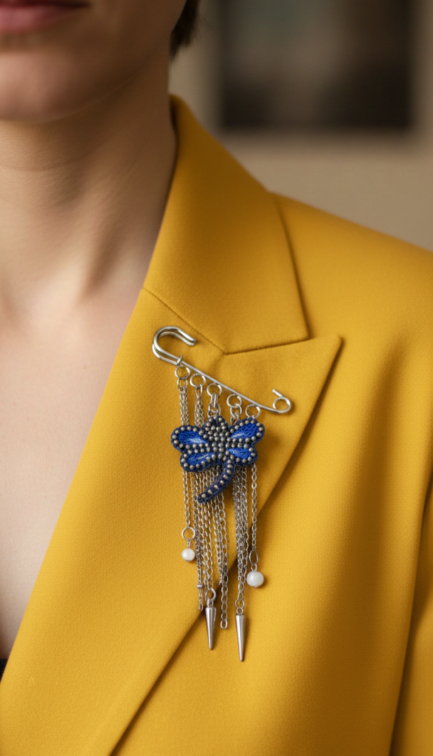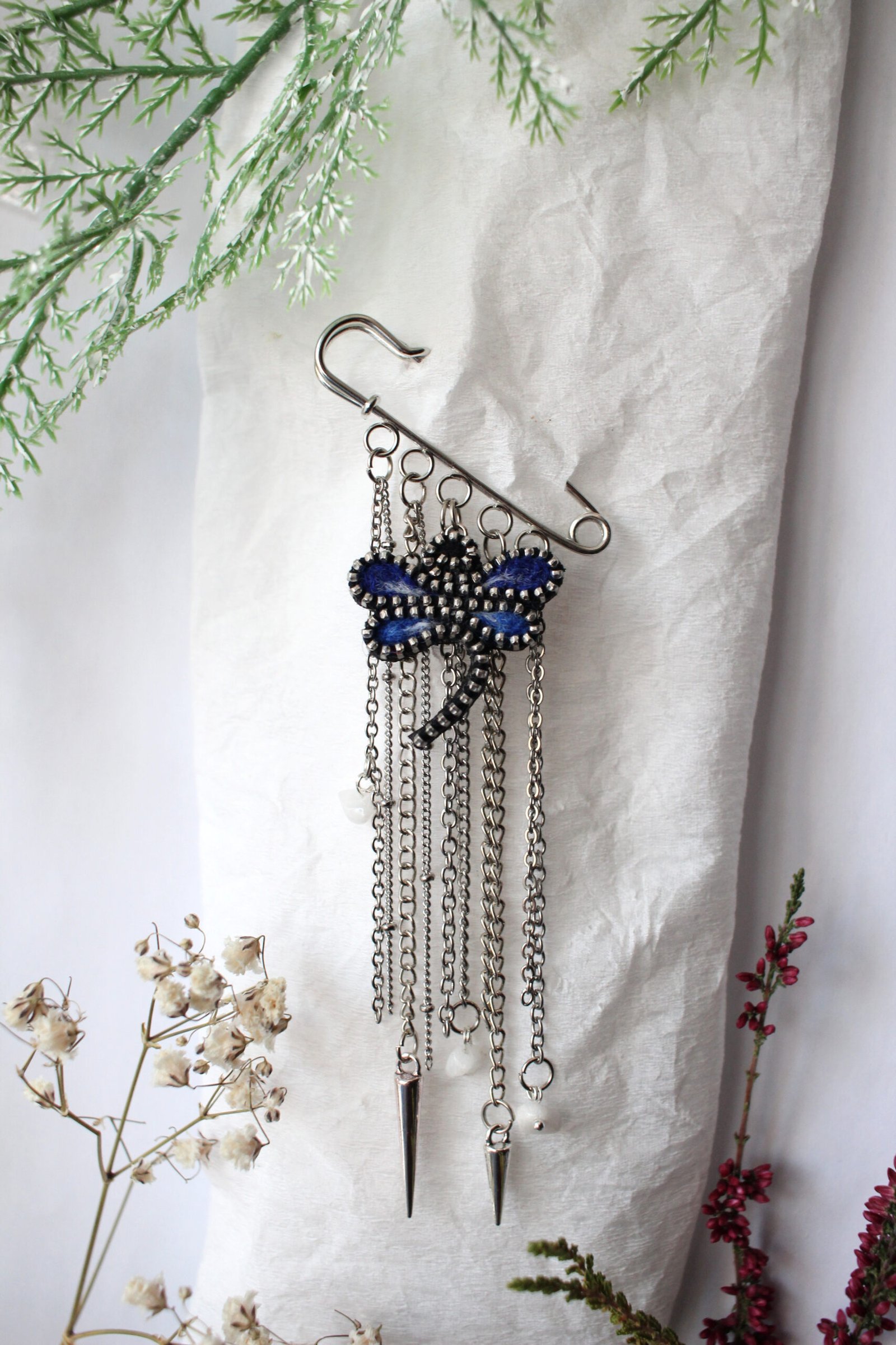Rankų darbo sagė su naktiniu laumžirgiu, kuris laikomas laisvės, virsmo ir lengvumo simboliu, o tamsūs atspalviai su gilia mėlyna spalva suteikia sagei paslaptingo, subtiliai išraiškingo charakterio.