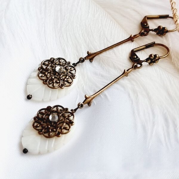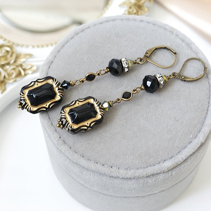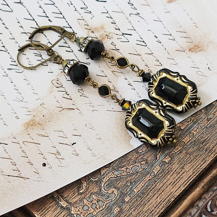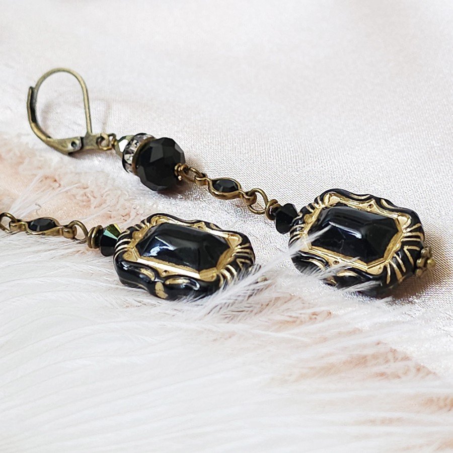 Vintažiniai auskarai „Black Lady“ iš žalvario spalvos bei akrilinių detalių, čekiškų stiklo karoliukų ir Swarovski kristalų žalvario rėmelyje. Tai rankų darbo papuošalai, kuriuose susilieja klasika, meninė išraiška ir savita istorija. Kiekvienas toks kūrinys gimsta iš idėjos ir jausmo – tai ne tik aksesuaras, bet mažas pasakojimas, skirtas moteriai, kuri vertina išskirtinumą ir prasmę.