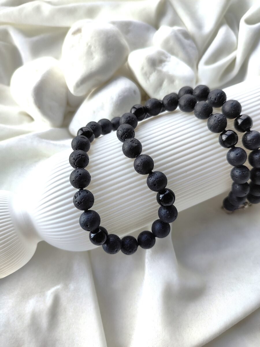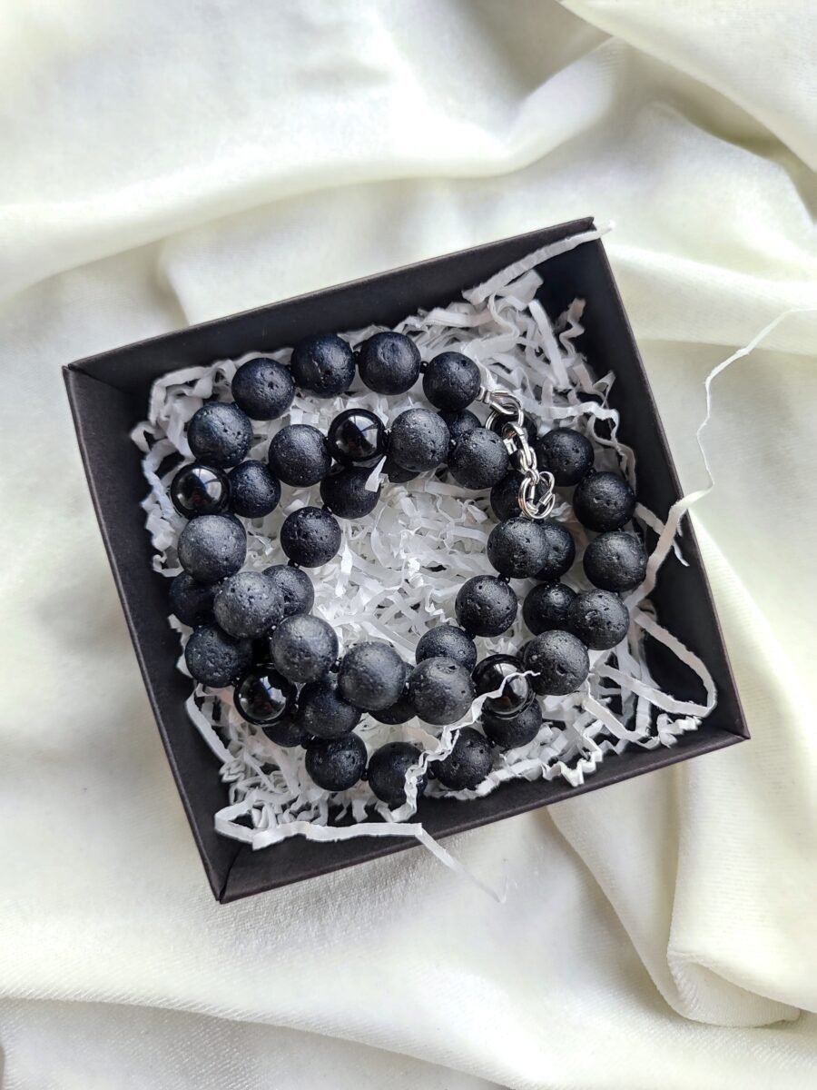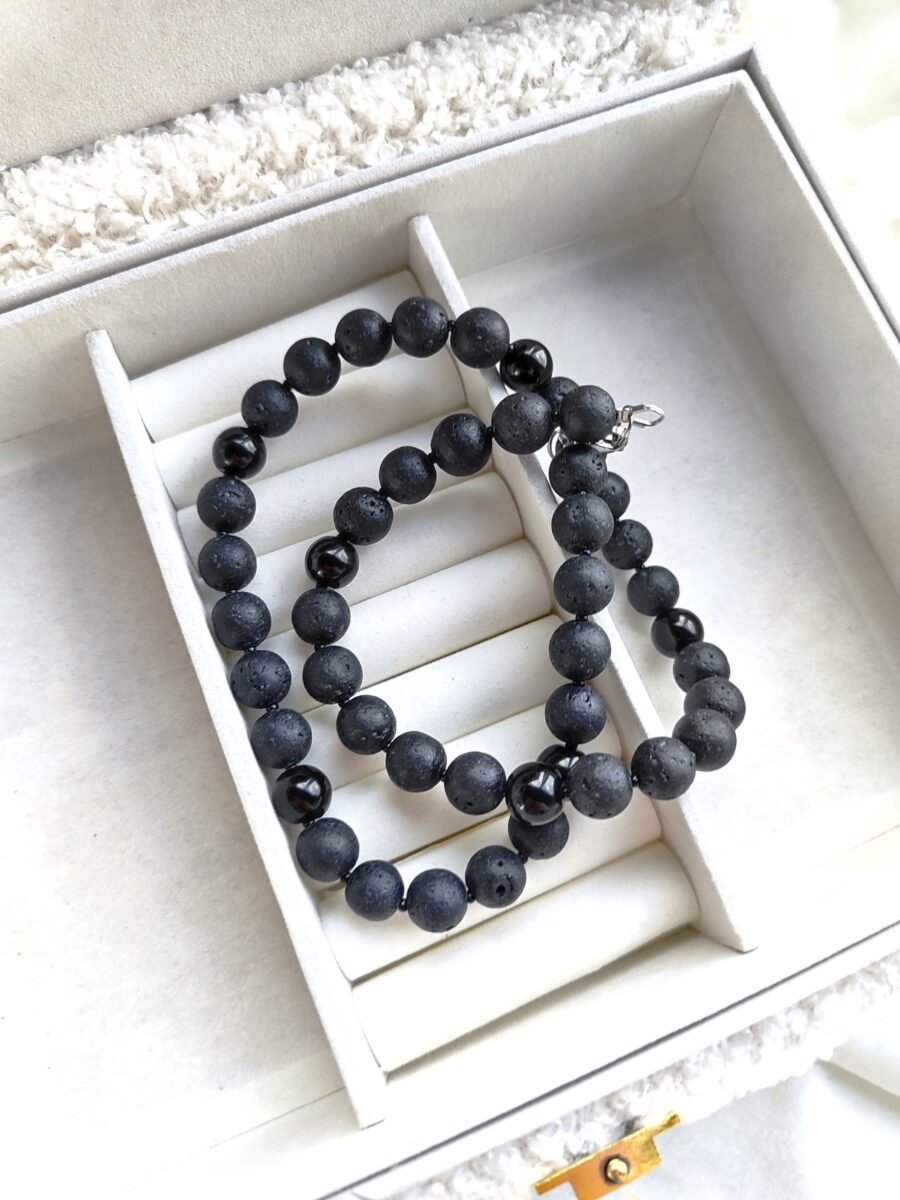Vyriškas rankų darbo papuošalas iš 10 mm juodos lavos ir onikso akmenukų. Natūralūs lavos akmenys suteikia jam žemiško charakterio – kiekvienas jų porėtas, nelygus, lyg nugludintas laiko, o oniksas įneša gylio. Šis rankų darbo vyriškas vėrinys gimė iš kontrastų: griežtos formos ir minkštos tėkmės, svorio ir lengvumo, žemės ir šviesos.