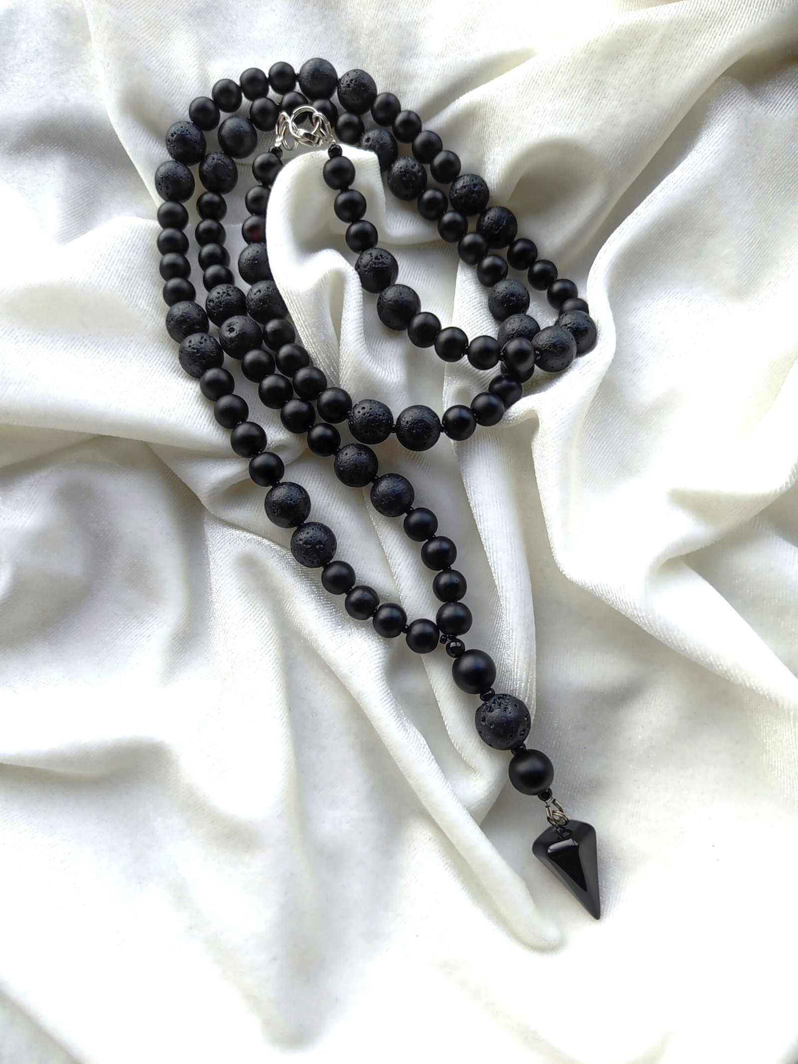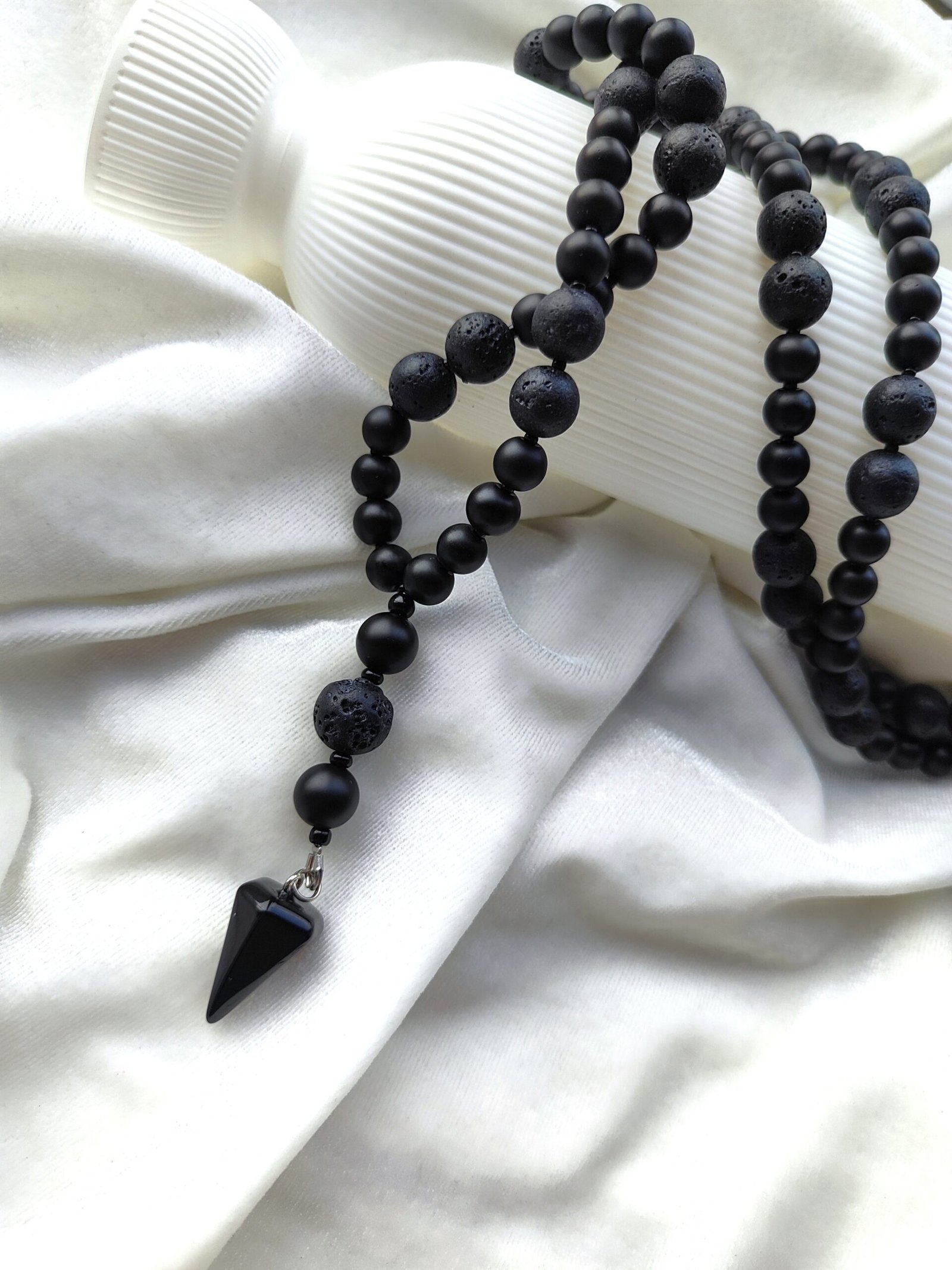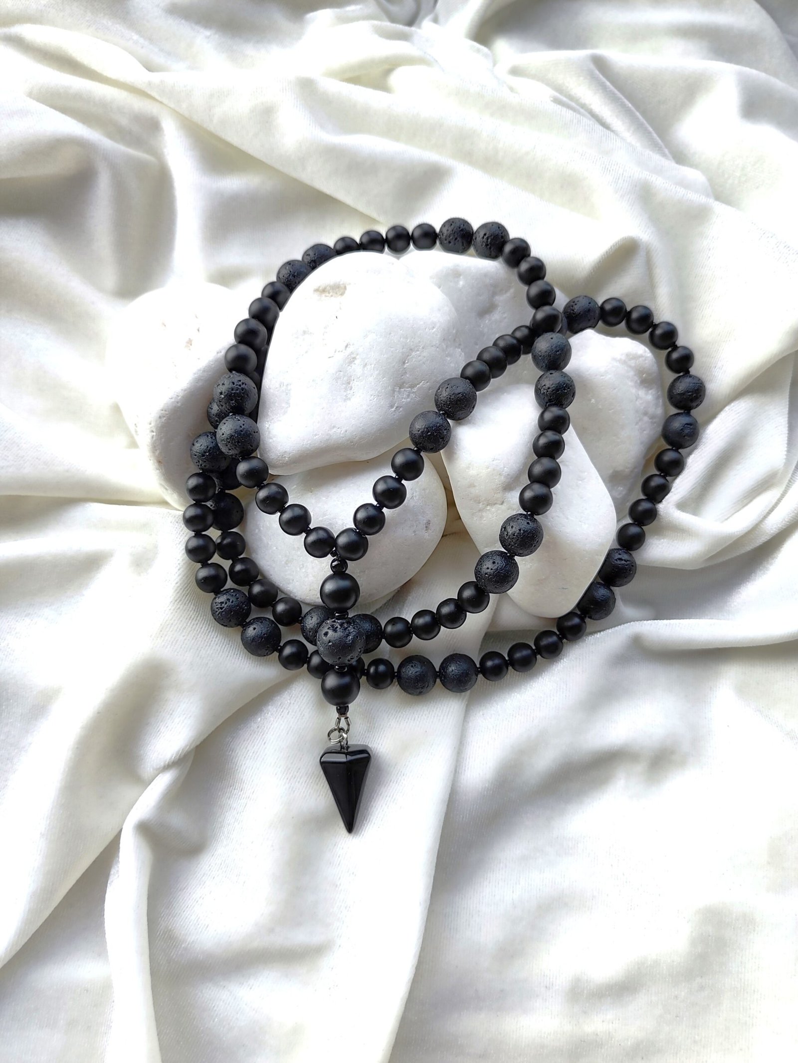 10 mm lavos akmenukai, kurie yra grubūs, gyvi, tarsi neapdorota energija, suteikia papuošalui struktūrą. Tarp jų įsiliejantis 8 mm oniksas – gilus, lyg naktis be triukšmo. O čekiško stiklo intarpai subtiliai pagauna šviesą, vos pastebimai ją sujudindami, lyg mintį, kuri ateina netikėtai.