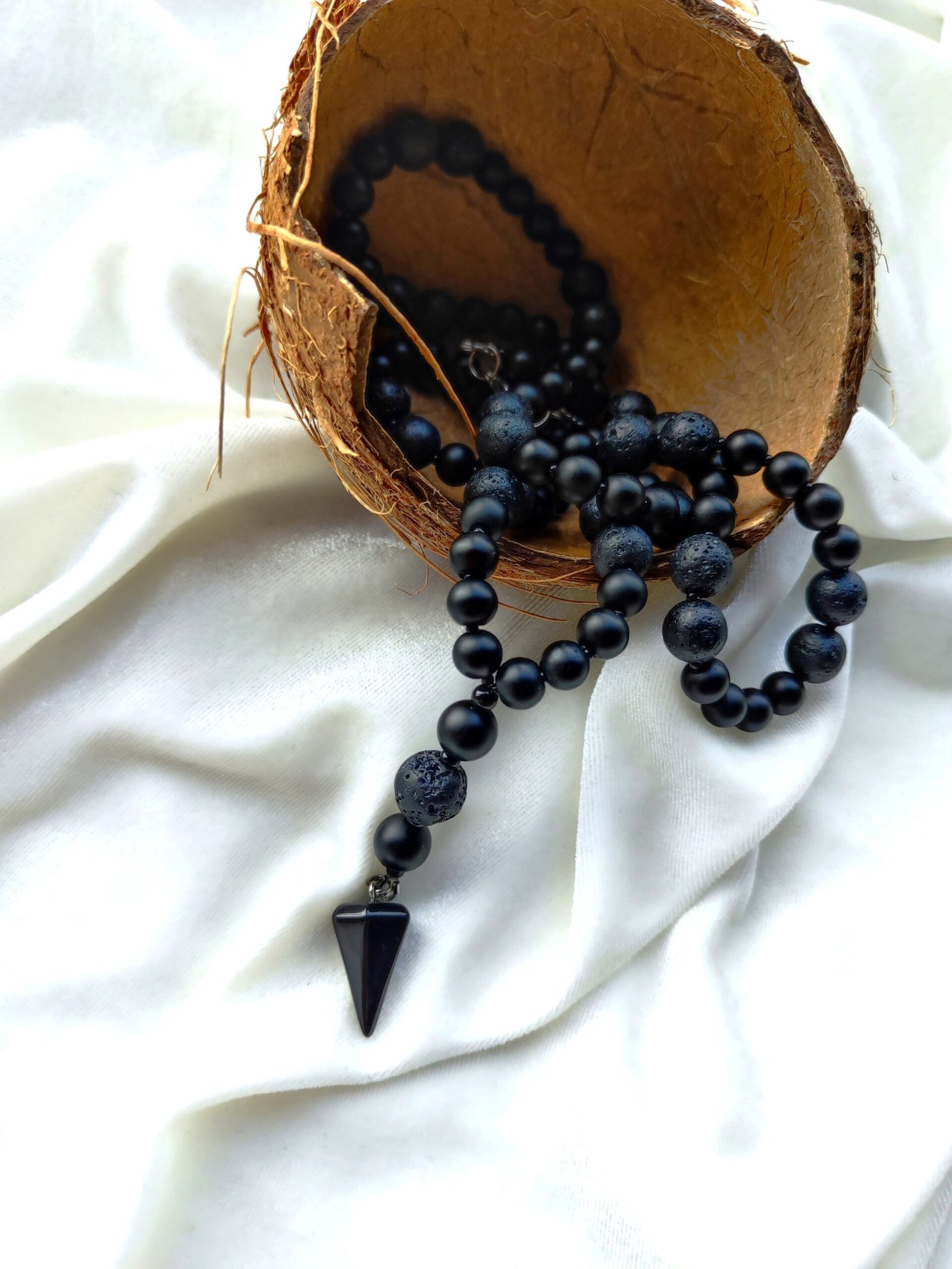 Šis rankų darbo vyriškas vėrinys gimė iš kontrastų: griežtos formos ir minkštos tėkmės, svorio ir lengvumo, žemės ir šviesos. Jis tarsi primena rožančių, tačiau čia viskas kalba kiek kitaip – santūriau, šiuolaikiškiau, be išorinio ritualo, bet su vidine kryptimi.