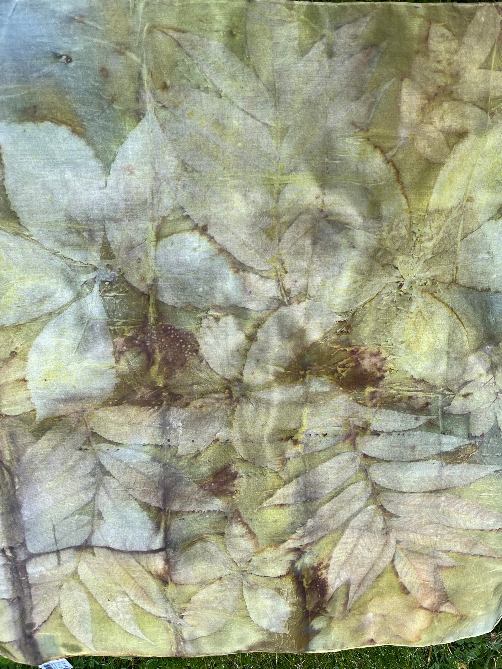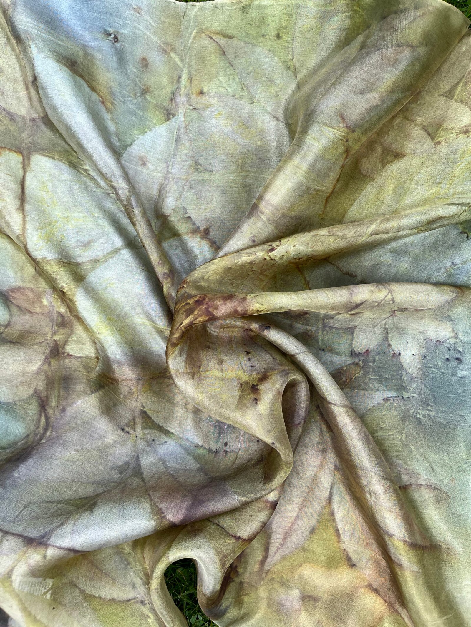 Natūralaus šilko skarelė, tapyta panaudojant tikrus augalus, kurie ant šilko palieka savo atspaudus. Vienetinis gaminys, nes tokių pačių raštų, spalvų išgauti nebeįmanoma. Rausvų, gelsvų ir rusvų tonų žaismas, kartu su natūraliais lapų ir paparčių raštais, sukuria šiltą, gamtos įkvėptą akcentą. Kaklaskarė iš plonyčio, lengvai perregimo gryno šilko – tikras elegancijos aksesuaras, subtilus ir išskirtinis aprangos akcentas! Dvipusis dėvėjimas.