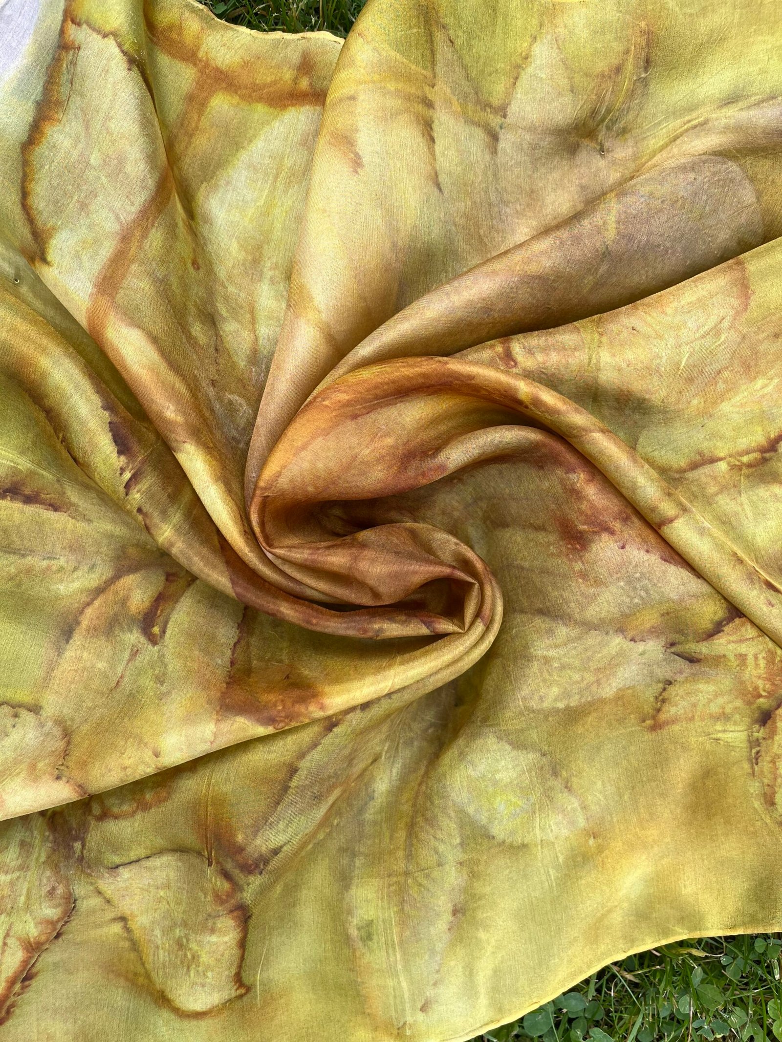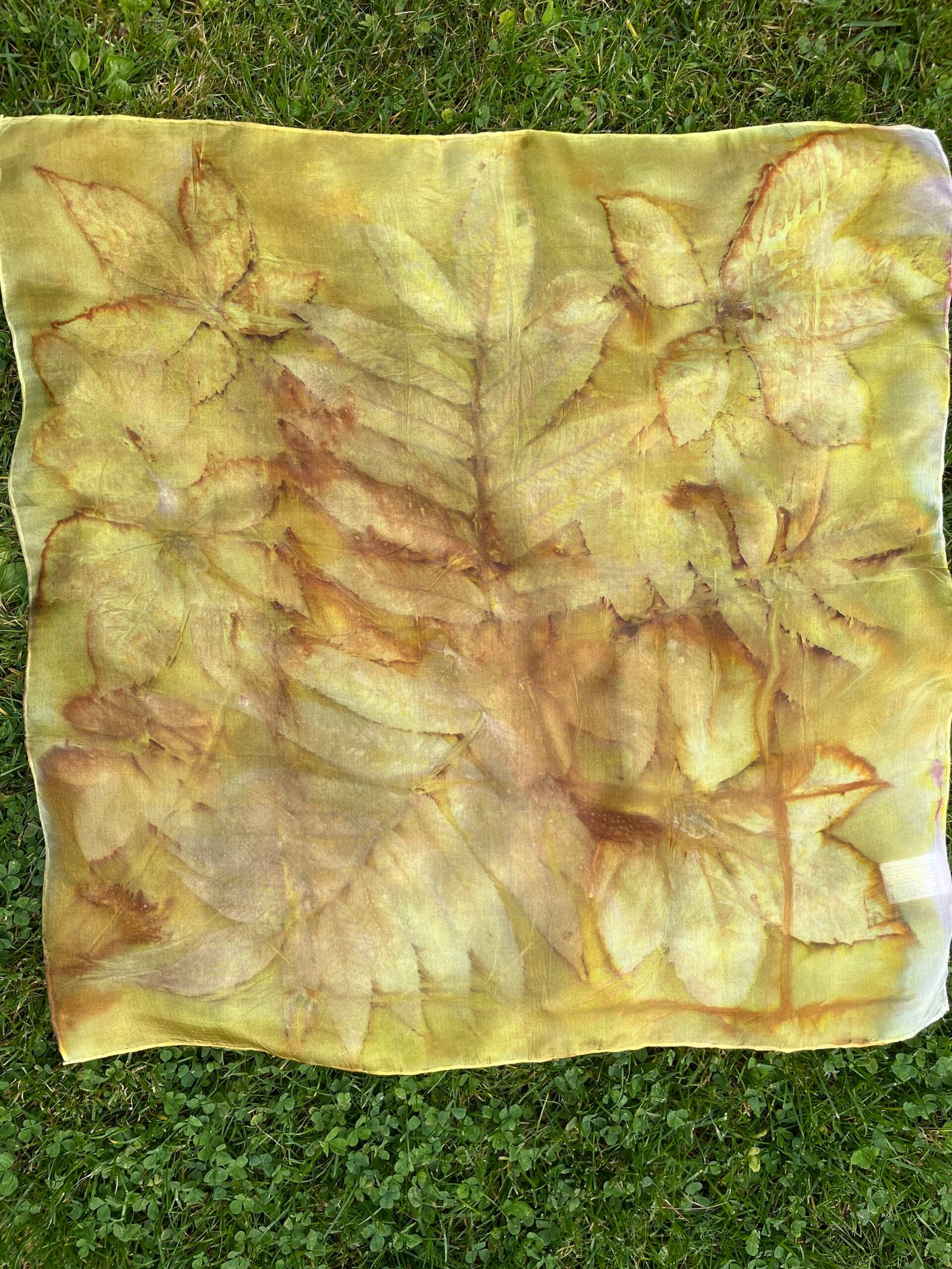 Natūralaus šilko skarelė, tapyta panaudojant tikrus augalus, kurie ant šilko palieka savo atspaudus. Vienetinis gaminys, nes tokių pačių raštų, spalvų išgauti nebeįmanoma. Rausvų, gelsvų ir rusvų tonų žaismas, kartu su natūraliais lapų ir paparčių raštais, sukuria šiltą, gamtos įkvėptą akcentą. Kaklaskarė iš plonyčio, lengvai perregimo gryno šilko – tikras elegancijos aksesuaras, subtilus ir išskirtinis aprangos akcentas! Dvipusis dėvėjimas.