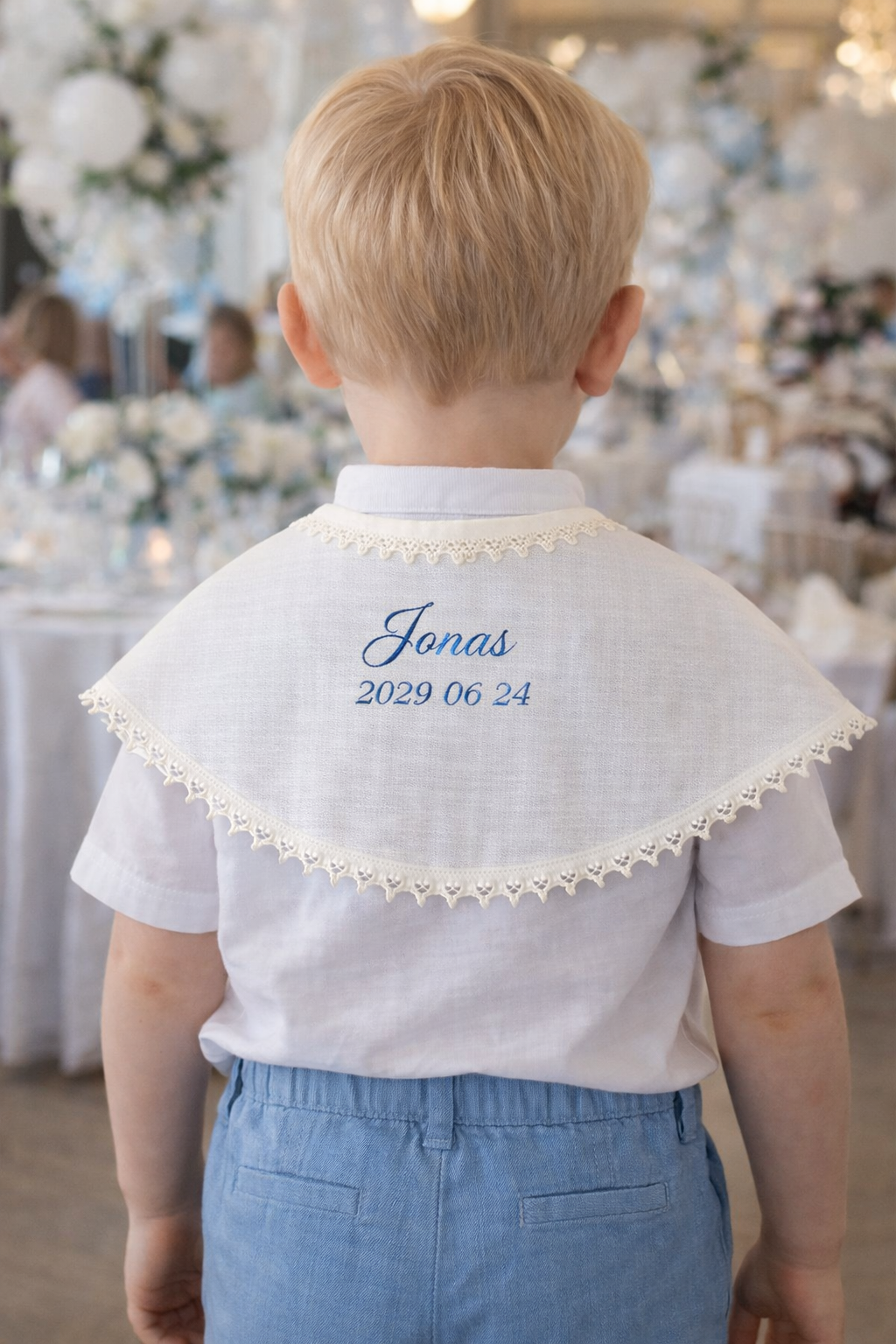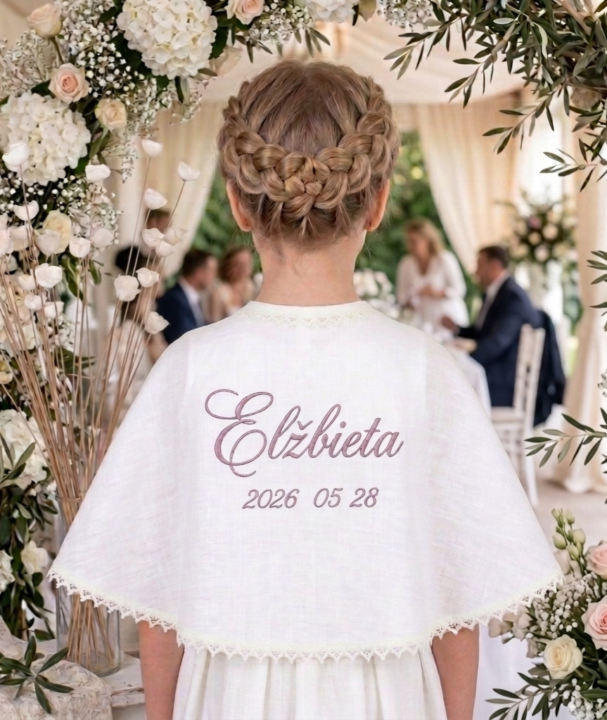 Kad ši krikšto skraistė taptų dar ypatingesnė, siūlome ją personalizuoti – nugaroje išsiuvinėti vaiko vardą ir Krikšto datą. Personalizuotas siuvinėjimas paverčia šį Krikšto aksesuarą brangiu prisiminimu, kuris dažnai saugomas daugelį metų kaip šeimos relikvija.