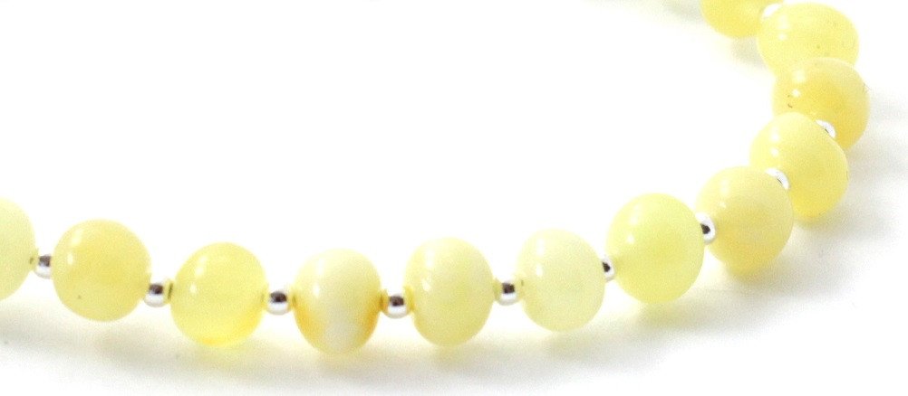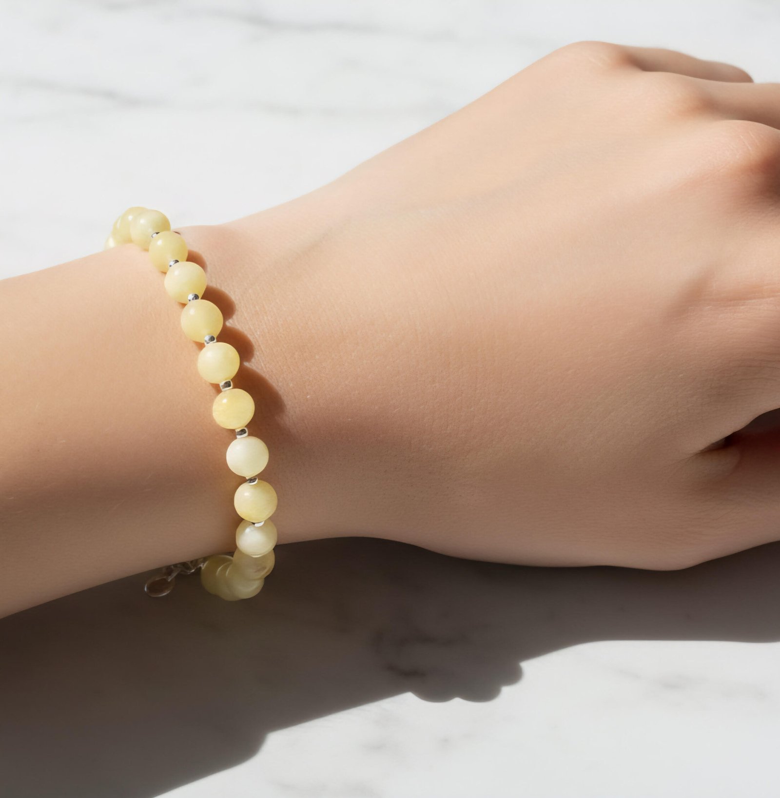Subtili ir elegantiška rankų darbo apyrankė, pagaminta iš natūralaus Baltijos gintaro. Šviesios spalvos poliruoti gintarai suteikia papuošalui šilumos ir išskirtinumo, o smulkūs sidabro karoliukai subtiliai pabrėžia gintaro grožį. Tai lengvas, kasdienai ir progoms tinkantis papuošalas, puikiai derantis tiek prie klasikinio, tiek prie modernaus stiliaus.