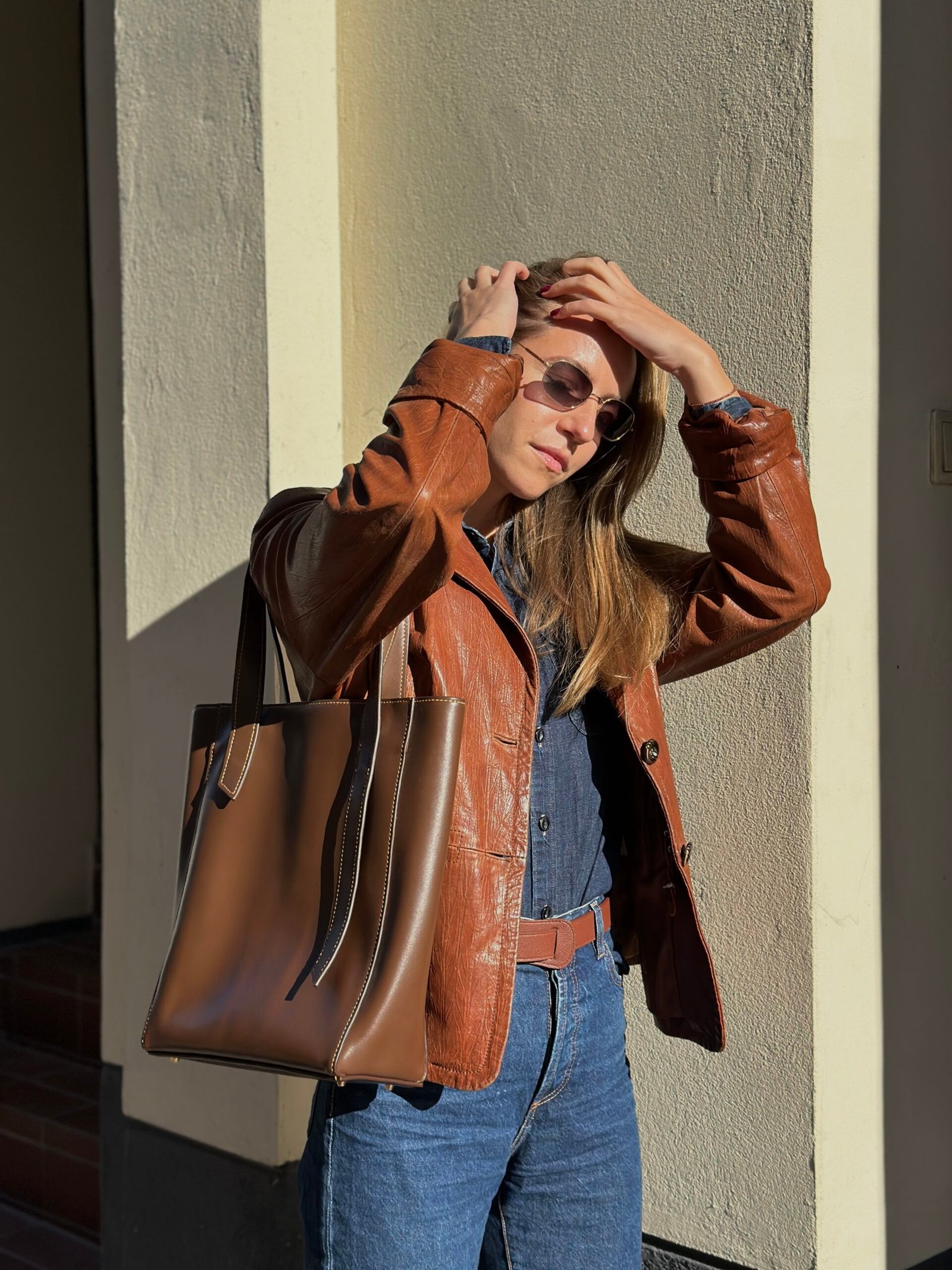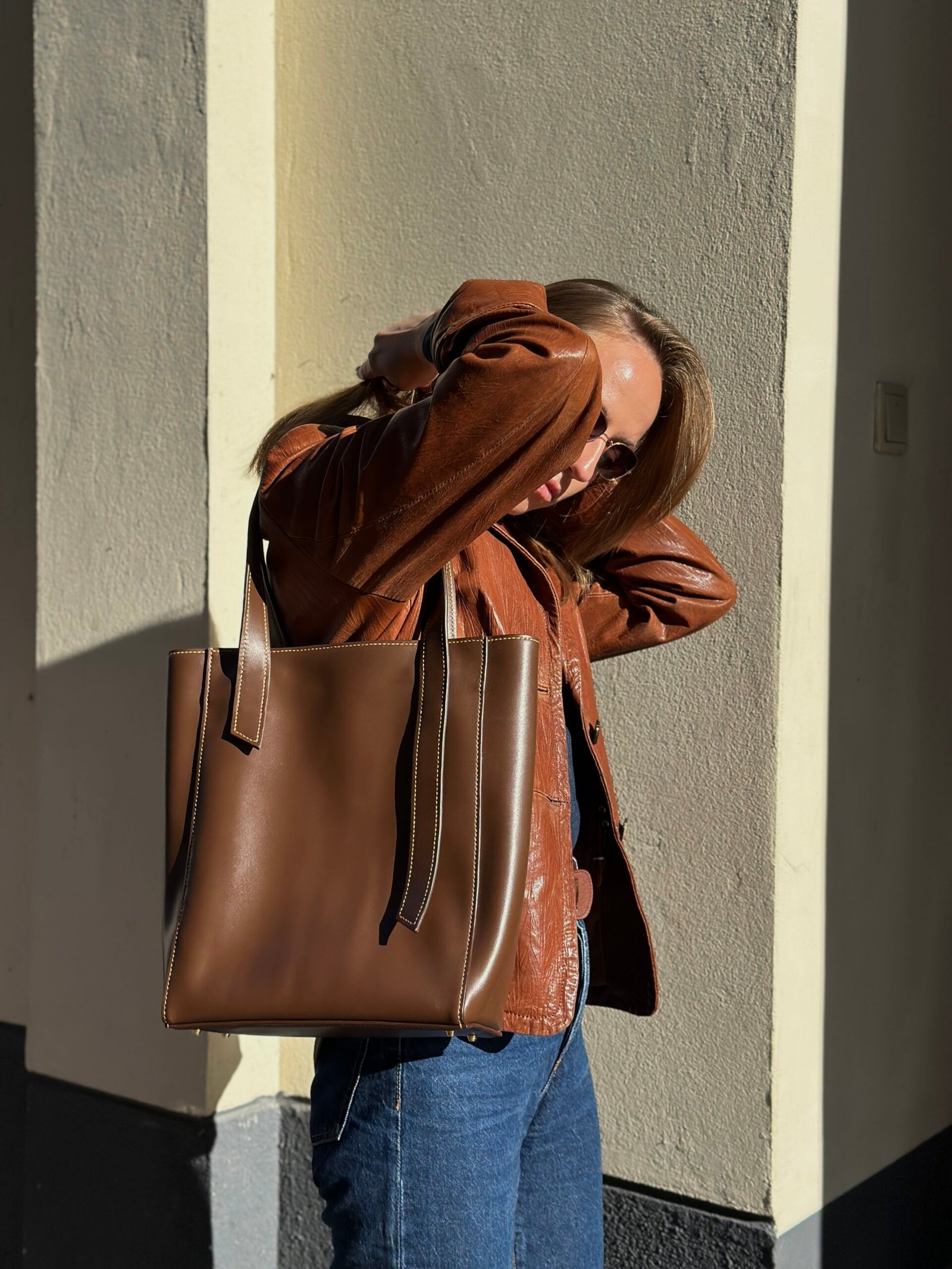 Didelė, talpi, stilinga, rankomis siuvama moteriška rankinė iš natūralios odos su ilgomis rankenomis. Tai aukščiausios klasės aksesuaras, kuriame dera nepriekaištinga kokybė, išskirtinis meistriškumas ir amžinas stilius.