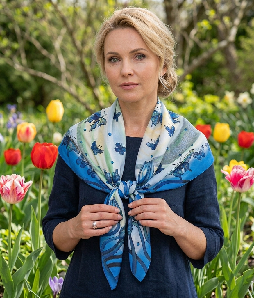 Skara iš natūralaus šilko, šiek tiek storesnio krepdešino audinio. Tai – rankų darbo tapytas aksesuaras, kuriame tulpių apsuptyje skrajoja drugeliai. Lengvo plazdėjimo suteiks jų sparnai bei natūralaus šilko savybės. Skara ištapyta garinamais, šilkui skirtais dažais, kurie neapsunkina audinio ir suteikia jam lengvą žvilgesį. Šilko kraštai apsiūti rankomis.