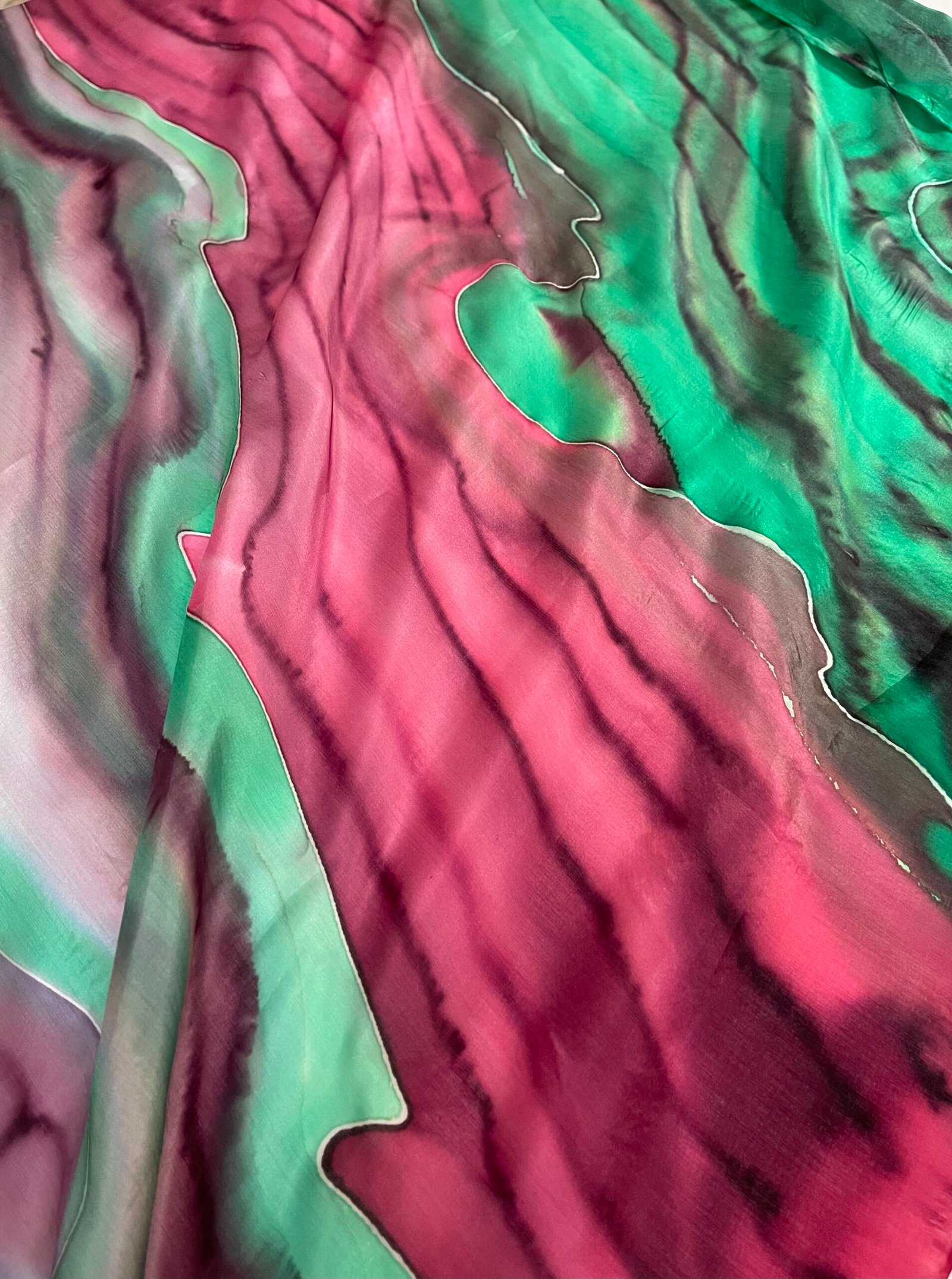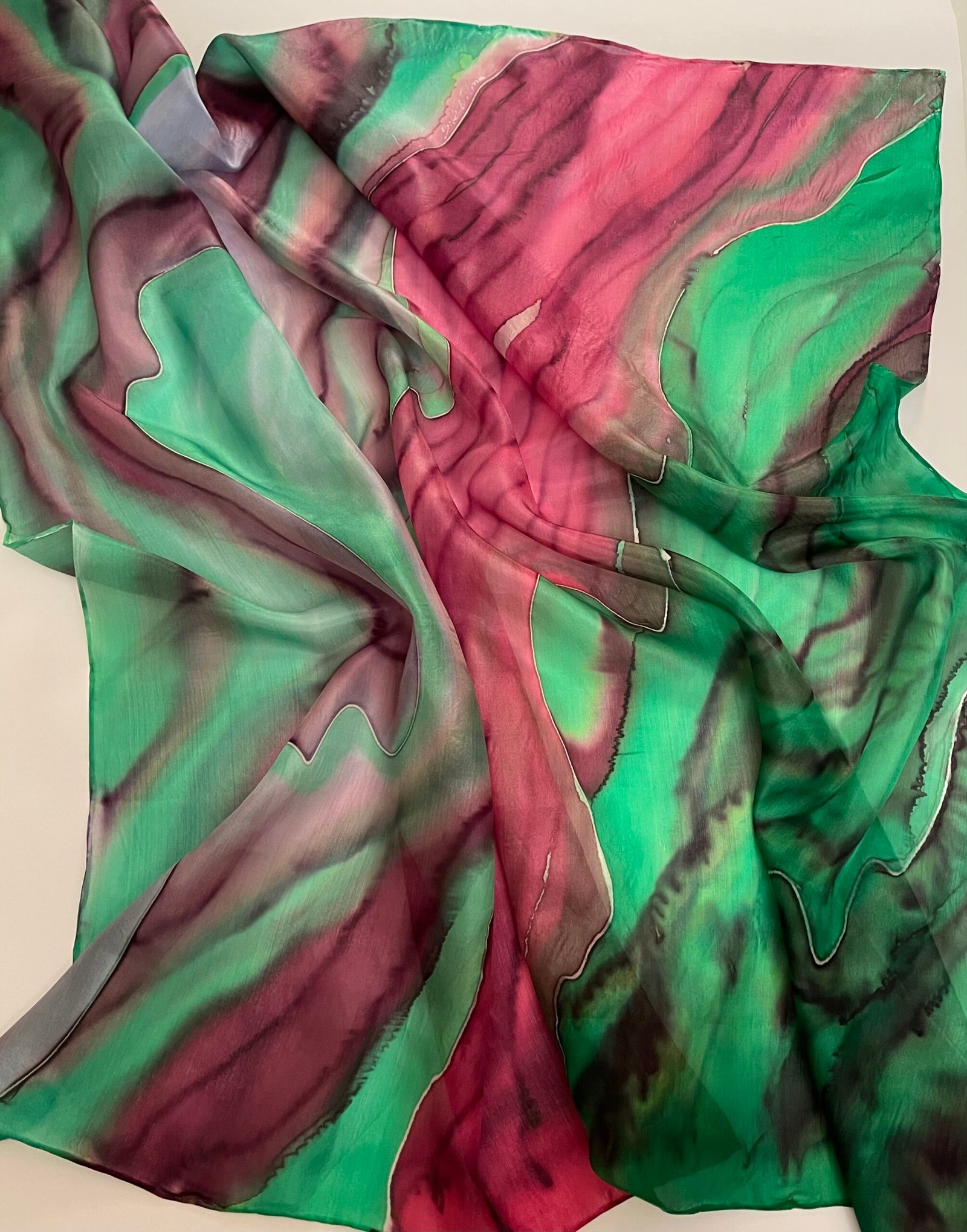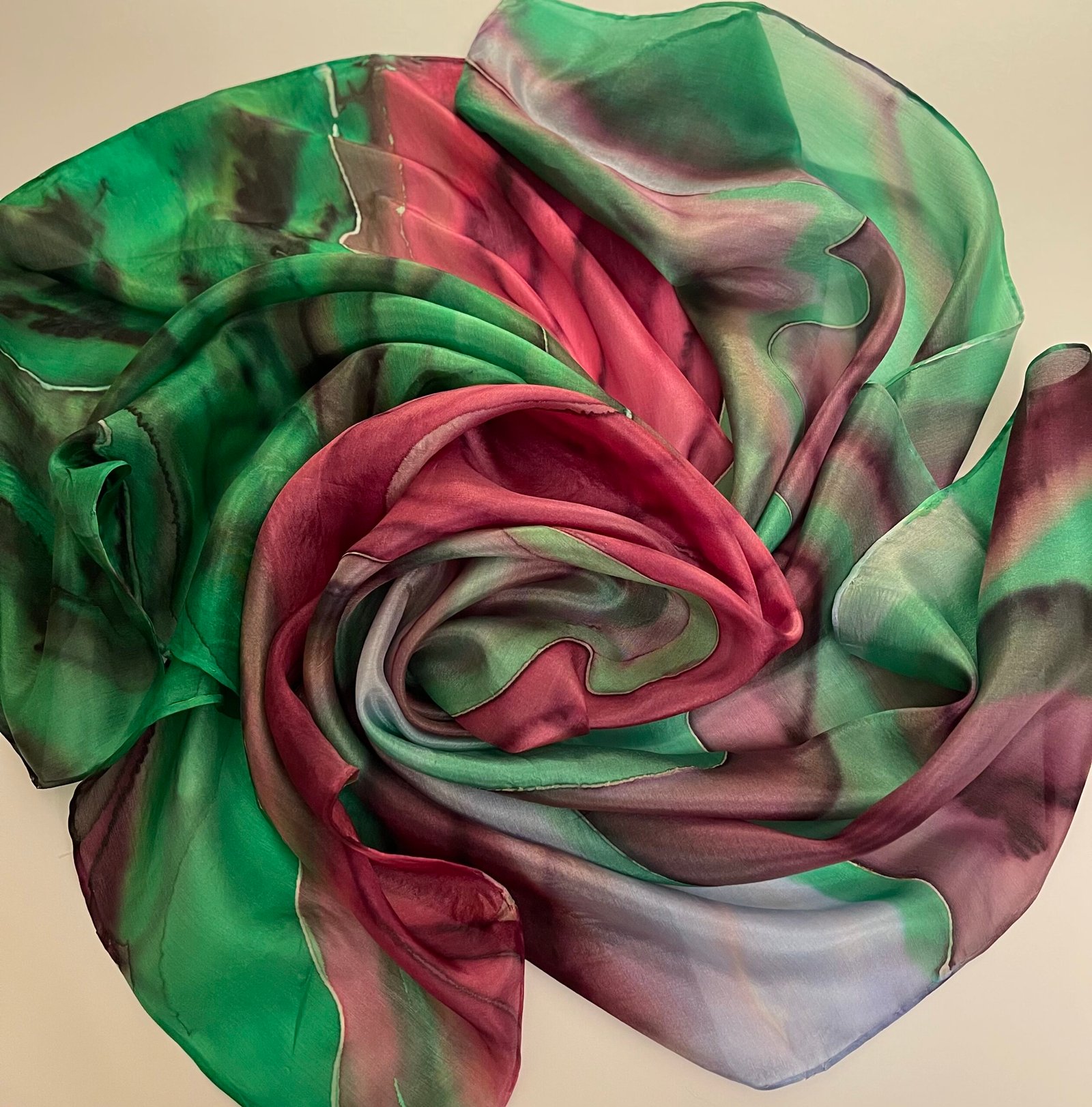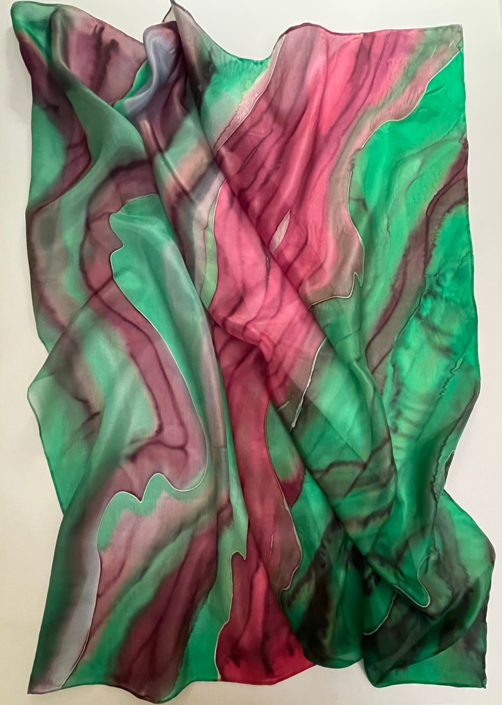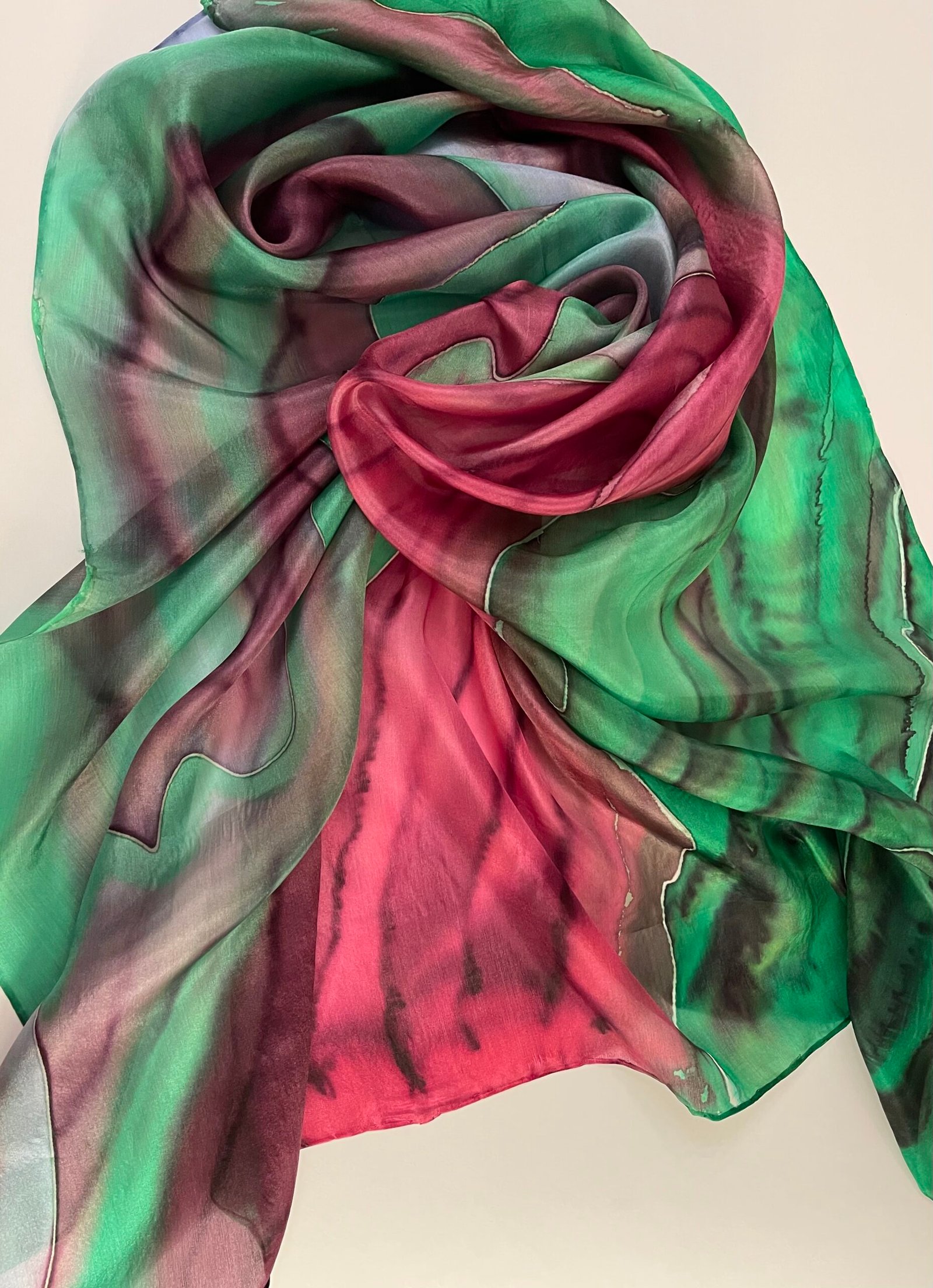 Ryški ir žaisminga natūralaus šilko skara, tapyta sodria smaragdine bei burgundiško vyno spalvomis, kurios persipindamos, tartum konkuruoja – tai išsiskiria, tai susilieja. Vienetinė, nepakartojama, stilinga, minkšta, švelni, iš abiejų pusių vienodai ryški šilkinė skara.