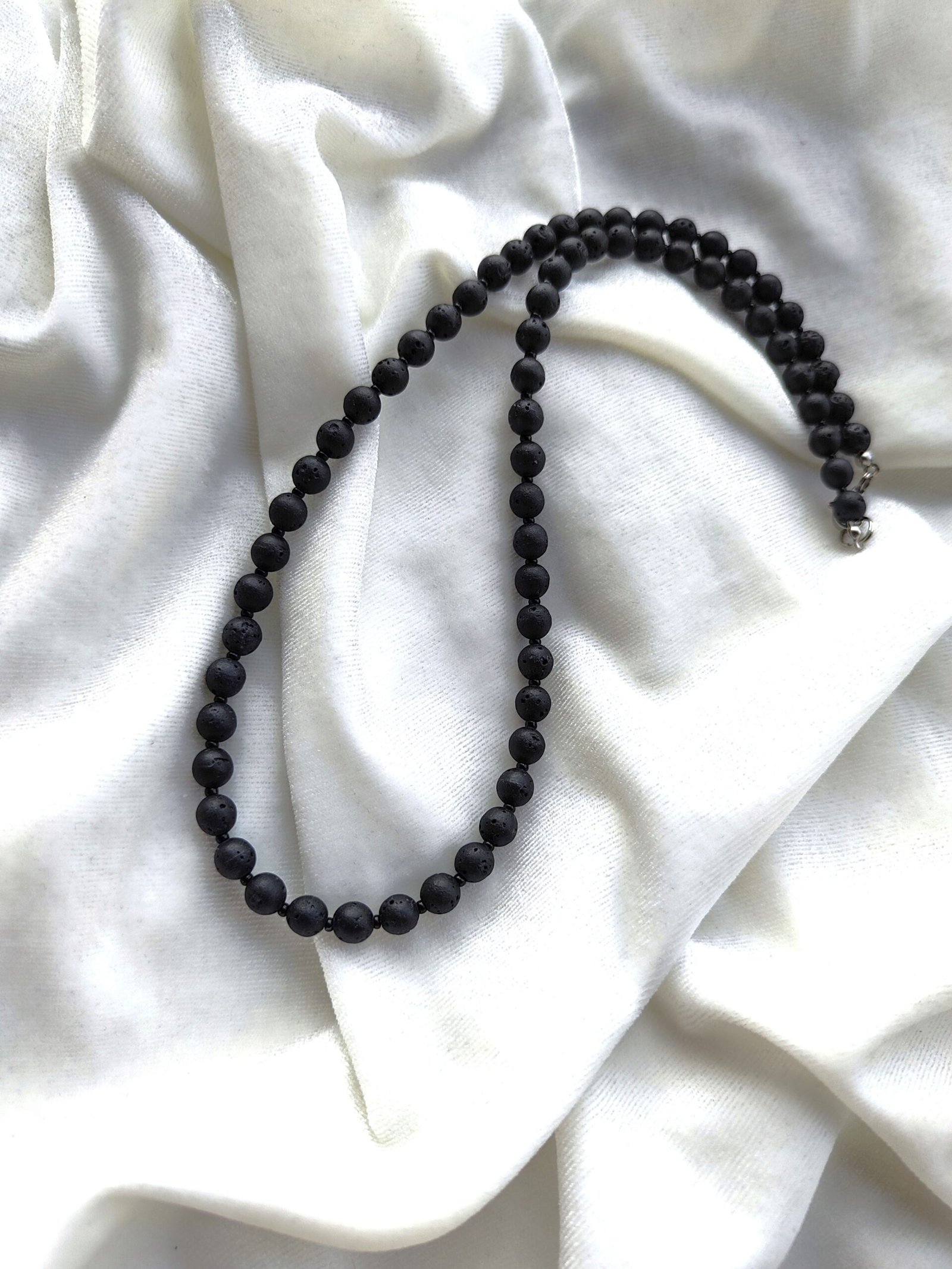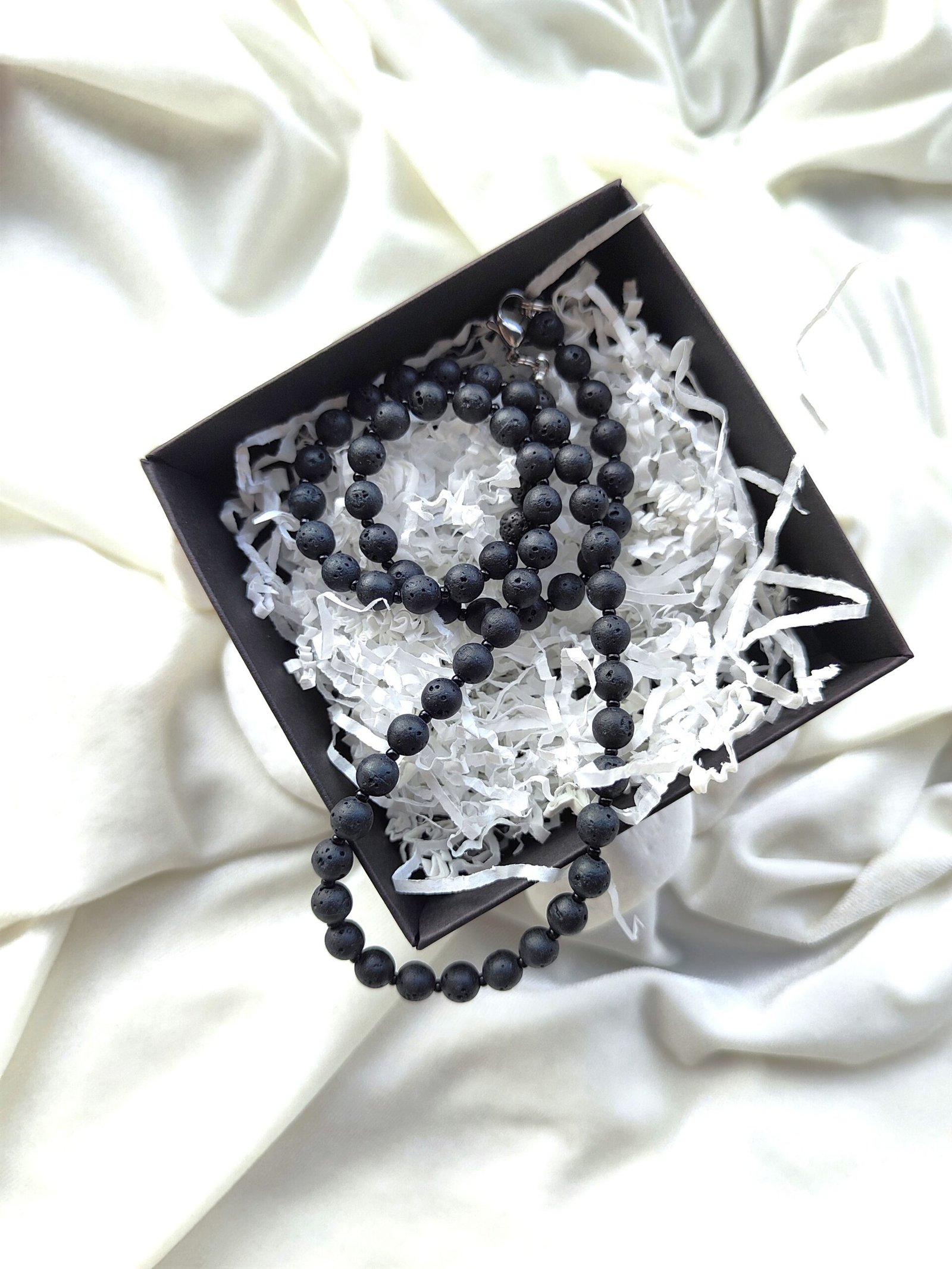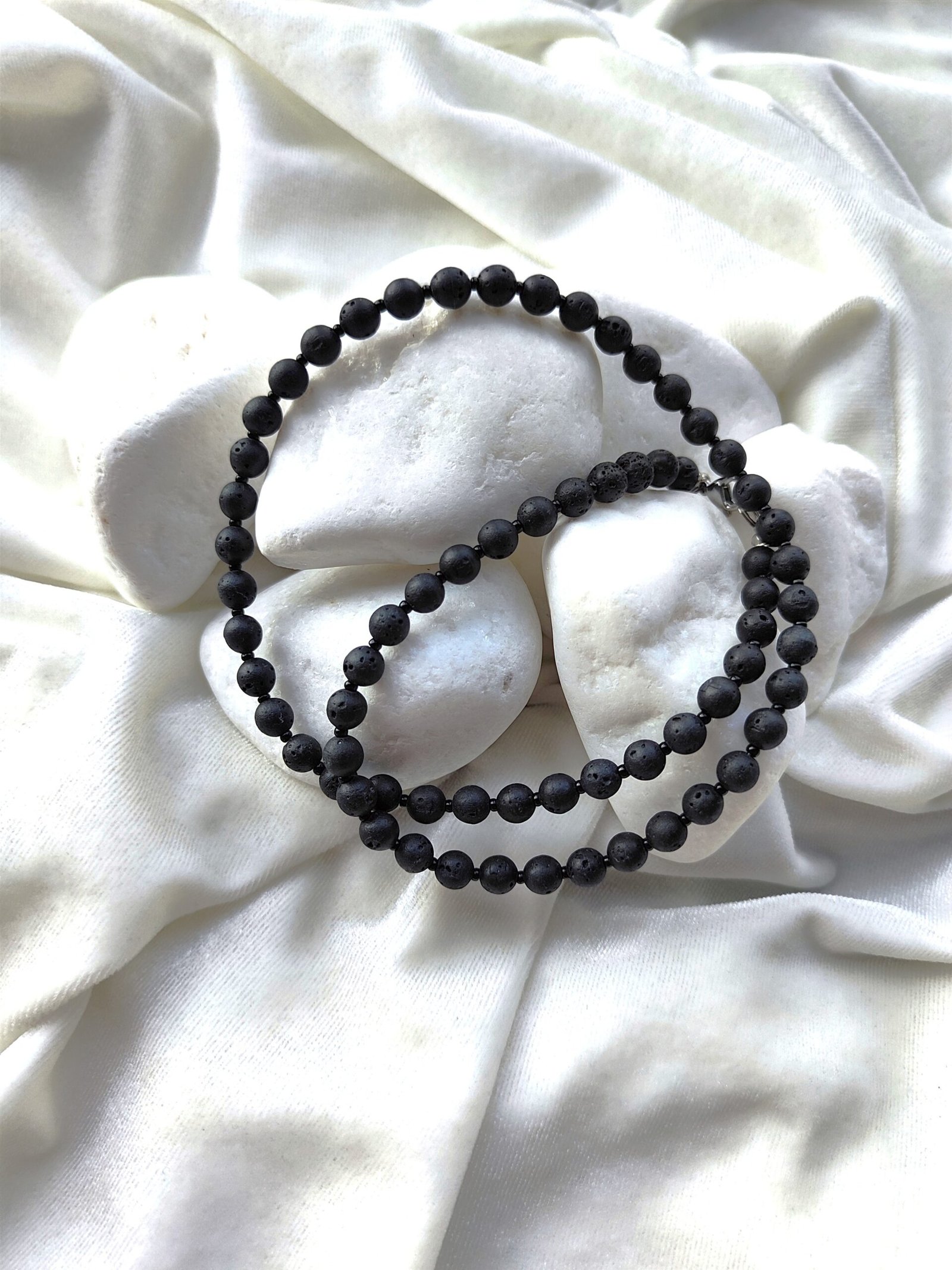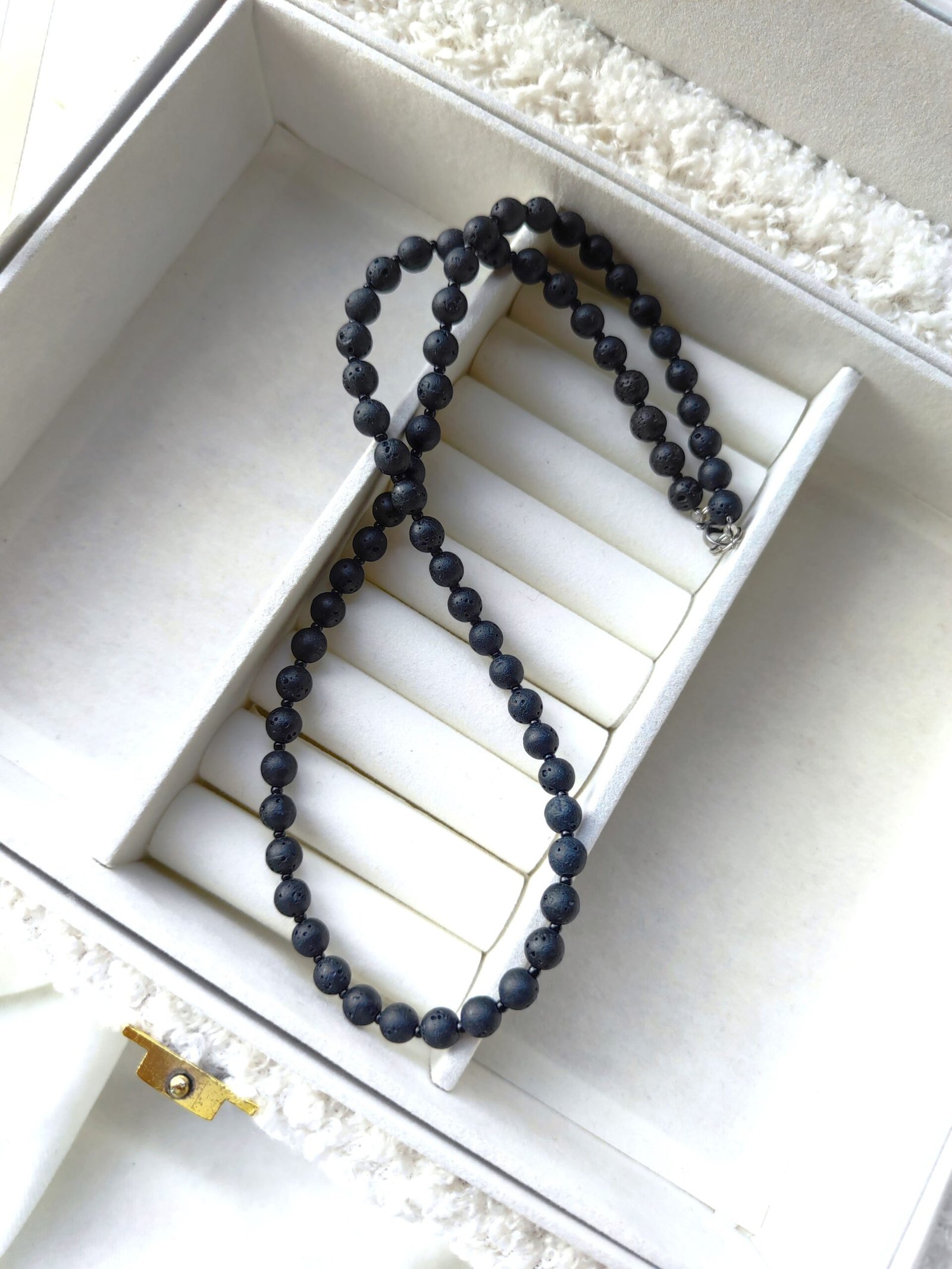 Šis rankų darbo vyriškas vėrinys iš 6 mm lavos akmenukai, kurie yra grubūs, tarsi neapdorota energija, suteikiantys papuošalui struktūrą. Natūralūs lavos akmenys suteikia jam žemiško charakterio – kiekvienas jų porėtas, nelygus, lyg nugludintas laiko. O čekiško stiklo intarpai subtiliai pagauna šviesą, vos pastebimai ją sujudindami, lyg mintį, kuri ateina netikėtai.