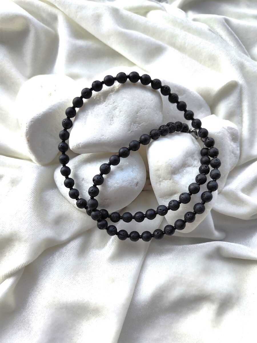 Šis rankų darbo vyriškas vėrinys iš 6 mm lavos akmenukų, kurie yra grubūs, tarsi neapdorota energija, suteikiantys papuošalui struktūrą. Natūralūs lavos akmenys suteikia jam žemiško charakterio – kiekvienas jų porėtas, nelygus, lyg nugludintas laiko. O čekiško stiklo intarpai subtiliai pagauna šviesą, vos pastebimai ją sujudindami, lyg mintį, kuri ateina netikėtai.