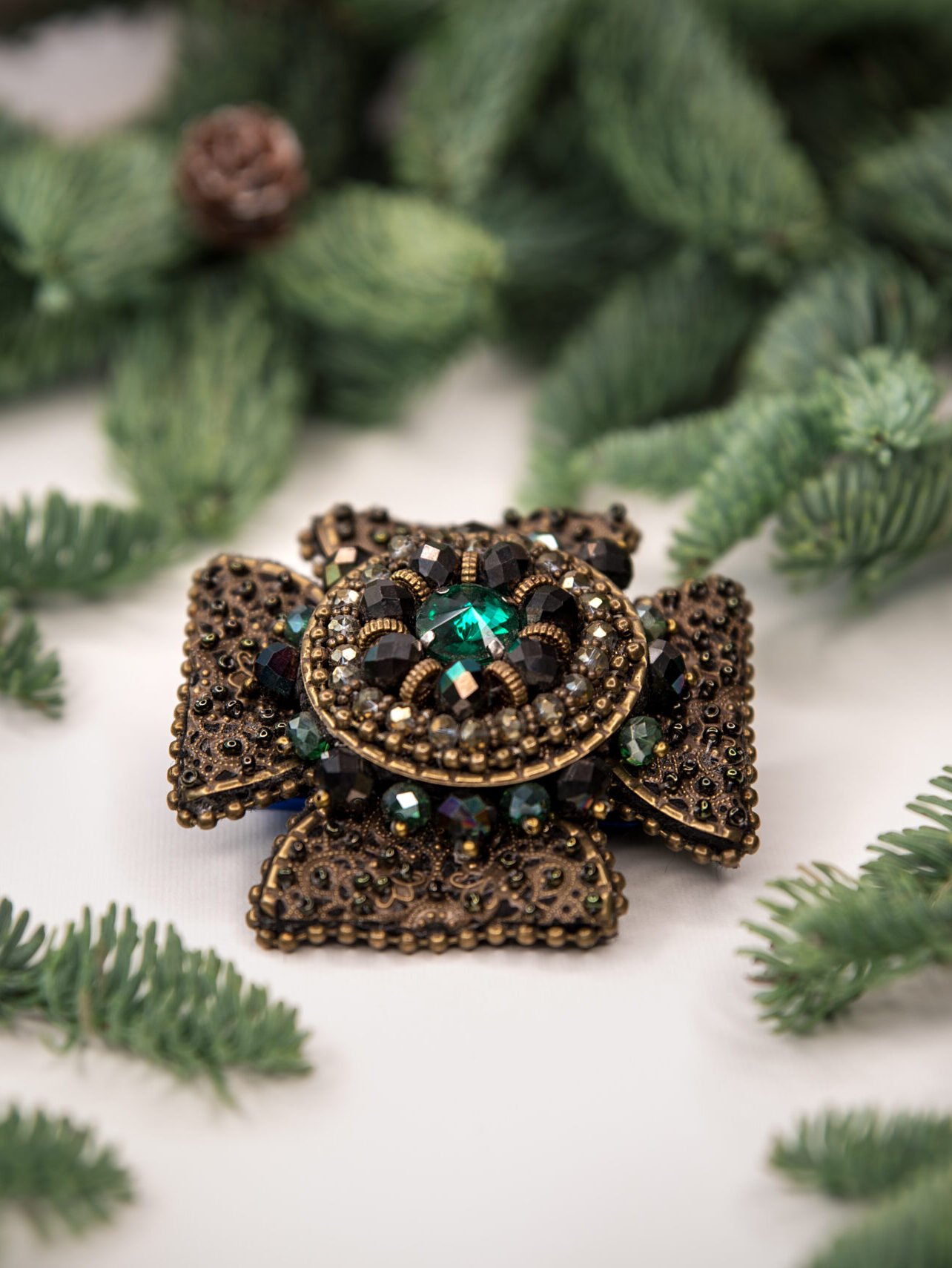 Rankų darbo sagė atlikta pagal autorinę techniką. Medžiagos: metalinės plokštelės, čekiškas stiklas, akmuo hematitas, spalvotas biseris, žalvario spalvos detalės.