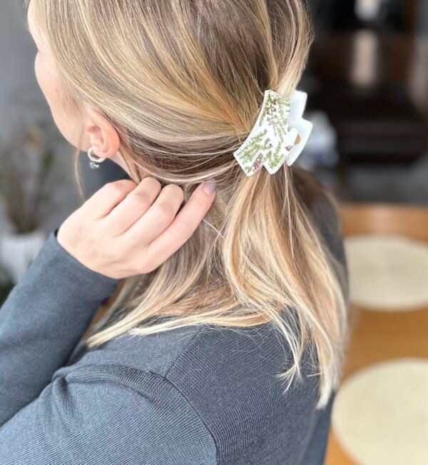 Šie originalūs rankų darbo segtukai plaukams gaminami iš juvelyrinės dervos, yra itin lengvi, nedūžtantys. Ir unikalūs, nes papuošalų gamybai naudojami tik natūralūs augalai: gėlių žiedai, lapeliai, uogos ir kitokios augalų dalelės.