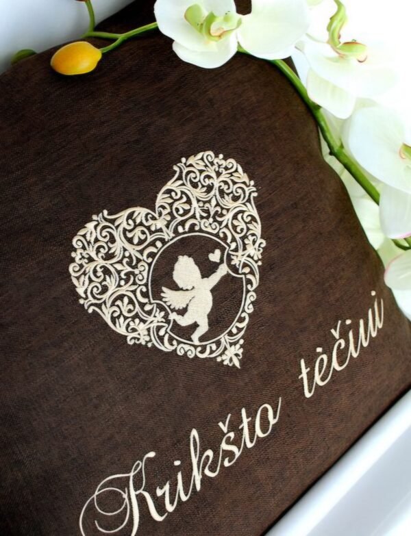 NaujasPasirinkti savybes This product has multiple variants. The options may be chosen on the product page Peržiūra€30.00 – €32.00Price range: €30.00 through €32.00Ši dekoratyvinė pagalvėlė – šiltas ir jaukus būdas padėkoti krikšto mamai ar krikšto tėčiui už jų meilę, rūpestį ir pažadą visada būti šalia. Ant pagalvėlės išsiuvinėjamas Krikšto vaikučio vardas ir Krikštynų data, todėl ji tampa asmeniška, vienetinė ir sauganti ypatingos dienos prisiminimą. Tai dovana, kuri ne tik papuoš namus, bet ir kasdien primins apie mažą žmogų, kurio gyvenime jie užima svarbią vietą. Krikštynos – svarbi diena, kai užsimezga gražus ir prasmingas ryšys tarp vaiko ir jo krikšto tėvelių.